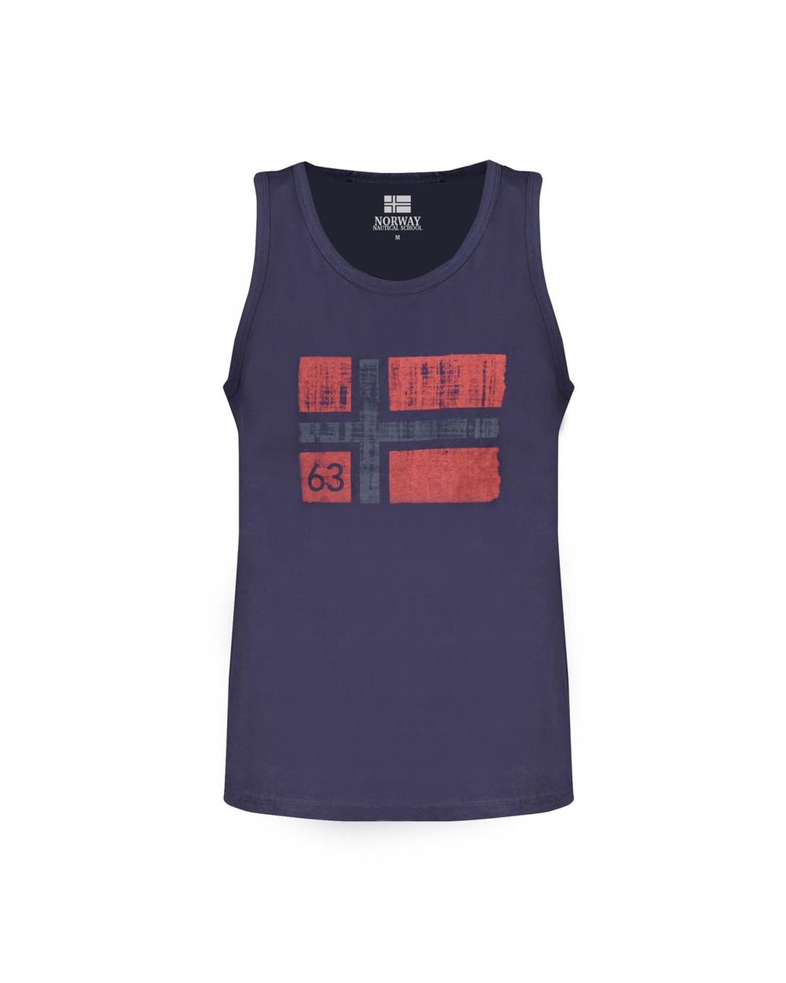 This men’s blue cotton shirt features a tank top style with a comfortable fit and stylish design. It is designed with wide shoulders, a crew neck, and a subtle logo, making it suitable for casual wear.