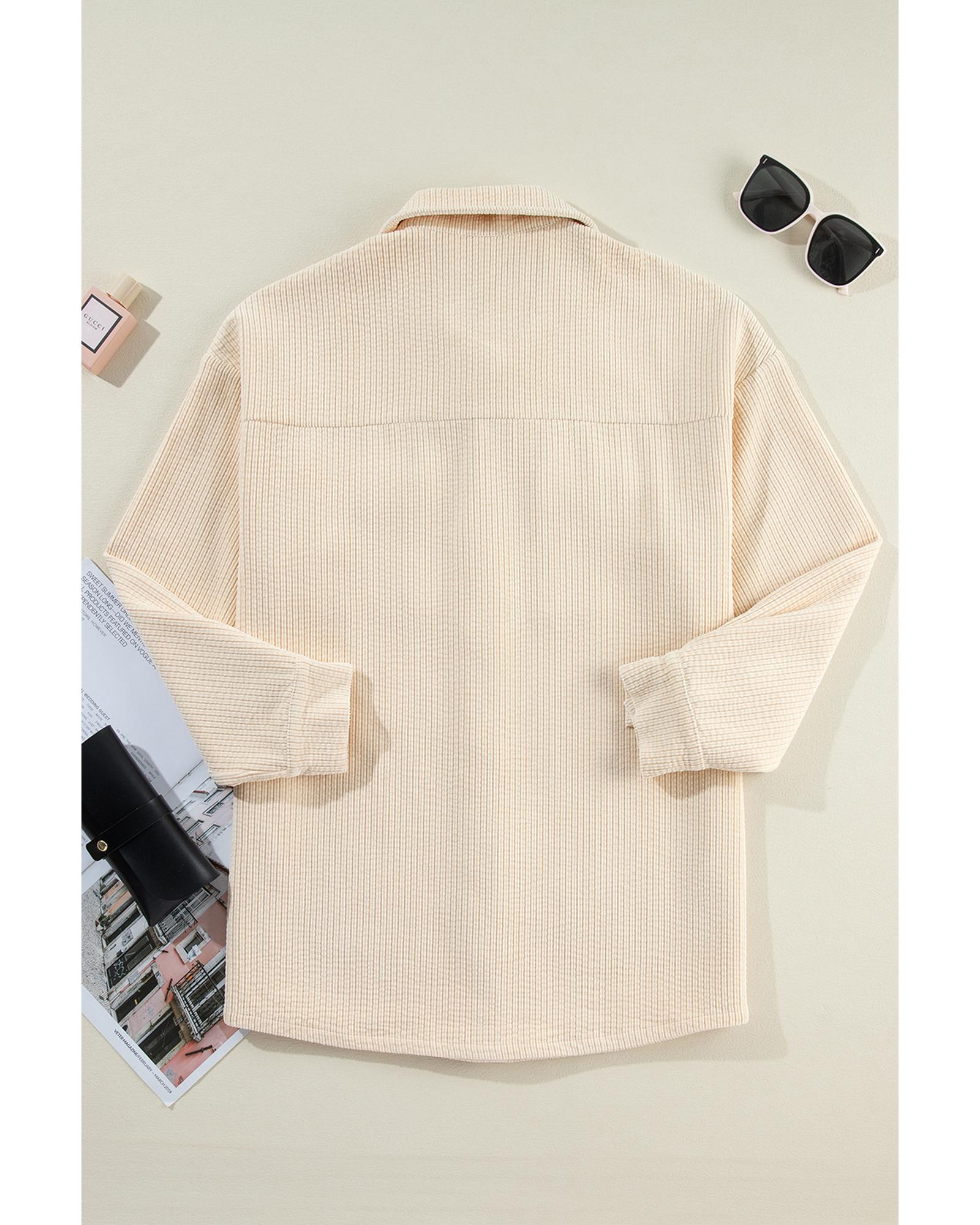 This oatmeal corduroy shacket combines comfort and style with its soft fabric and versatile design. It features functional pockets, a classic button-up closure, and a shirt collar, making it suitable for various casual and semi-formal occasions. Available in a range of sizes, it offers a cozy yet polished look.