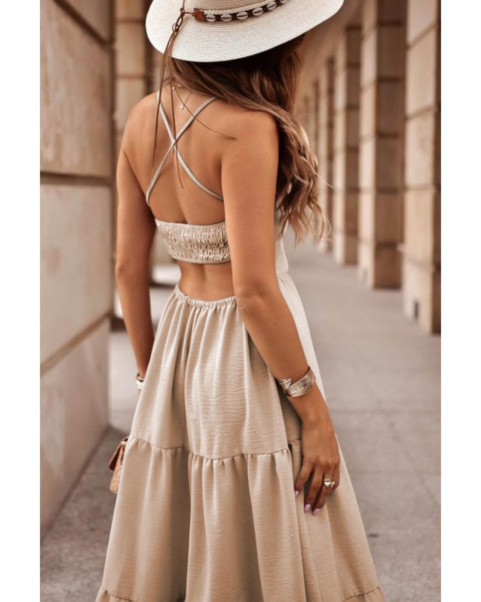 This tiered maxi dress features a stylish crossover backless design, making it an ideal choice for hot summer days. Its fitted silhouette accentuates curves while providing a comfortable and breathable wearing experience. The sleeveless style and flowy tiers create an elegant look suitable for various occasions.