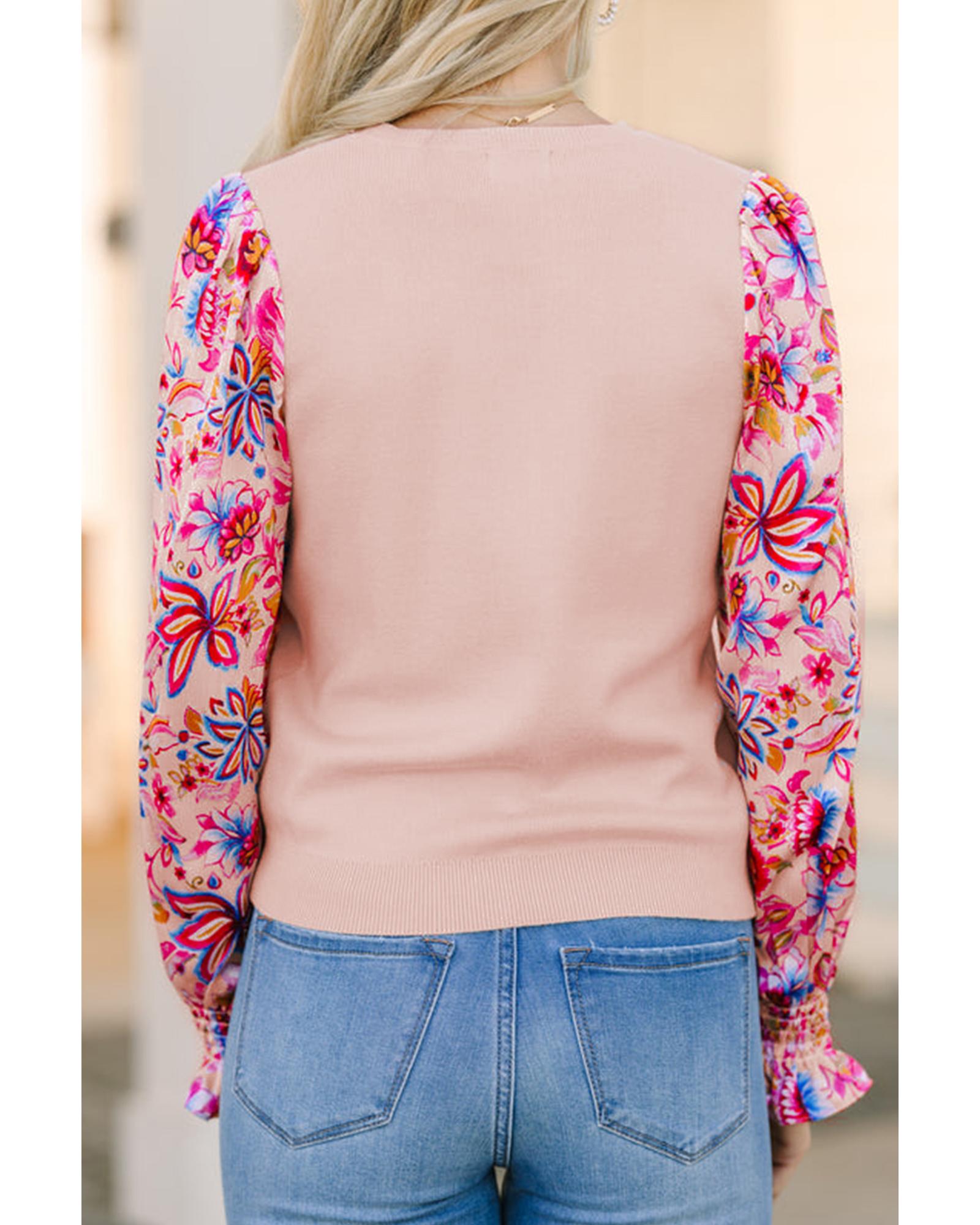 This knitted top features a floral patchwork design on the sleeves and a classic crew neck, offering a versatile and flattering look. Its smocked lantern sleeves and shirred cuffs add trendy details, making it suitable for layering and adding texture to your outfit. The high elasticity ensures a comfortable fit for various body types.