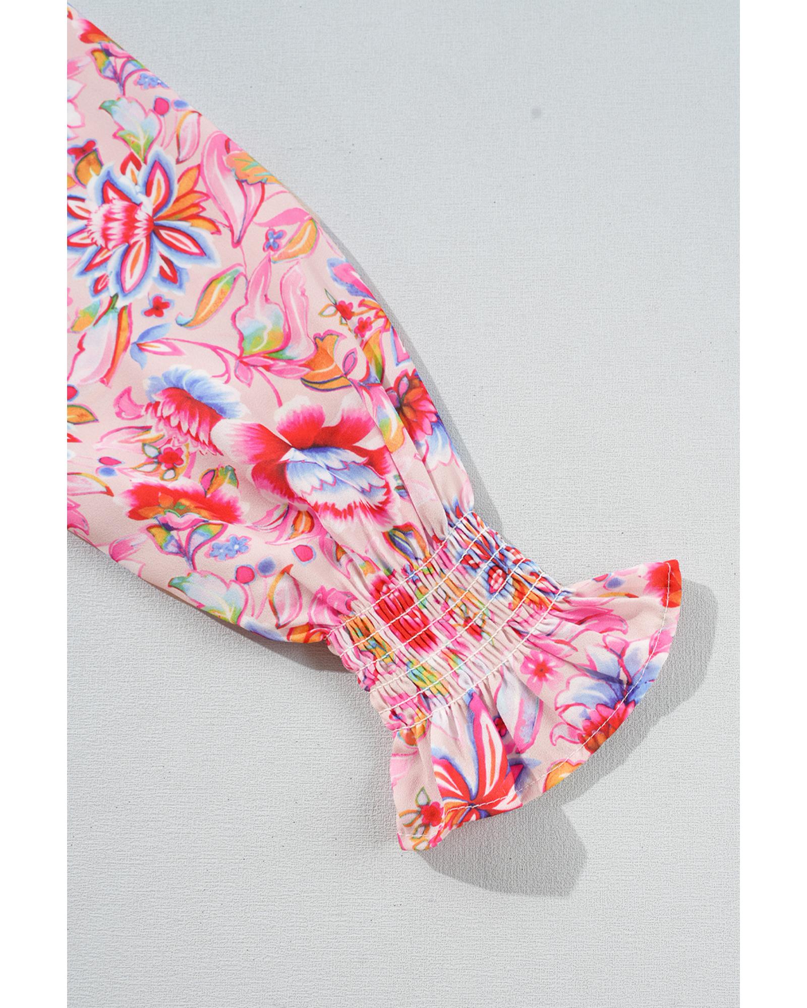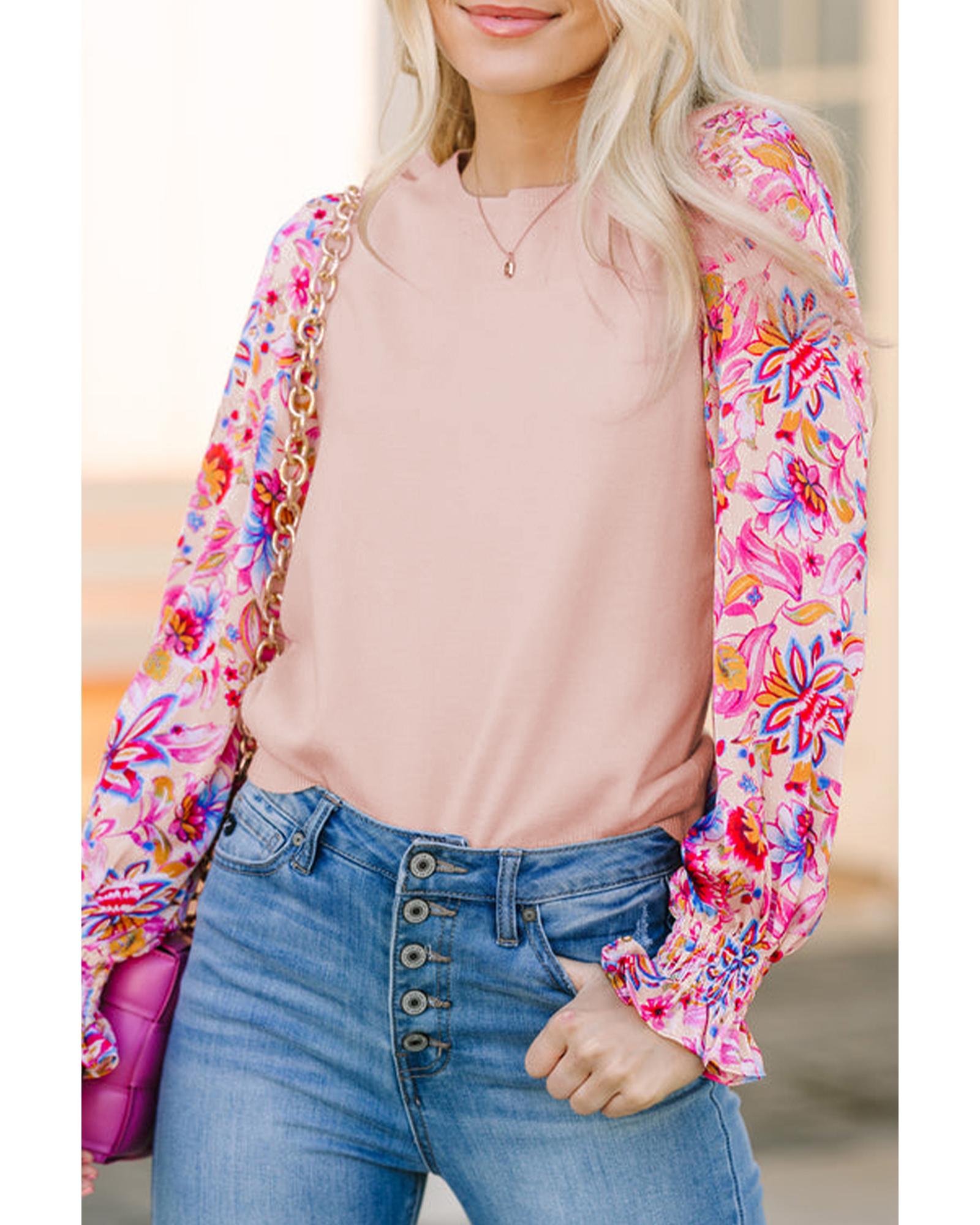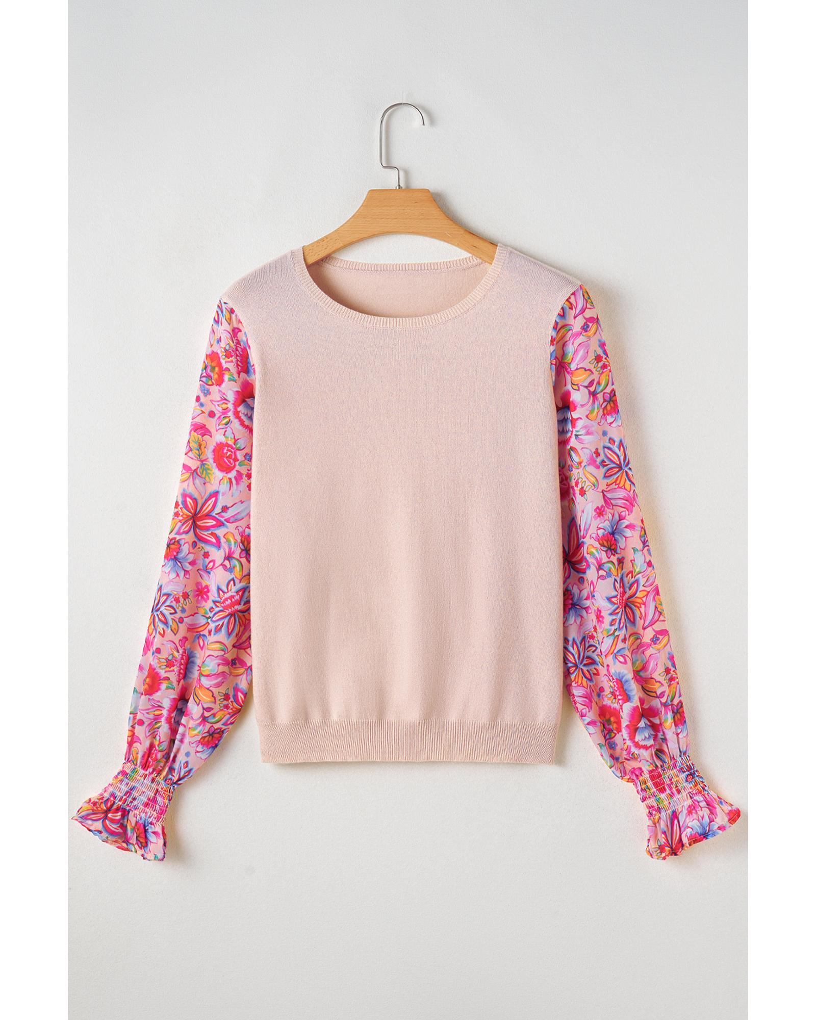 Oatmeal Floral Printed Patchwork Smocked Lantern Sleeve Knit Top – XL