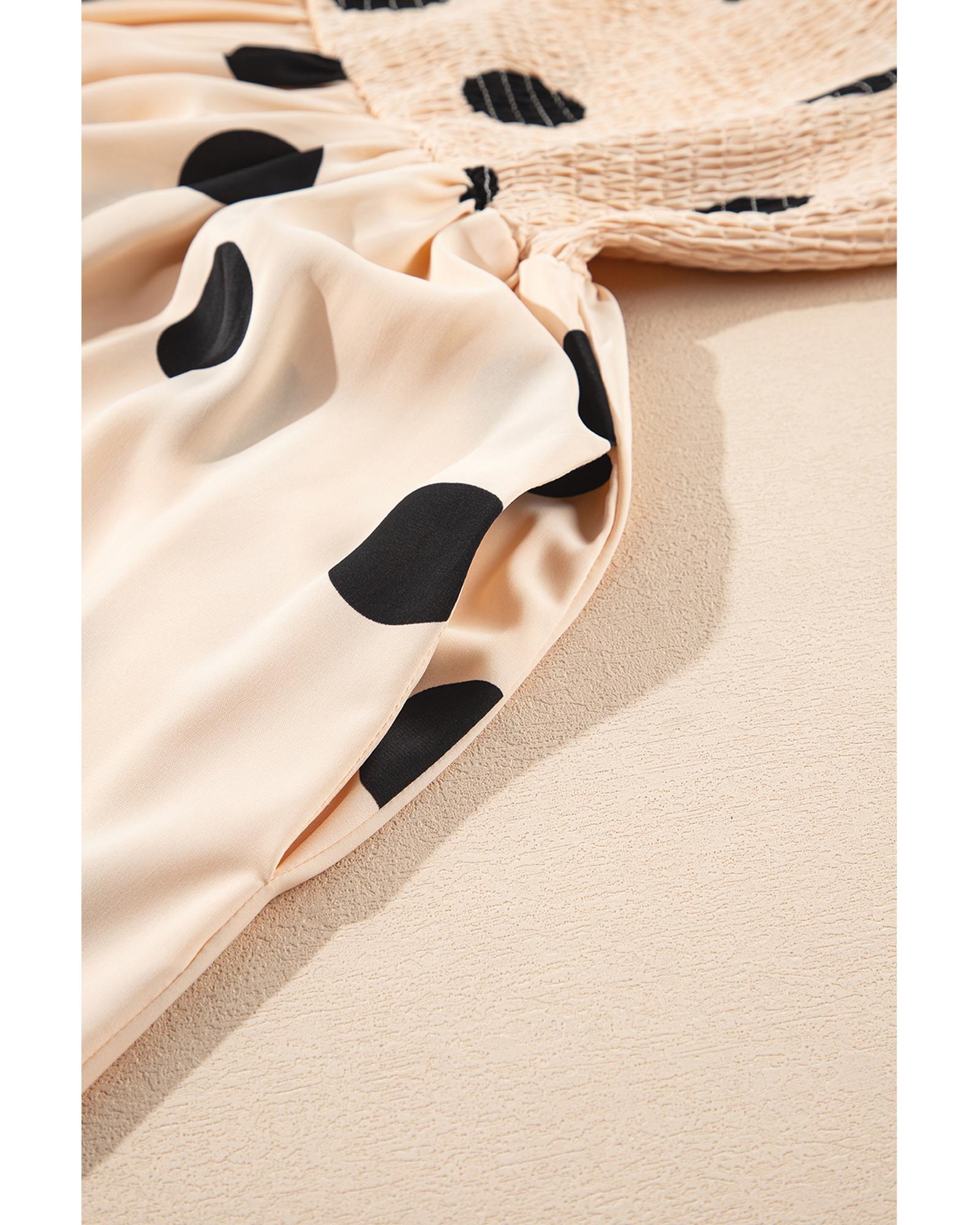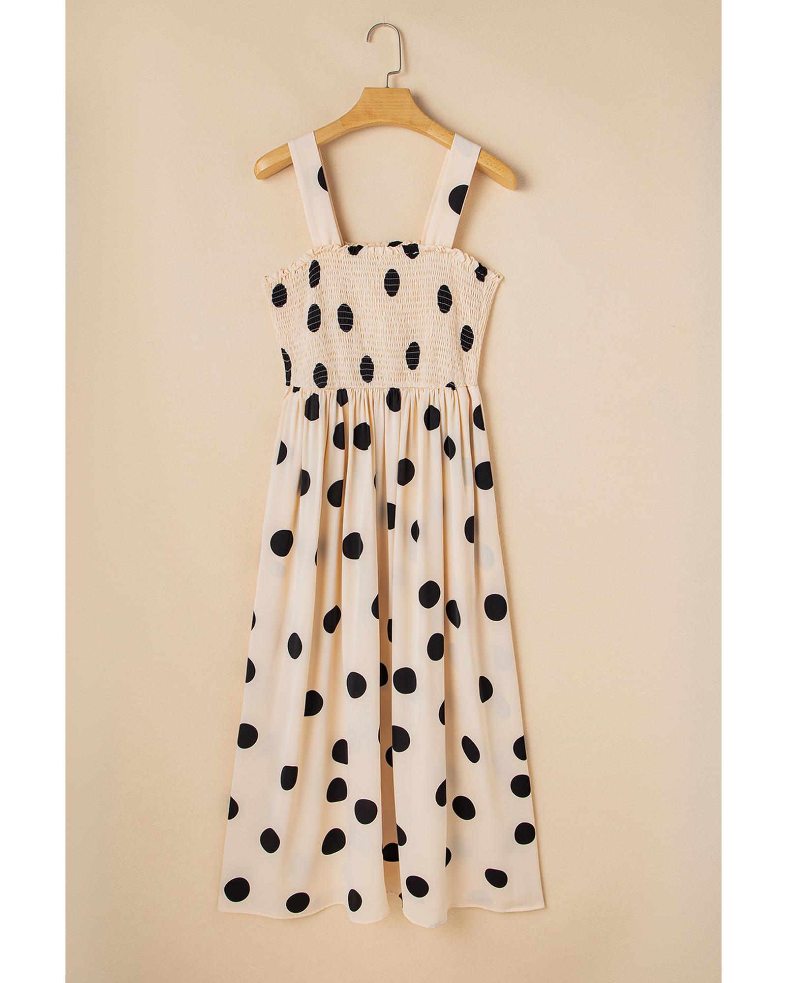 This sleeveless long dress features a charming polka dot pattern and a flattering fit with a smocked bodice. Its high waist design and flowy skirt create an elegant silhouette, making it suitable for various occasions. The dress is designed to be stylish and comfortable, perfect for pairing with accessories and heels.