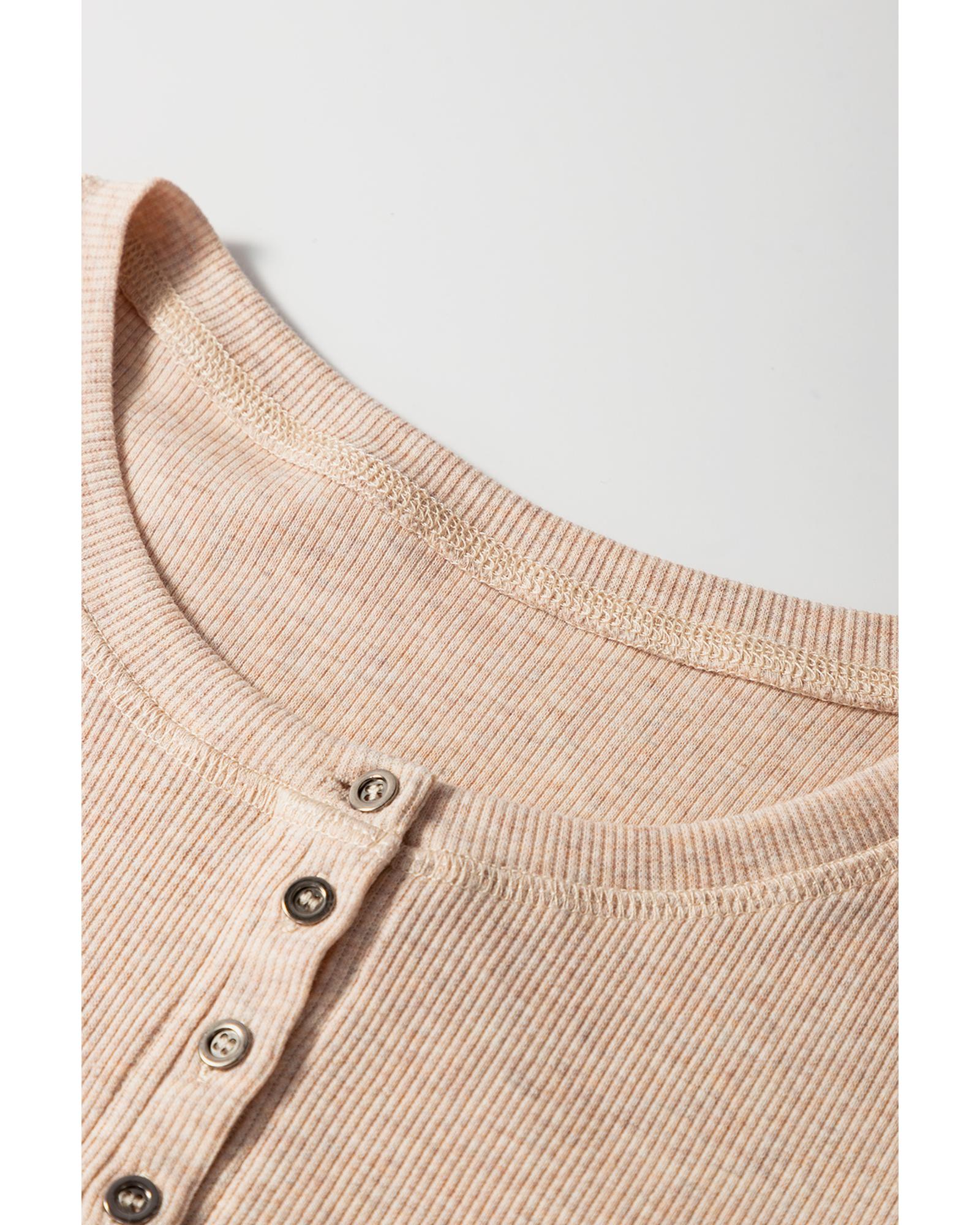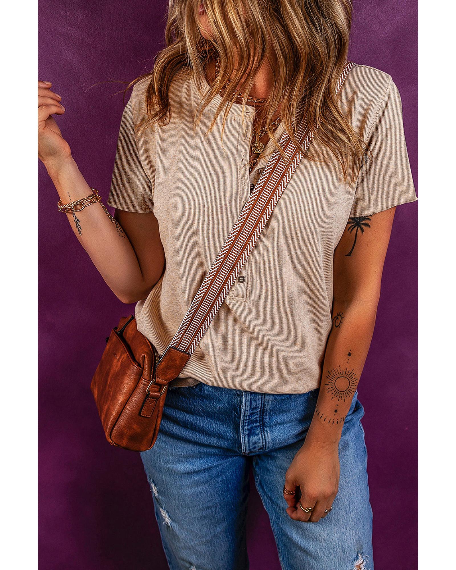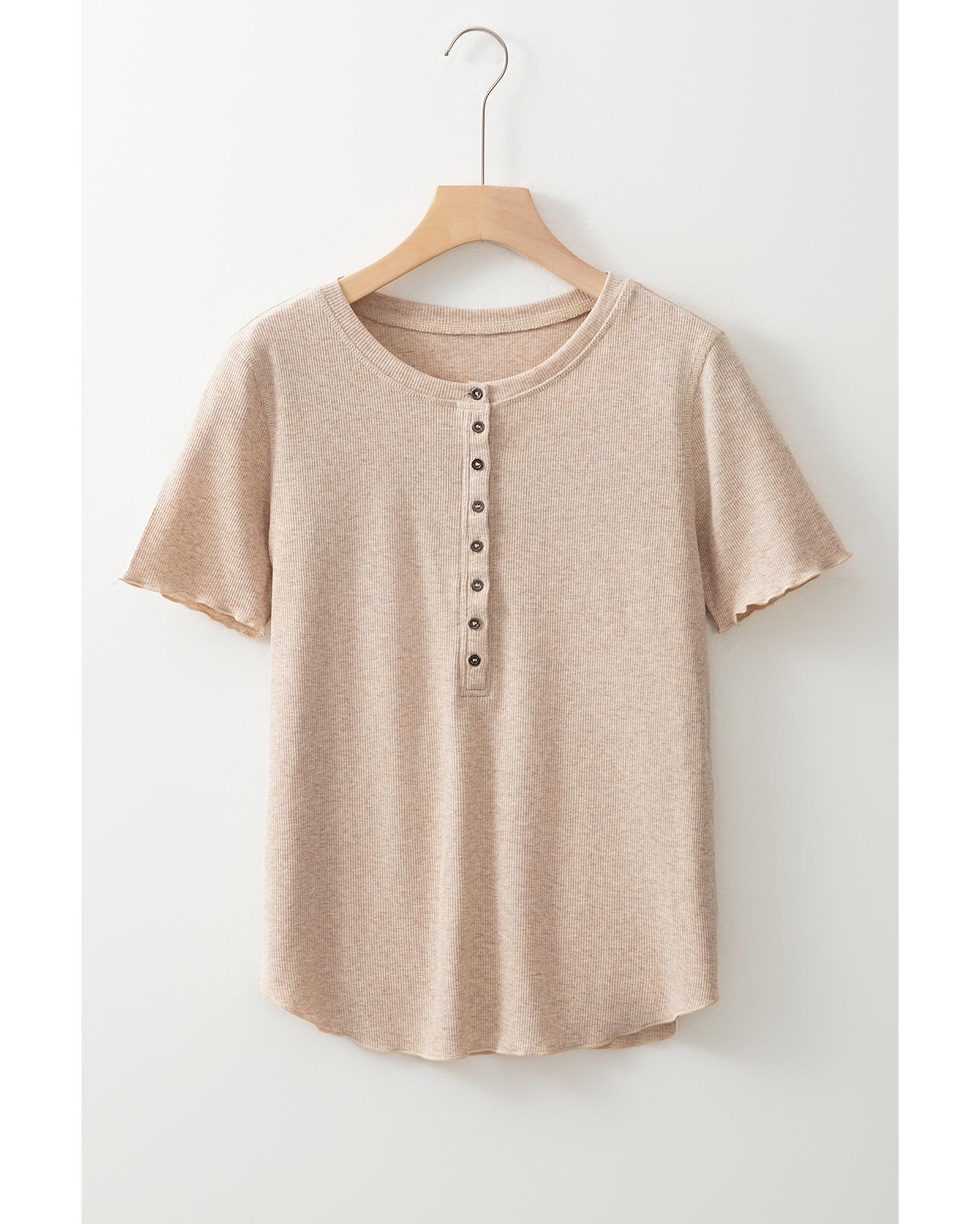 This oatmeal short sleeve half button ribbed knit top combines a textured ribbed design with a stylish and comfortable fit. Its versatile solid color makes it suitable for various occasions, offering a chic and breezy look. The top features a unique half button detail and high elasticity for added comfort.