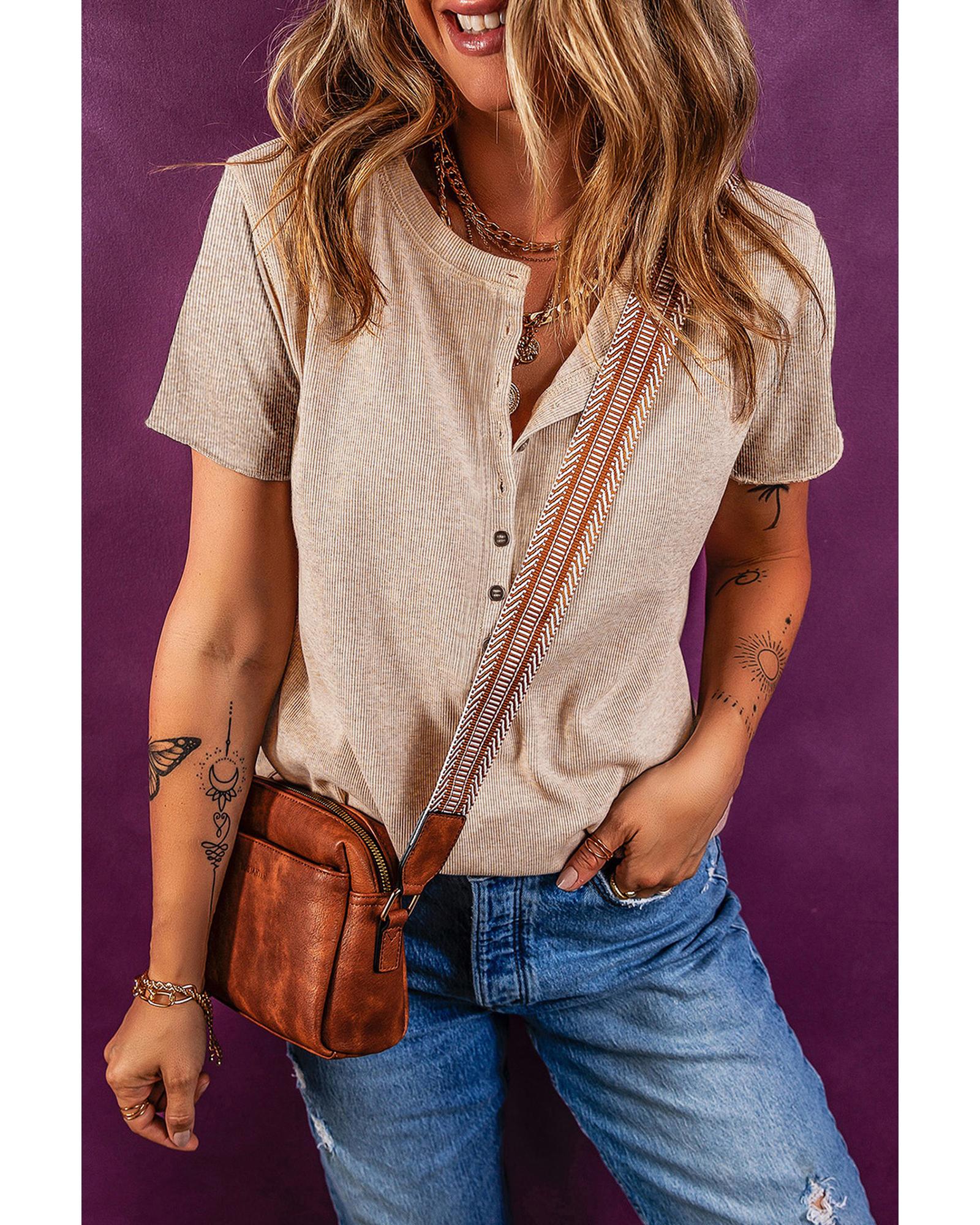 This oatmeal short sleeve half button ribbed knit top combines style and comfort with its textured design and versatile appearance. Perfect for various occasions, it offers a chic and breezy look suitable for everyday wear.