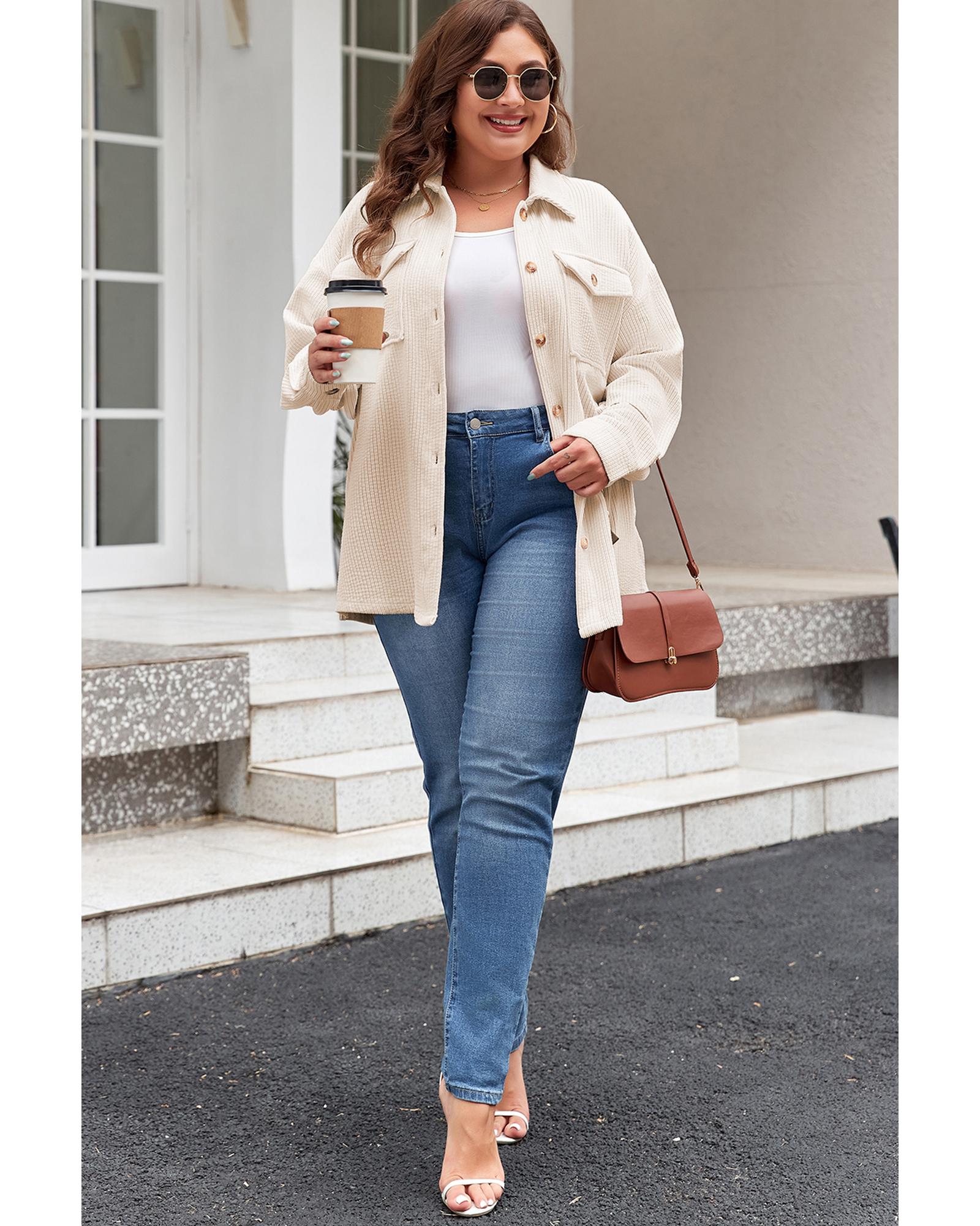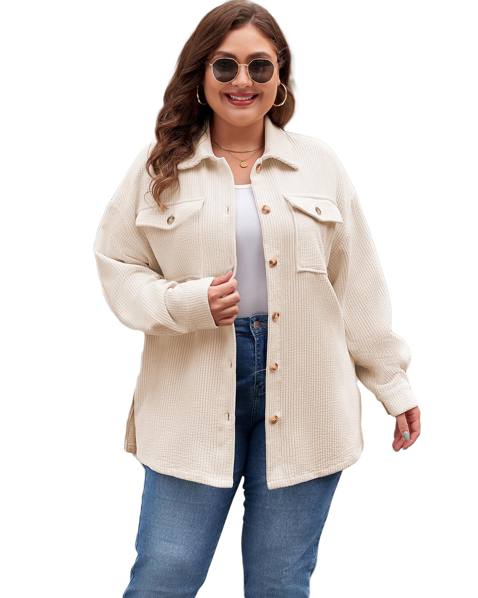 This plus size shacket features a trendy fitted design with a textured oatmeal fabric, making it versatile for various occasions. It combines style and practicality with functional details and a comfortable fit.