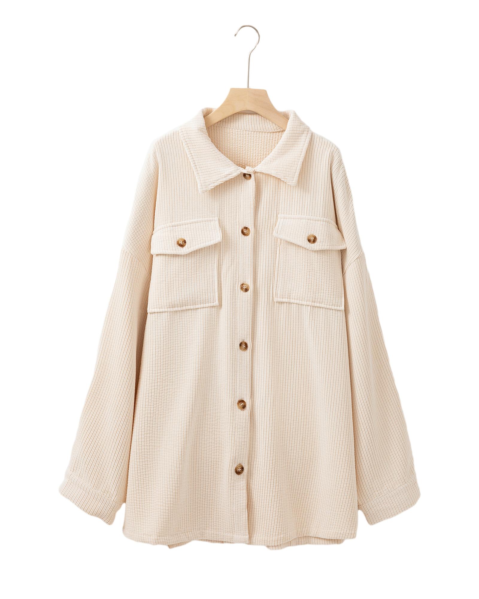 This plus size shacket features a trendy fitted design with a textured oatmeal fabric, making it a versatile addition to your wardrobe. It combines style and practicality, suitable for various occasions and body types.
