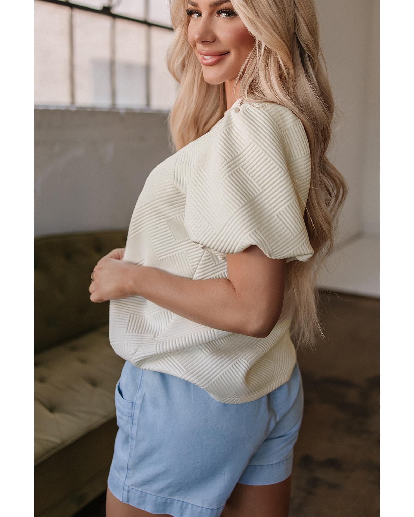 This oatmeal textured puff sleeve T-shirt offers a stylish and comfortable option for everyday wear. Its unique textured fabric and puff sleeve design add a fashionable touch, making it suitable for various casual occasions. The versatile design pairs easily with jeans and skirts, providing a simple yet chic look.