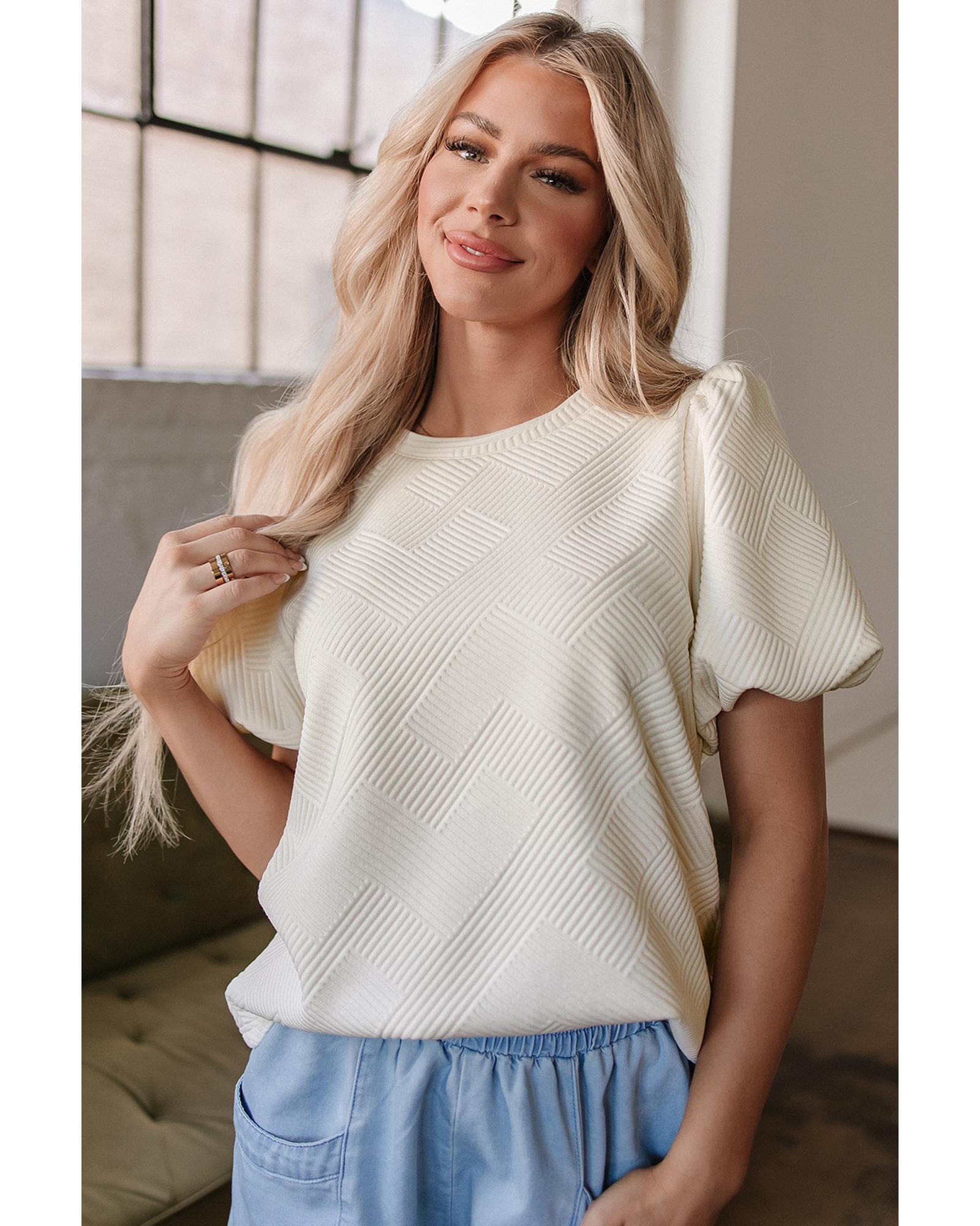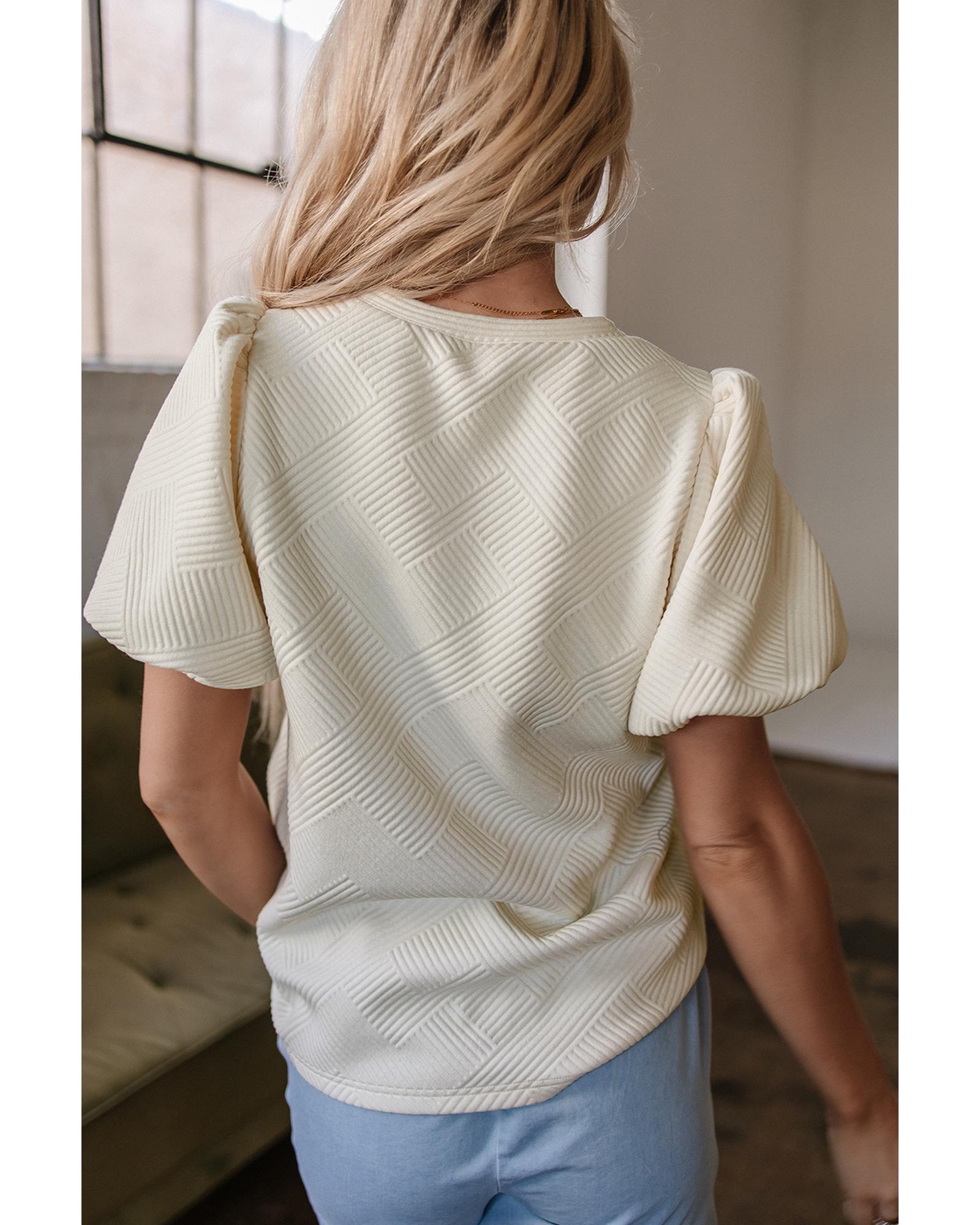 This oatmeal textured puff sleeve T-shirt combines a unique fabric design with a stylish silhouette, making it a versatile addition to your wardrobe. Its comfortable fit and simple style allow for easy pairing with various outfits, perfect for casual or semi-casual occasions.