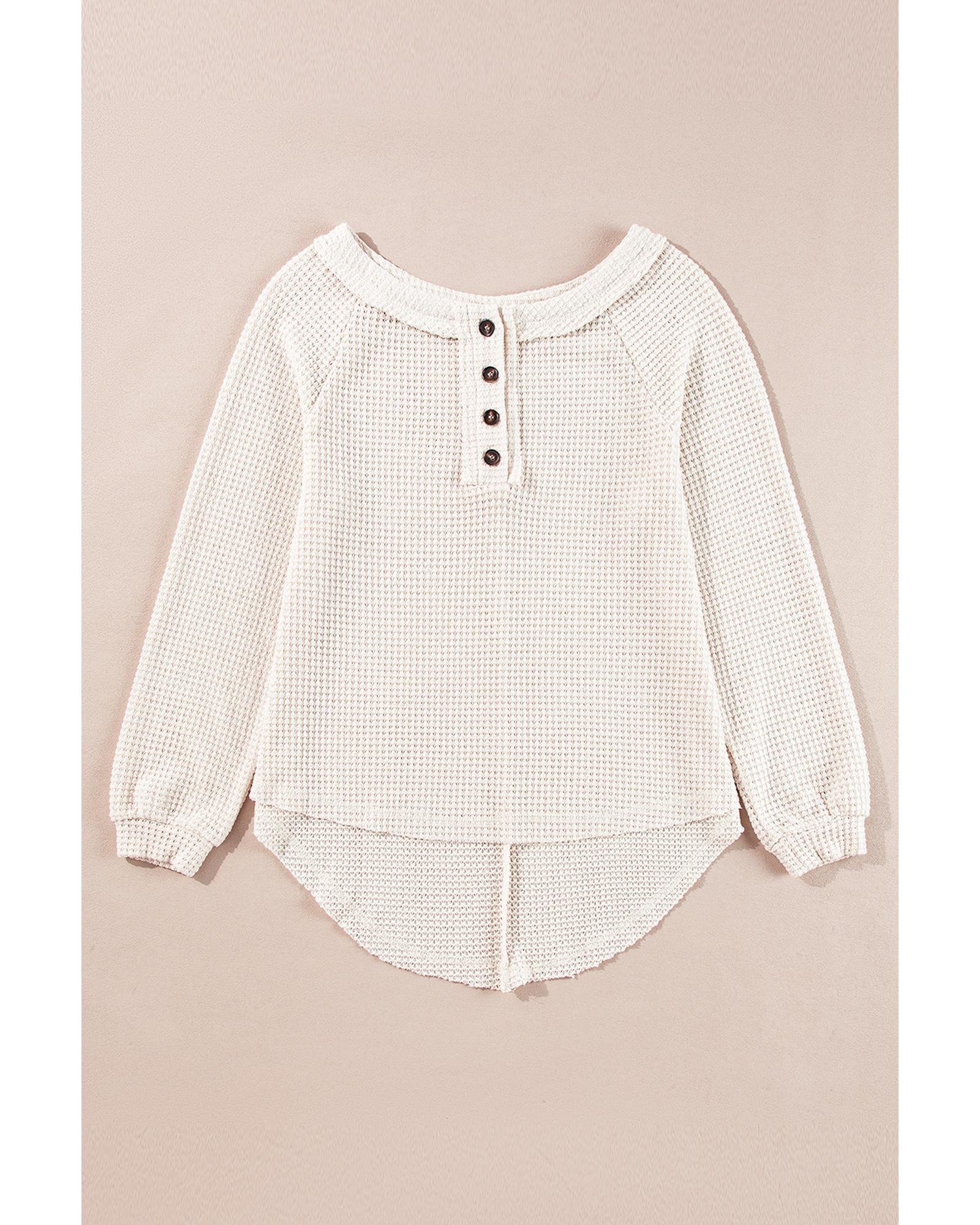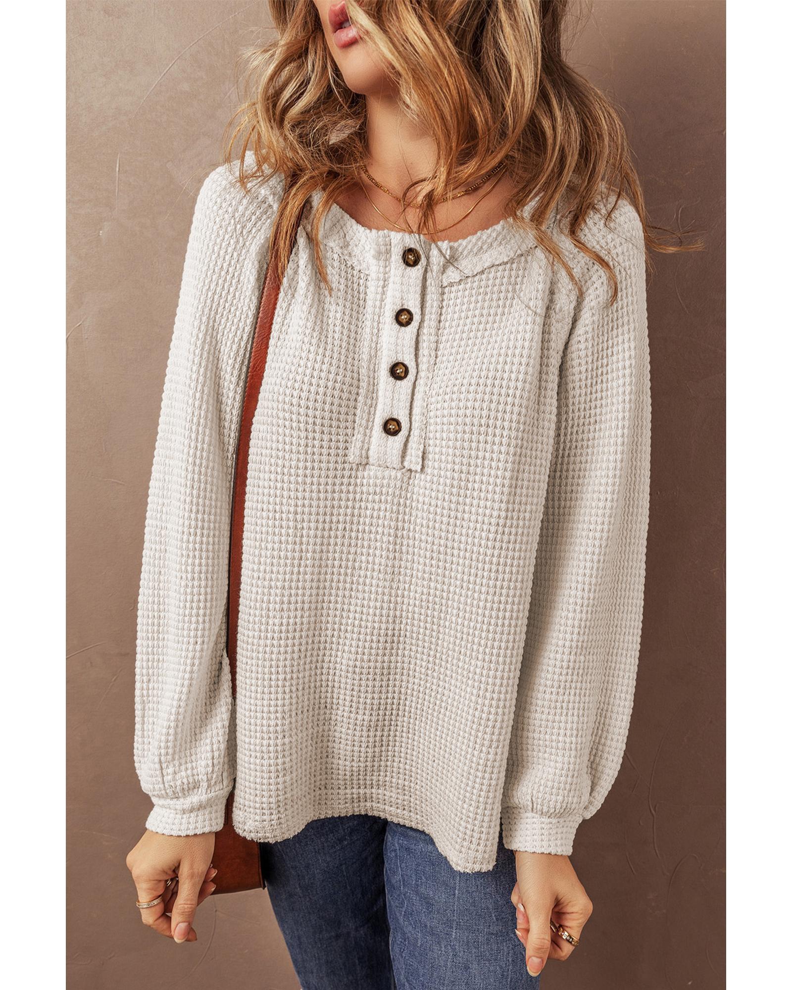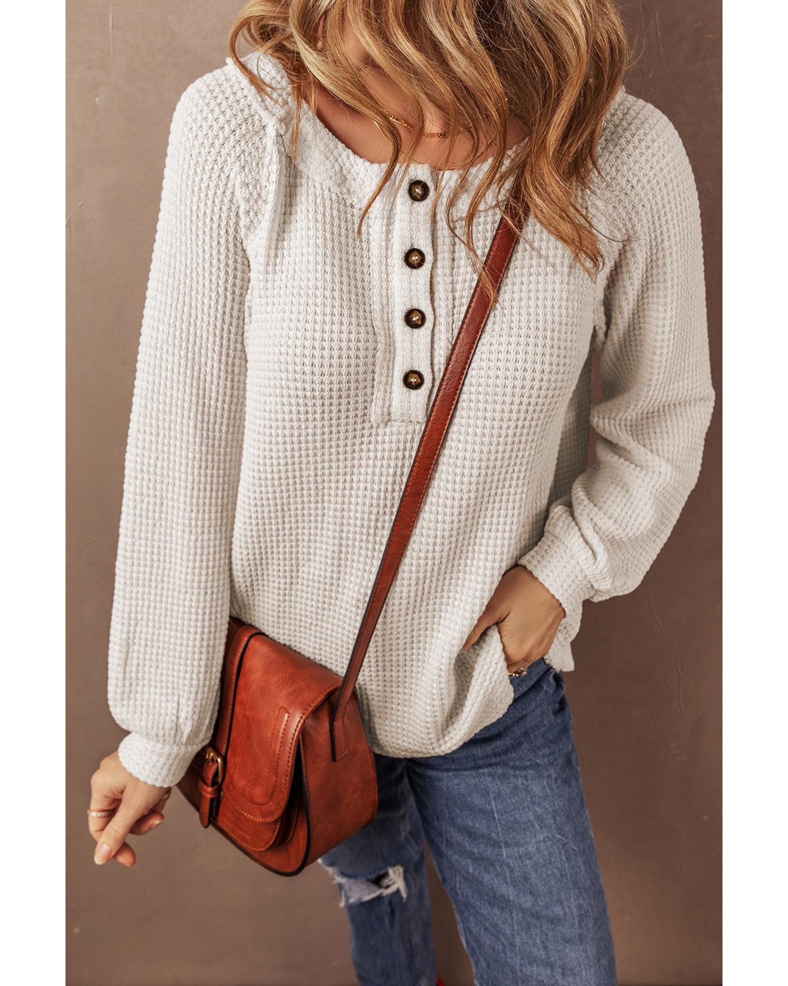 This loose blouse features a trendy oatmeal waffle knit design, perfect for casual styling. With its buttoned front and raglan sleeves, it offers both comfort and style, making it a versatile addition to your wardrobe.