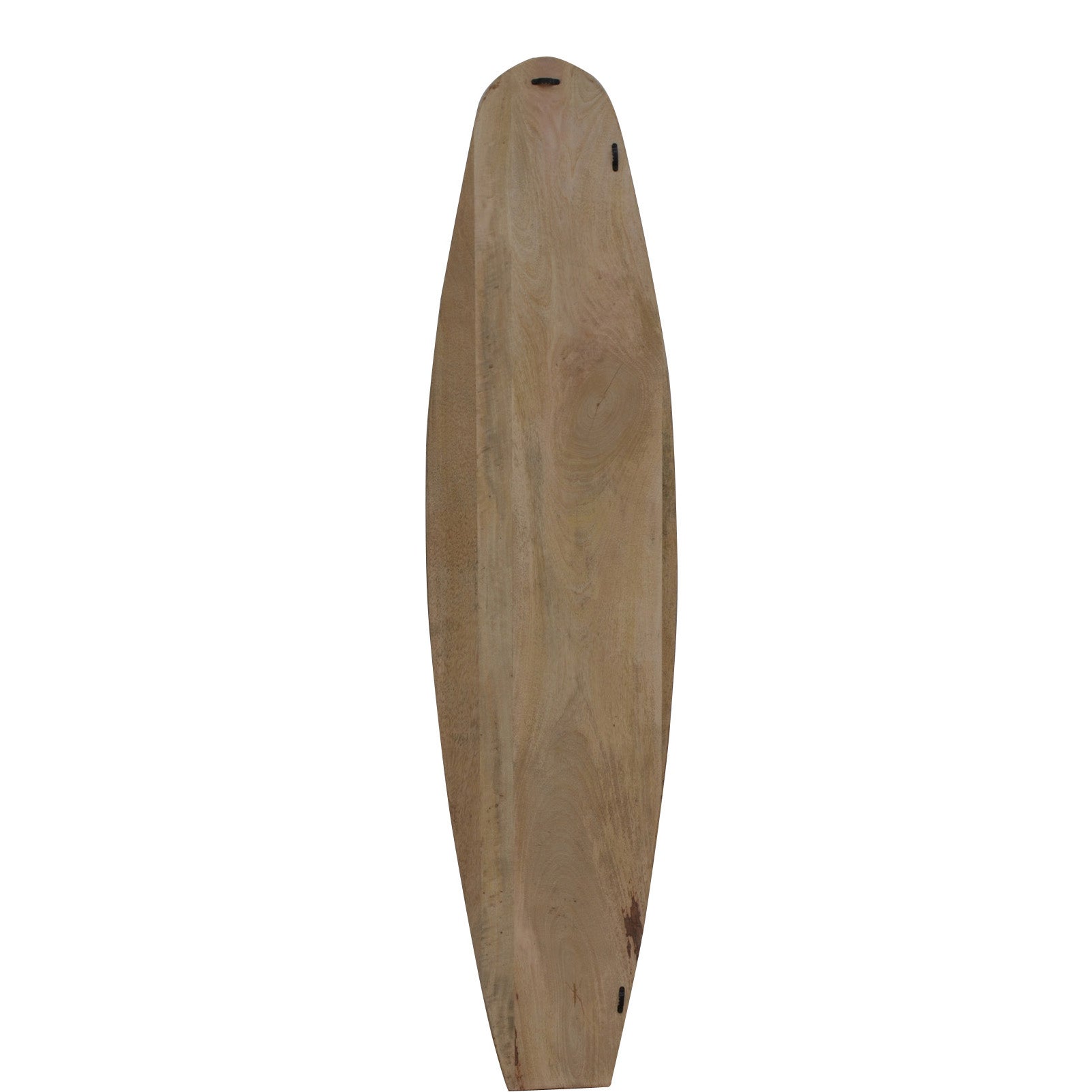 This wall art piece features a surfboard shape carved from hardwood mango timber, decorated with scattered map images. It adds a worldly and charming touch to any space, perfect for surfing enthusiasts or those who appreciate unique decor items.