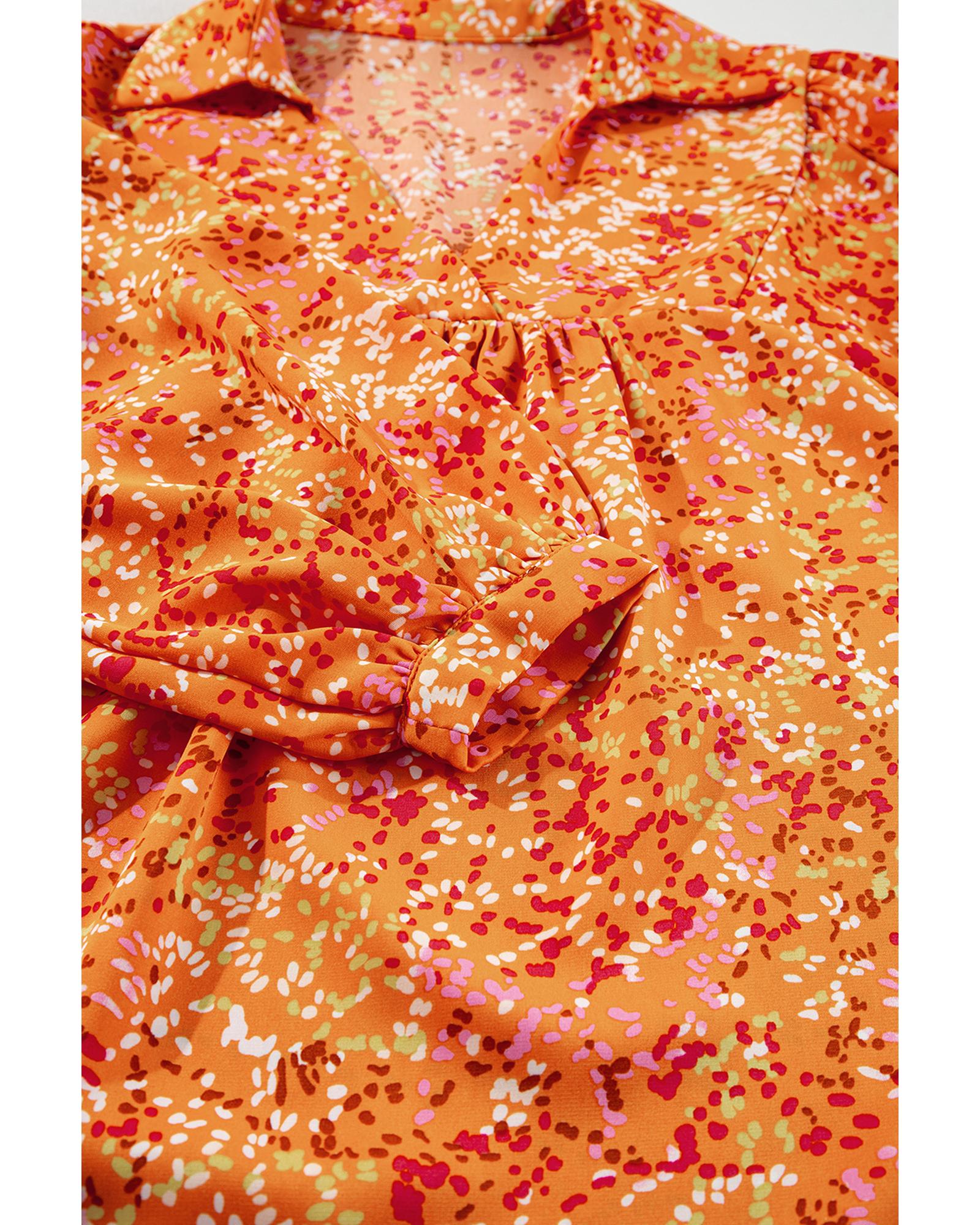 This stylish babydoll blouse features a vibrant orange abstract print and a classic collared V-neck design. Its loose fit and babydoll silhouette make it a versatile choice suitable for various body shapes, offering a trendy and comfortable look.