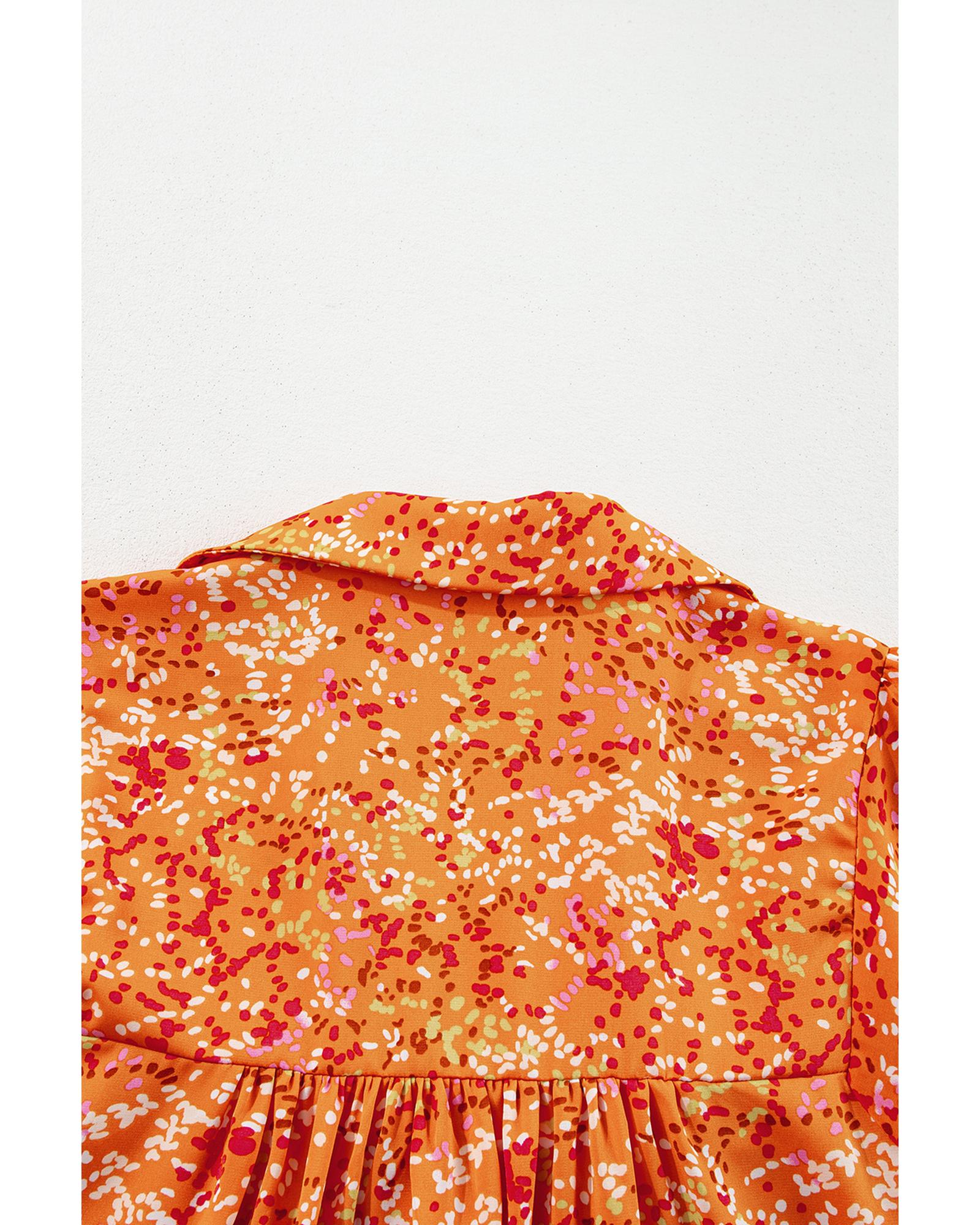 This stylish babydoll blouse features a vibrant orange abstract print and a classic collared V-neck design. Its loose fit and babydoll silhouette make it a versatile choice suitable for various body shapes, offering a trendy and comfortable look.