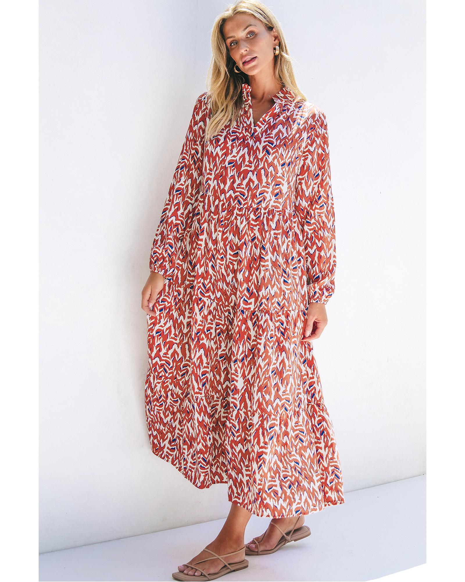 This stylish midi dress features a vibrant orange abstract print and a flattering high waist silhouette. Designed with a pleated, tiered structure, it offers an elegant and trendy look suitable for various occasions. The dress has a V-neckline and a midi length, combining comfort with sophistication.