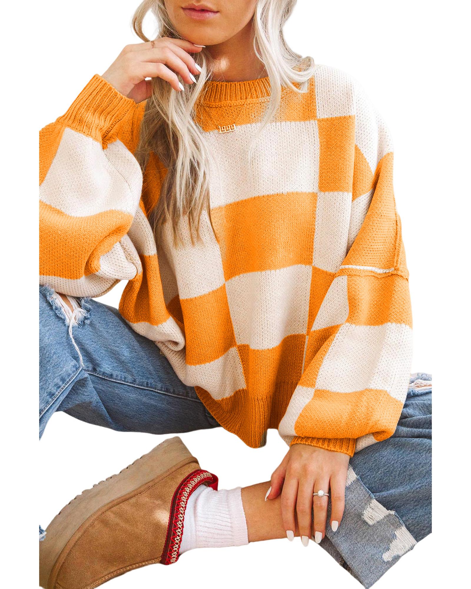This orange checkered sweater features a trendy fitted design with unique pattern details. It is crafted from high-quality material, making it suitable for various occasions. The sweater includes stylish bishop sleeves, adding a fashionable touch to your outfit.