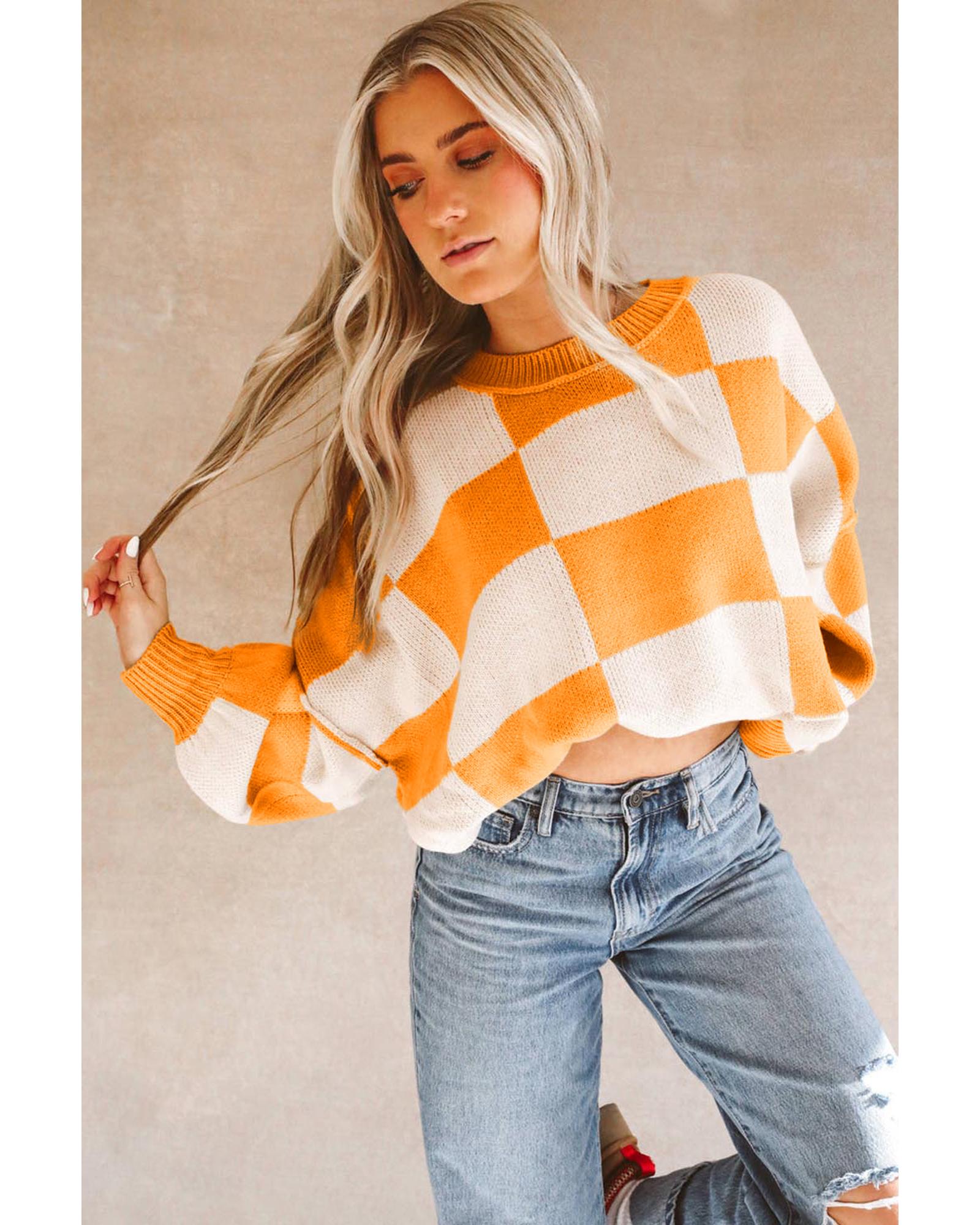 This orange checkered sweater features a trendy fitted design with unique pattern details. It is crafted from high-quality material, making it suitable for various occasions. The sweater is designed with bishop sleeves, adding a stylish touch to the overall look.