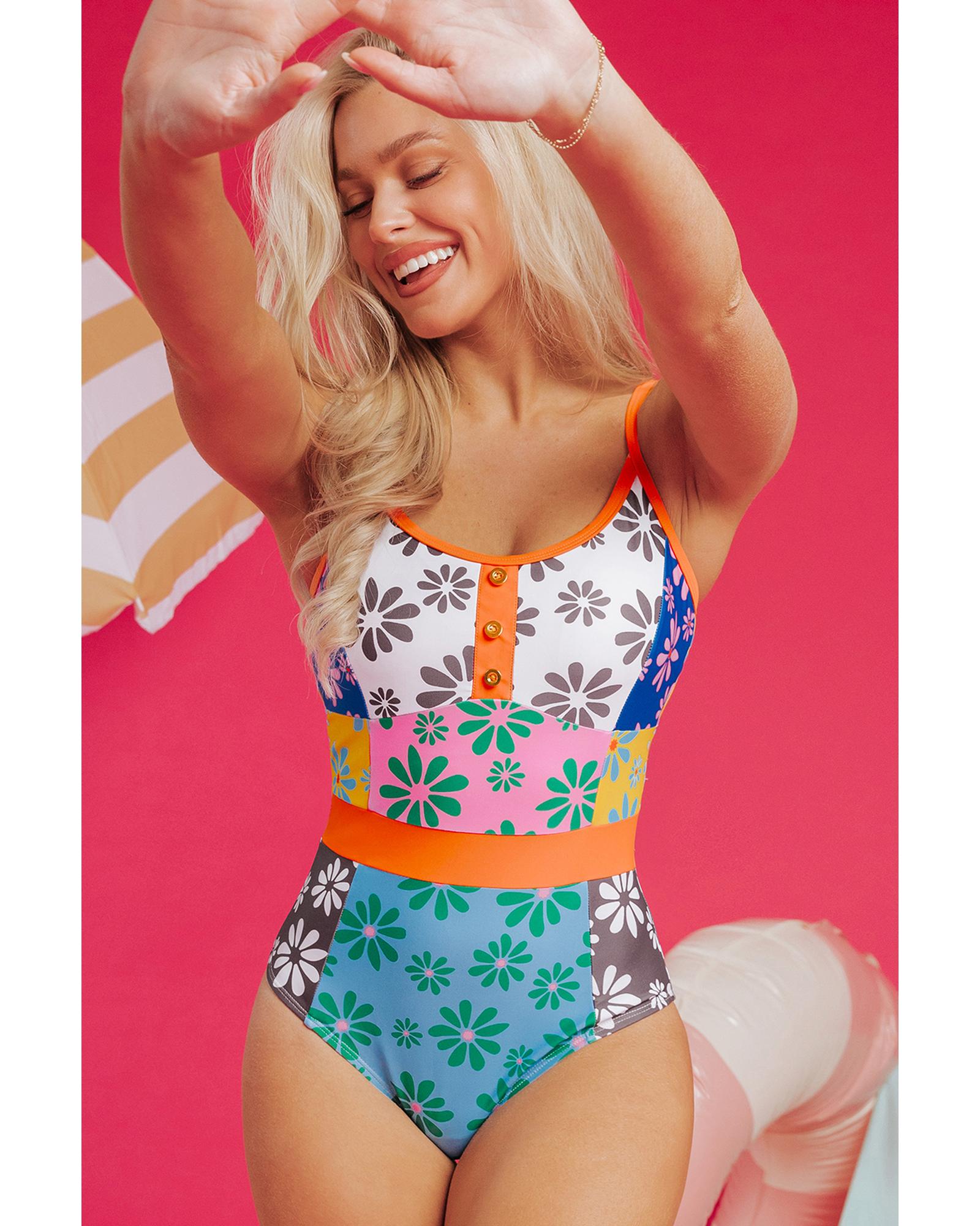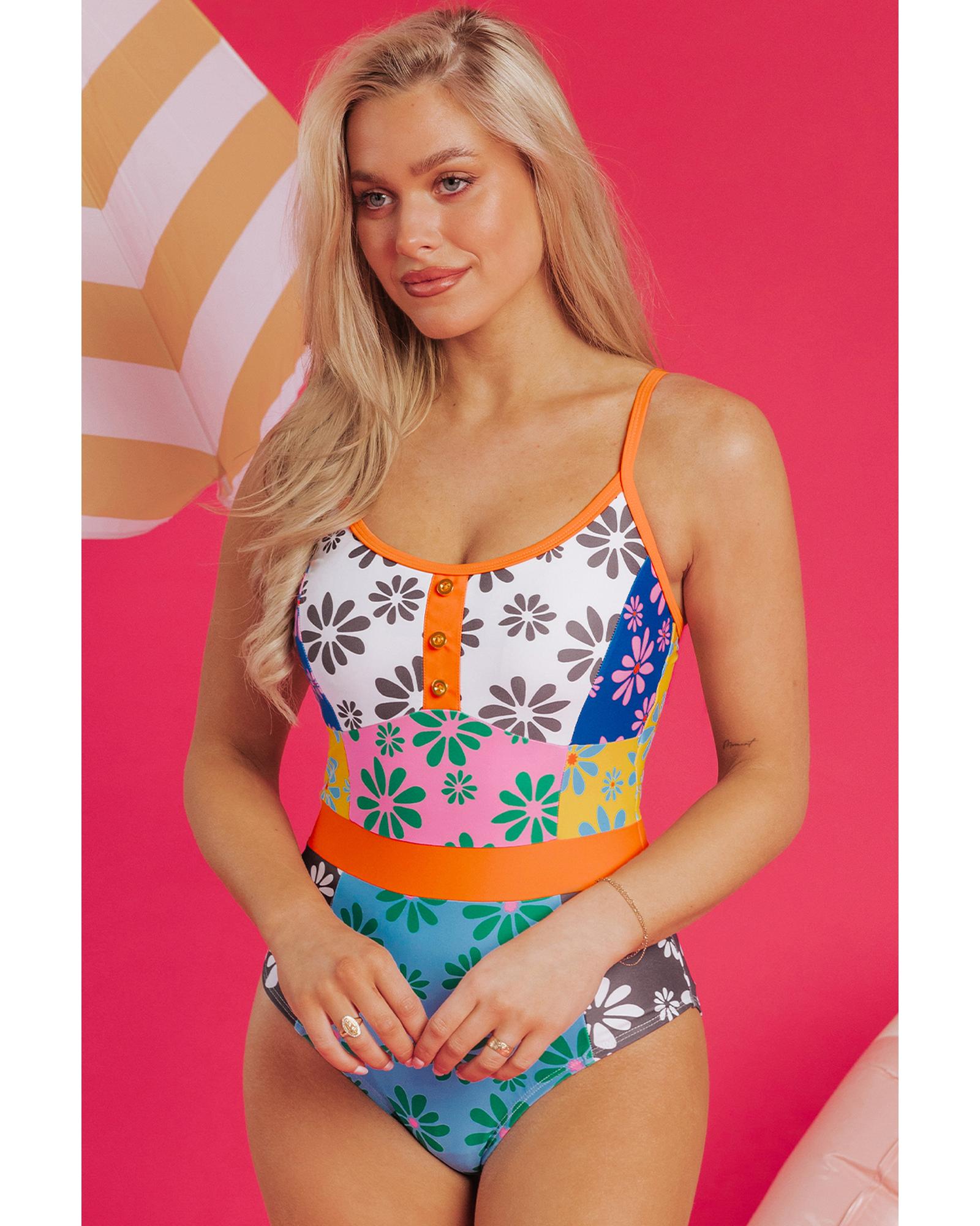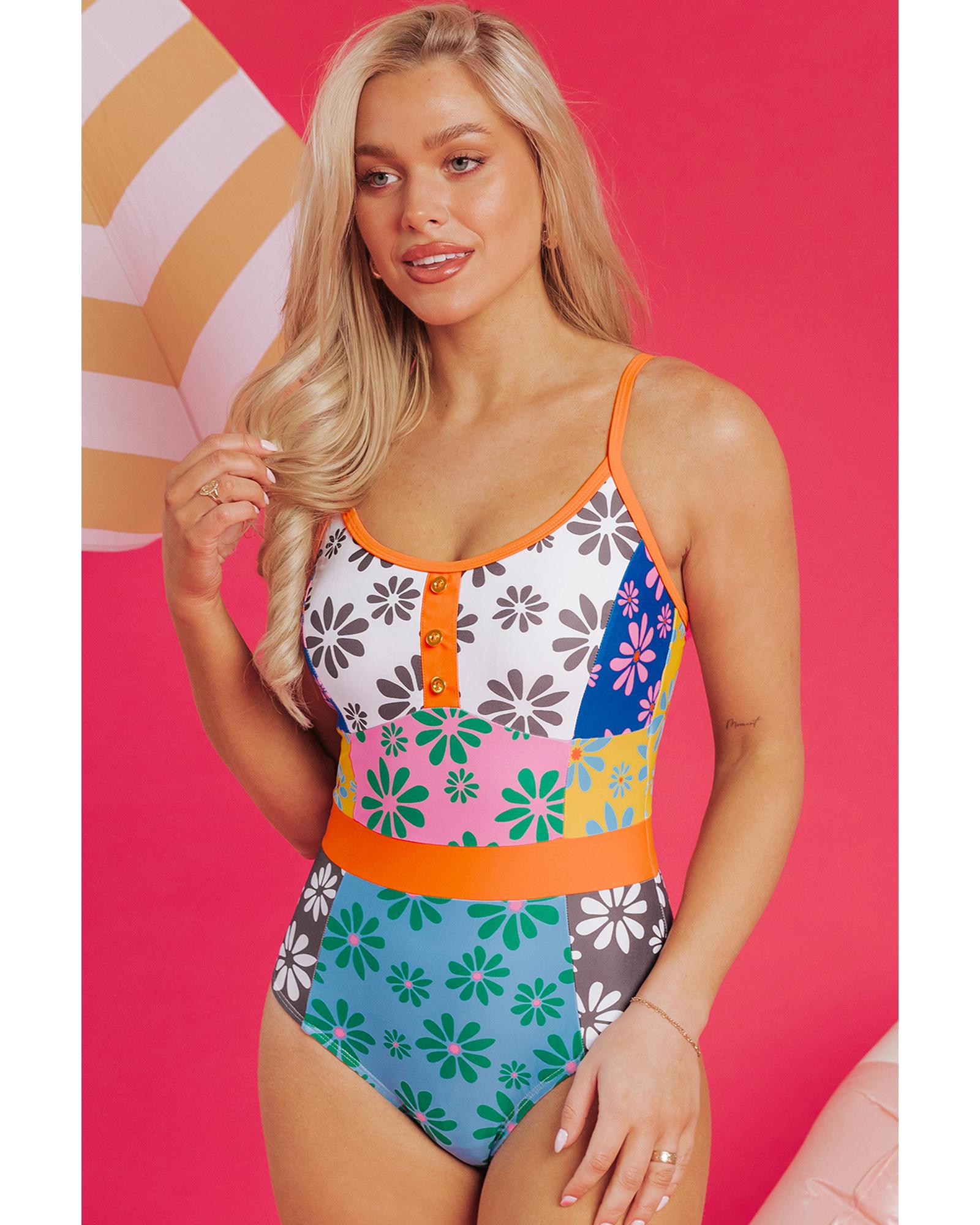 This floral-colored, colorblock buttoned front teddy swimsuit features a stylish design with spaghetti straps and decorative accents. It is suitable for summer vacations and offers a comfortable fit with adjustable straps and a built-in shelf bra. The swimsuit combines trendy floral patterns with contrasting trim details, making it a fashionable choice for warm weather activities.