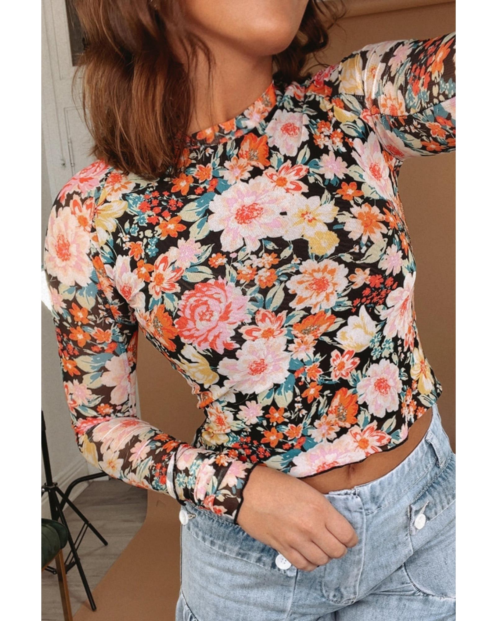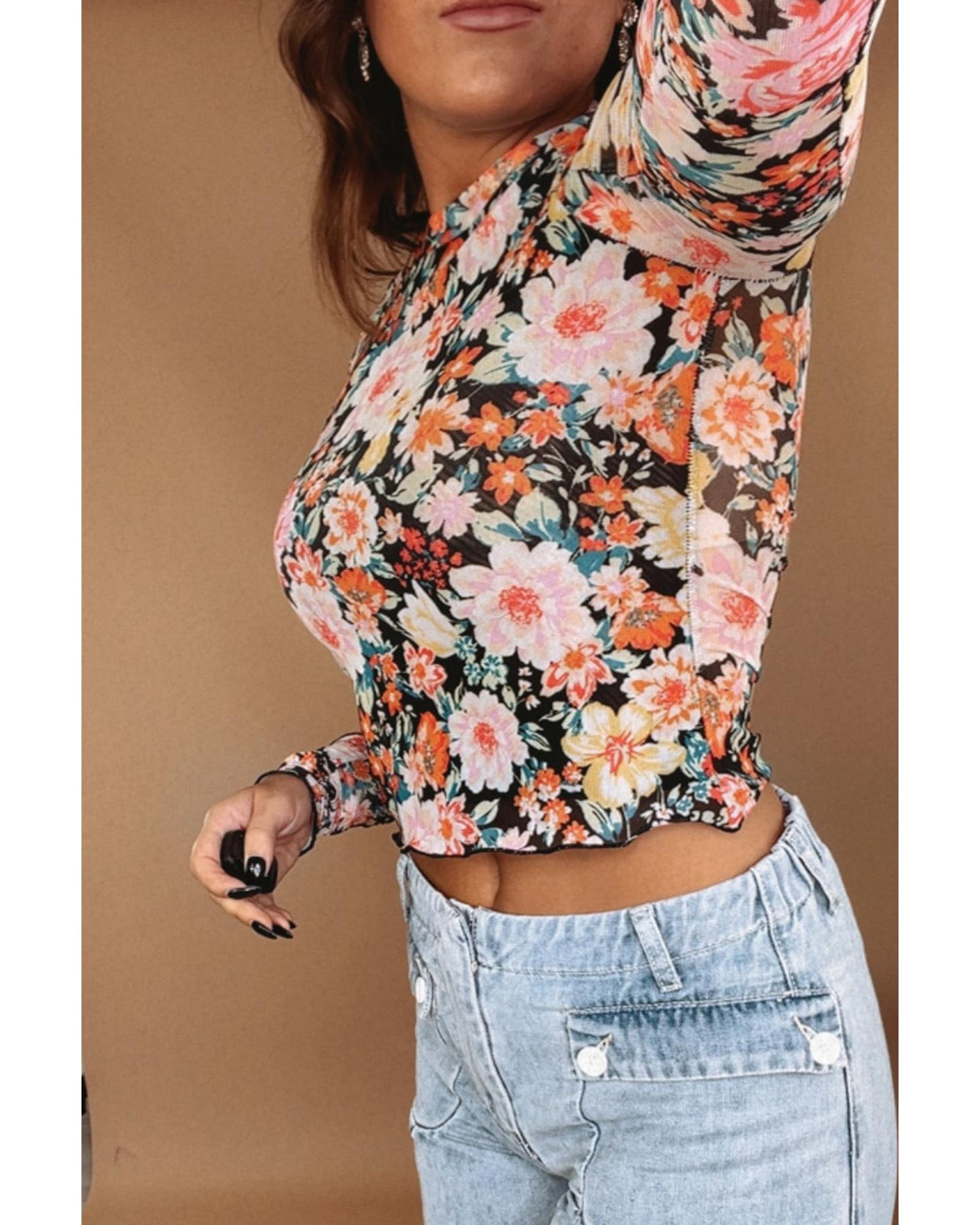 Orange Floral Mesh Slim Long Sleeve Crop Top – S
