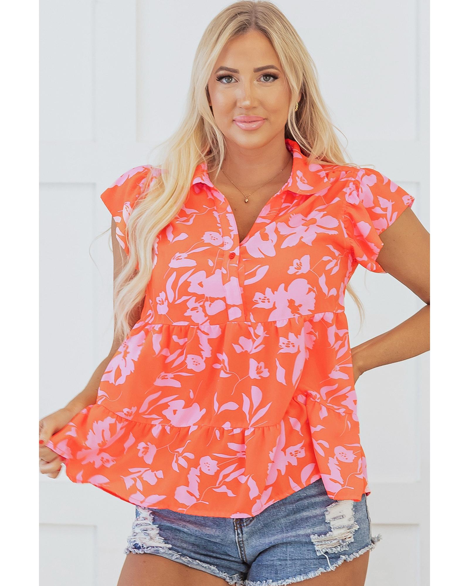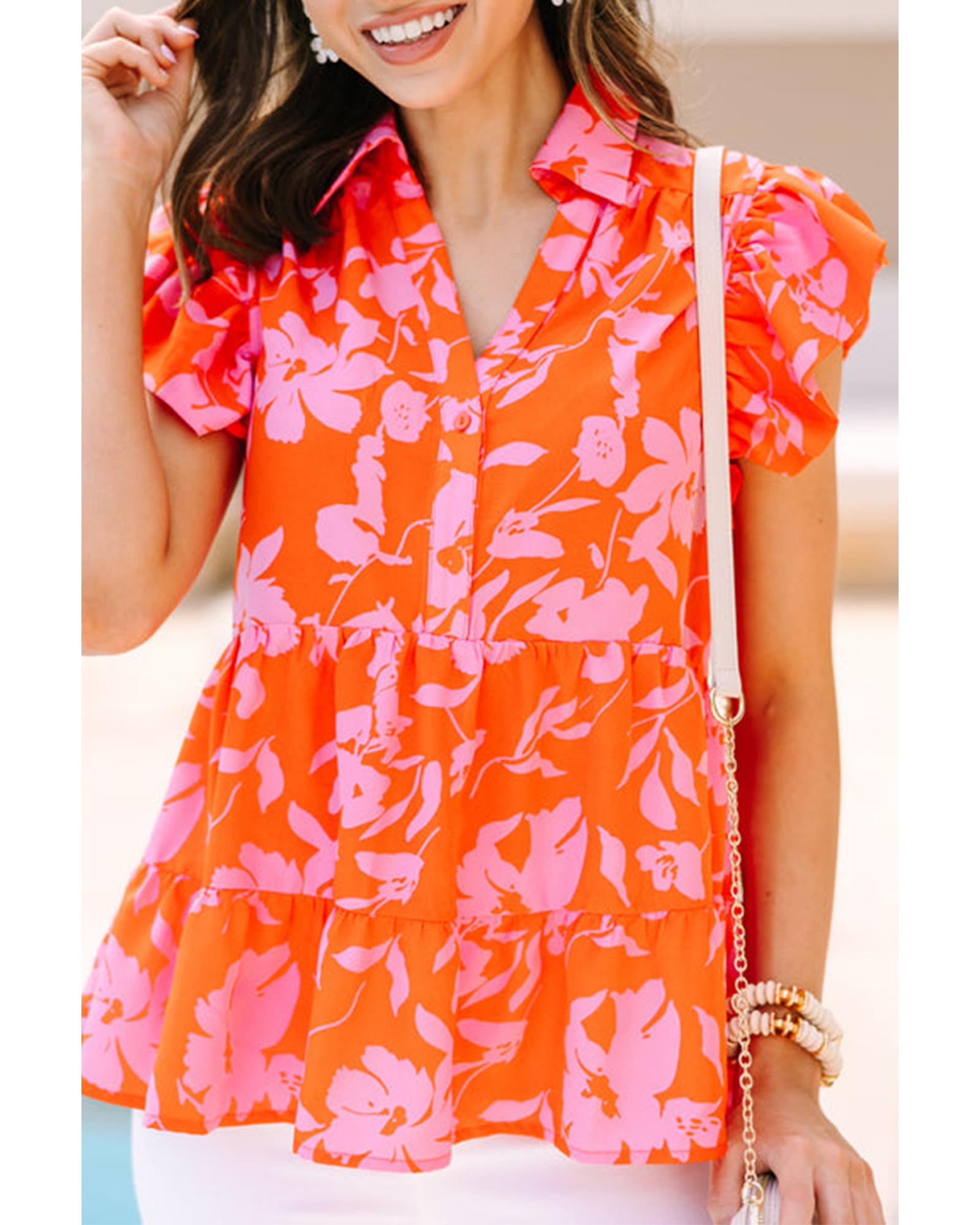 This blouse features a vibrant orange floral print with a classic collared button neckline. The flutter sleeves add a whimsical touch, making it suitable for various occasions. The adjustable buttoned neckline provides a customizable fit, ensuring comfort and style.