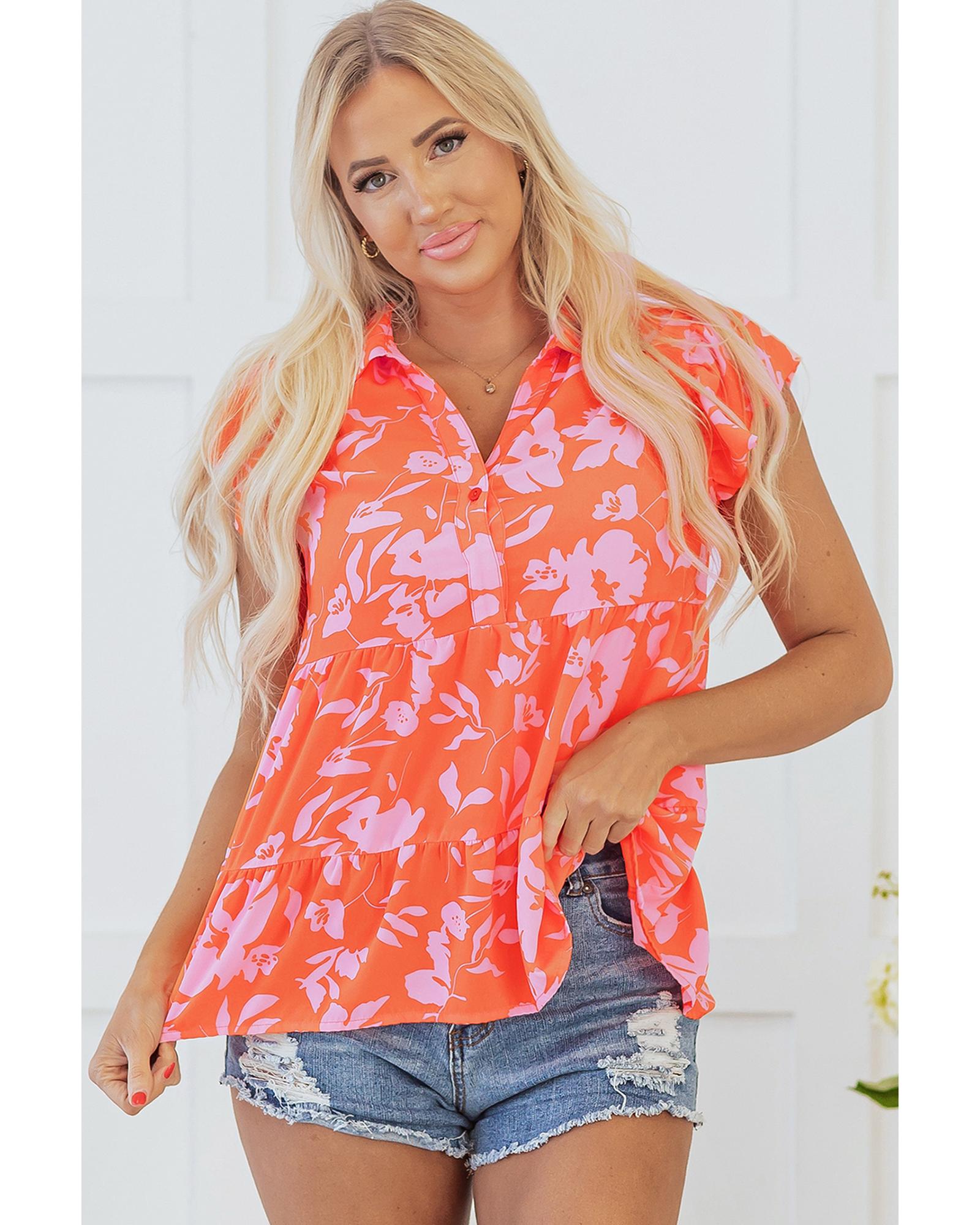 This orange floral print blouse features a stylish collared button neckline and flutter sleeves, offering a charming and whimsical look. Designed for versatility, it is suitable for various occasions and can be easily styled for different settings.