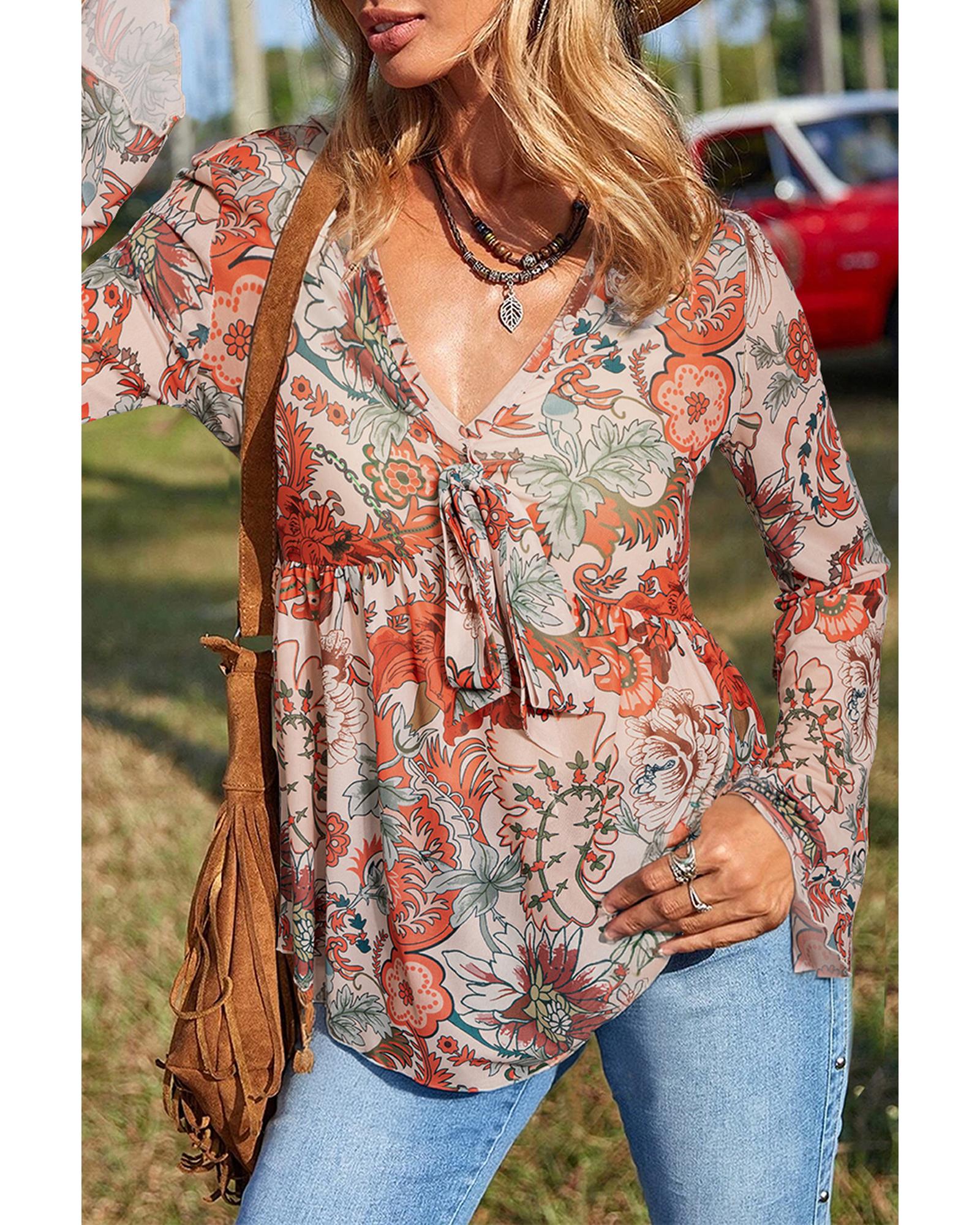 Orange Floral Print Deep V Neck Knot Bell Sleeve Blouse – S