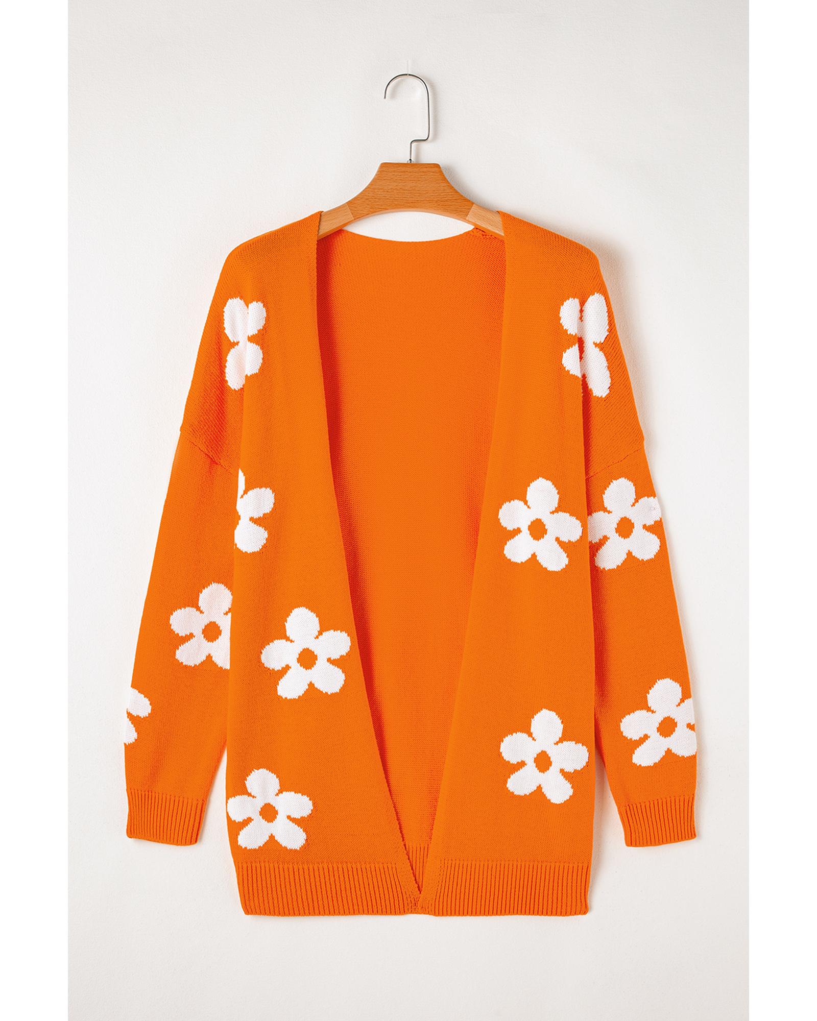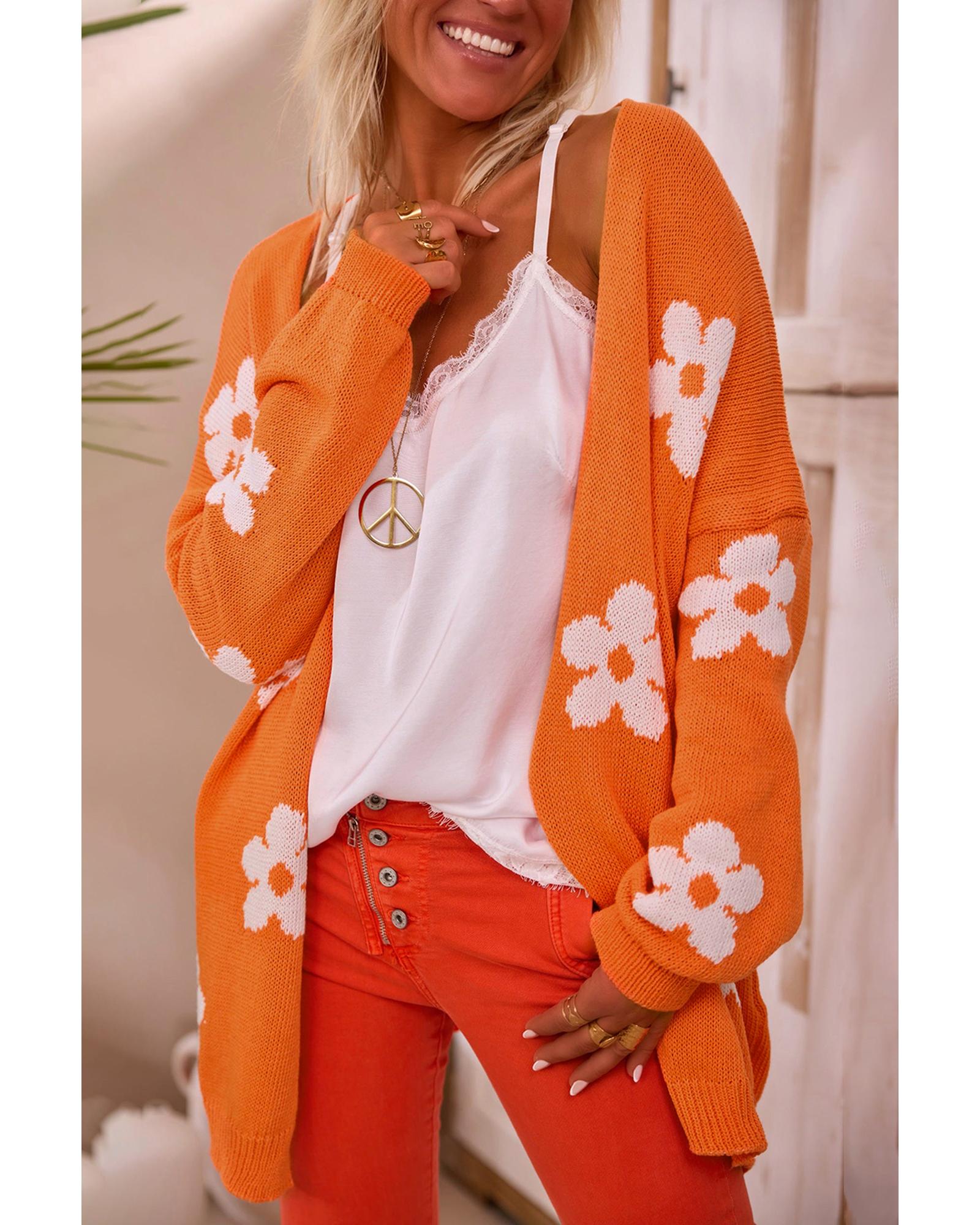 This orange floral print knitted open front cardigan offers a stylish and versatile addition to your wardrobe. Designed with a trendy fitted look, it combines feminine charm with comfort, making it suitable for various casual and chic occasions.