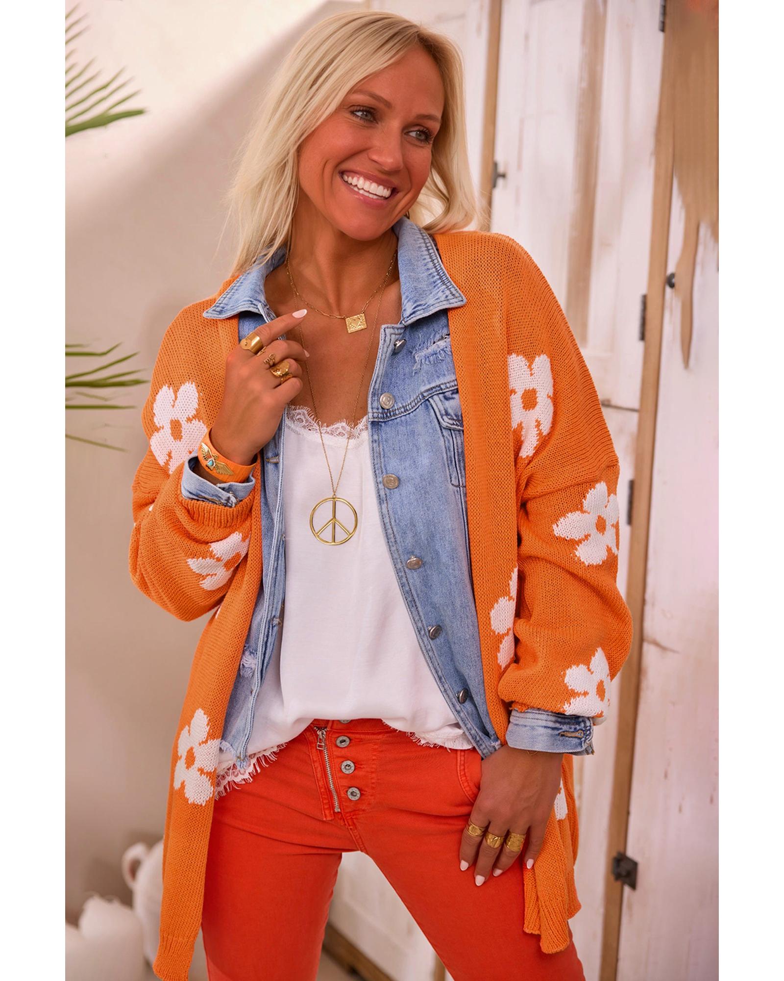 This orange floral print knitted cardigan offers a stylish and versatile addition to your wardrobe. Designed with a trendy fitted look, it combines feminine charm with comfort, making it suitable for various casual and chic outfits.