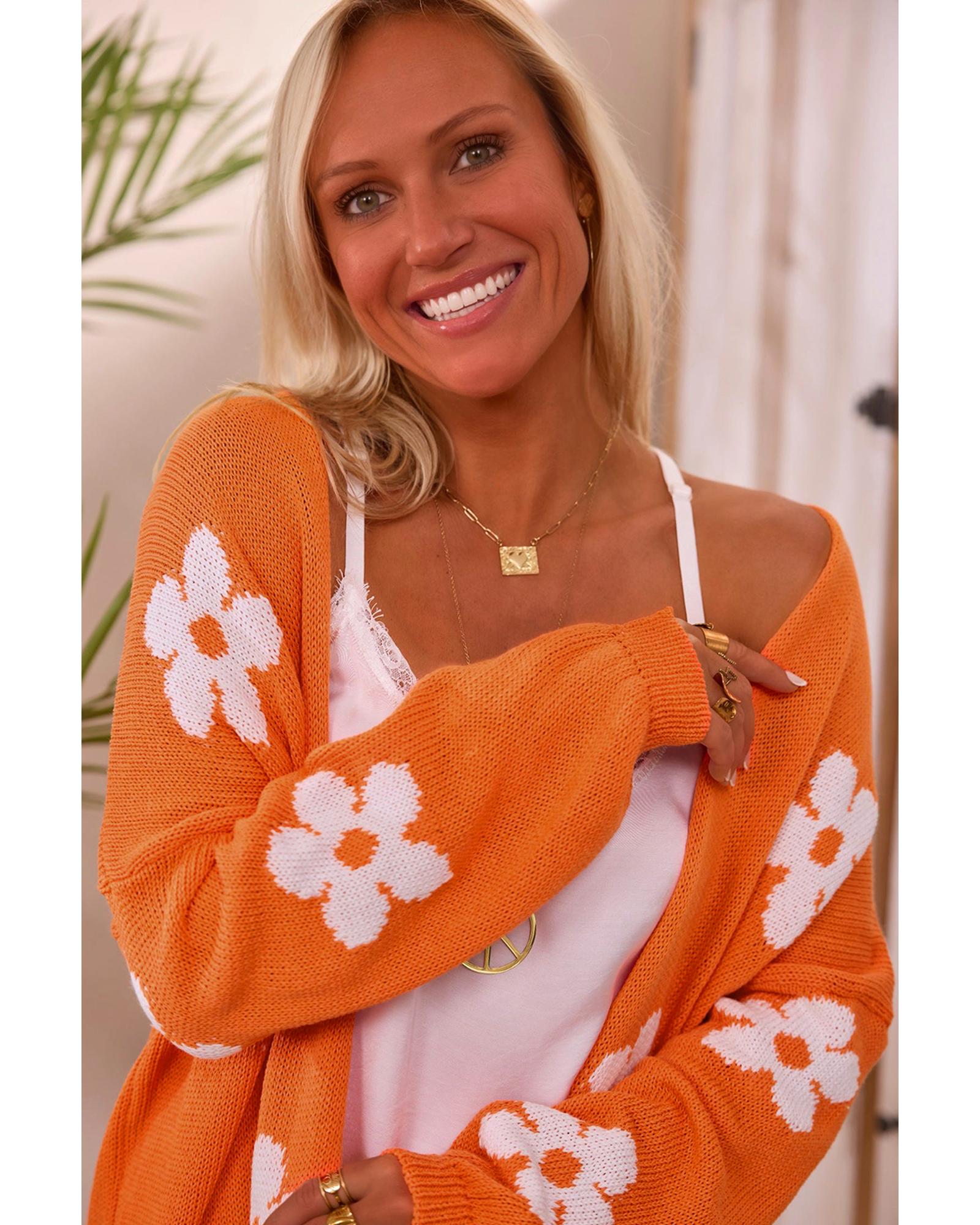 This orange floral print knitted cardigan offers a stylish and versatile addition to your wardrobe. Designed with a trendy fitted look, it combines feminine charm with comfort, making it suitable for various casual and chic outfits.