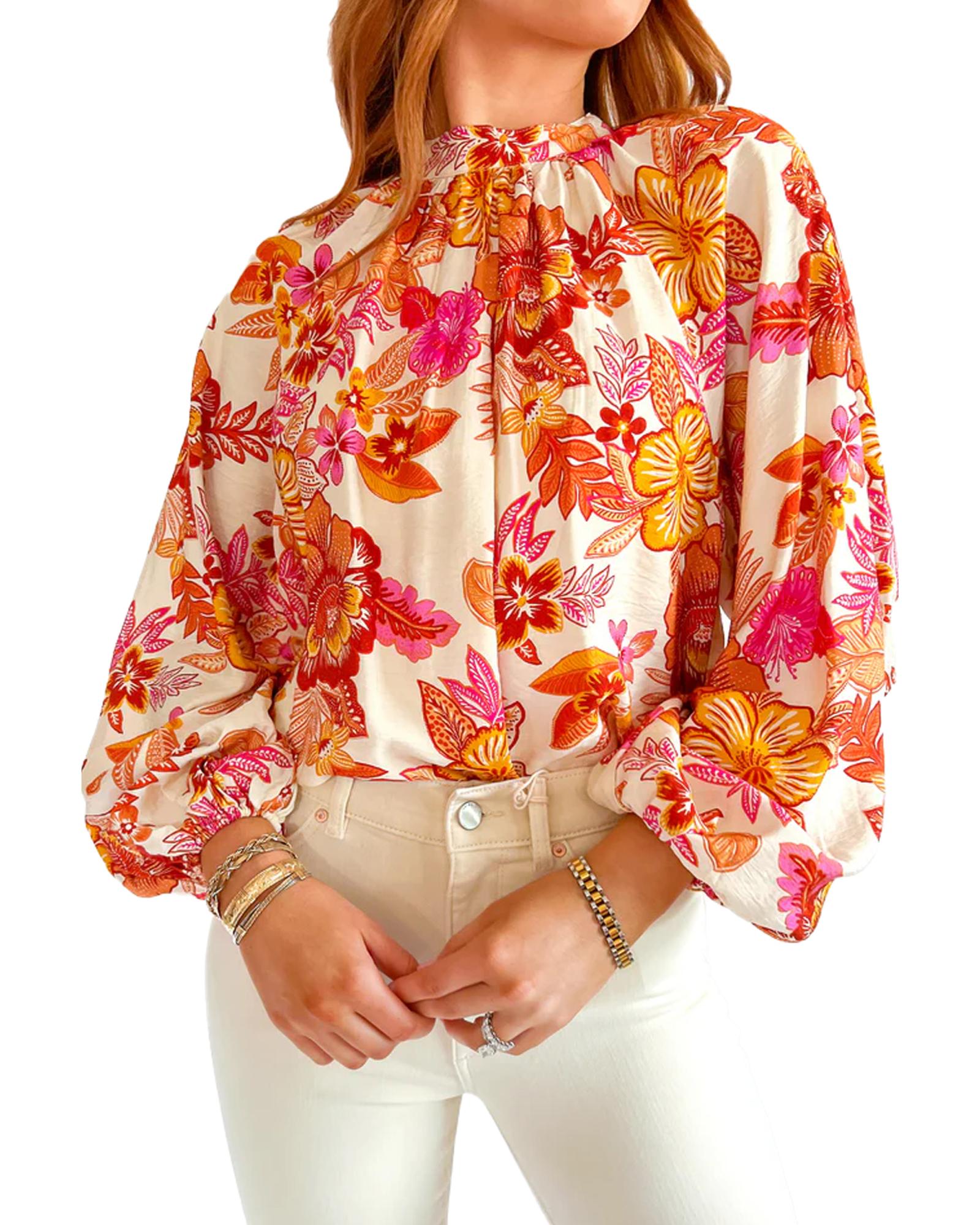 Orange Floral Print Pearl Button Keyhole Long Puff Sleeve Blouse – M