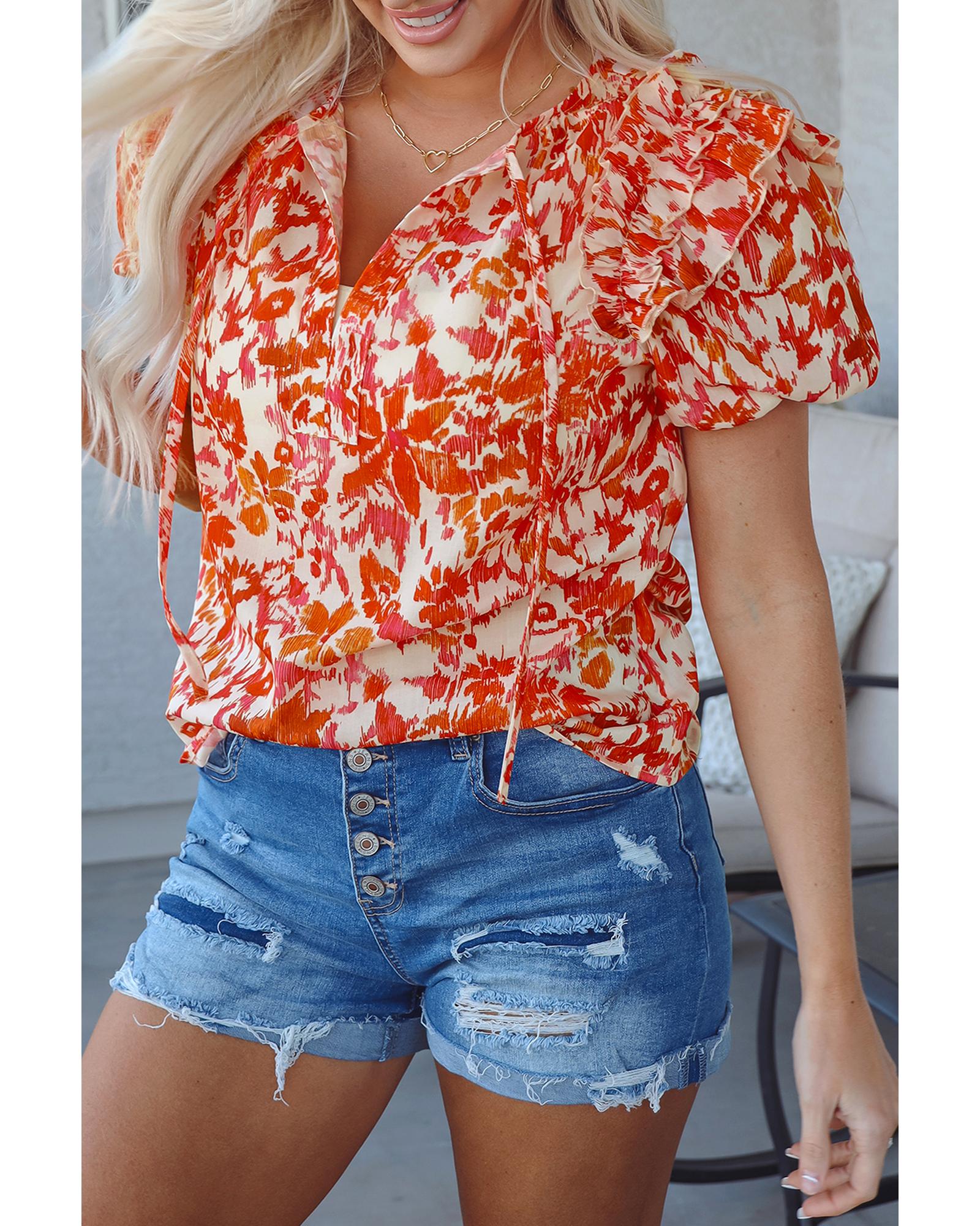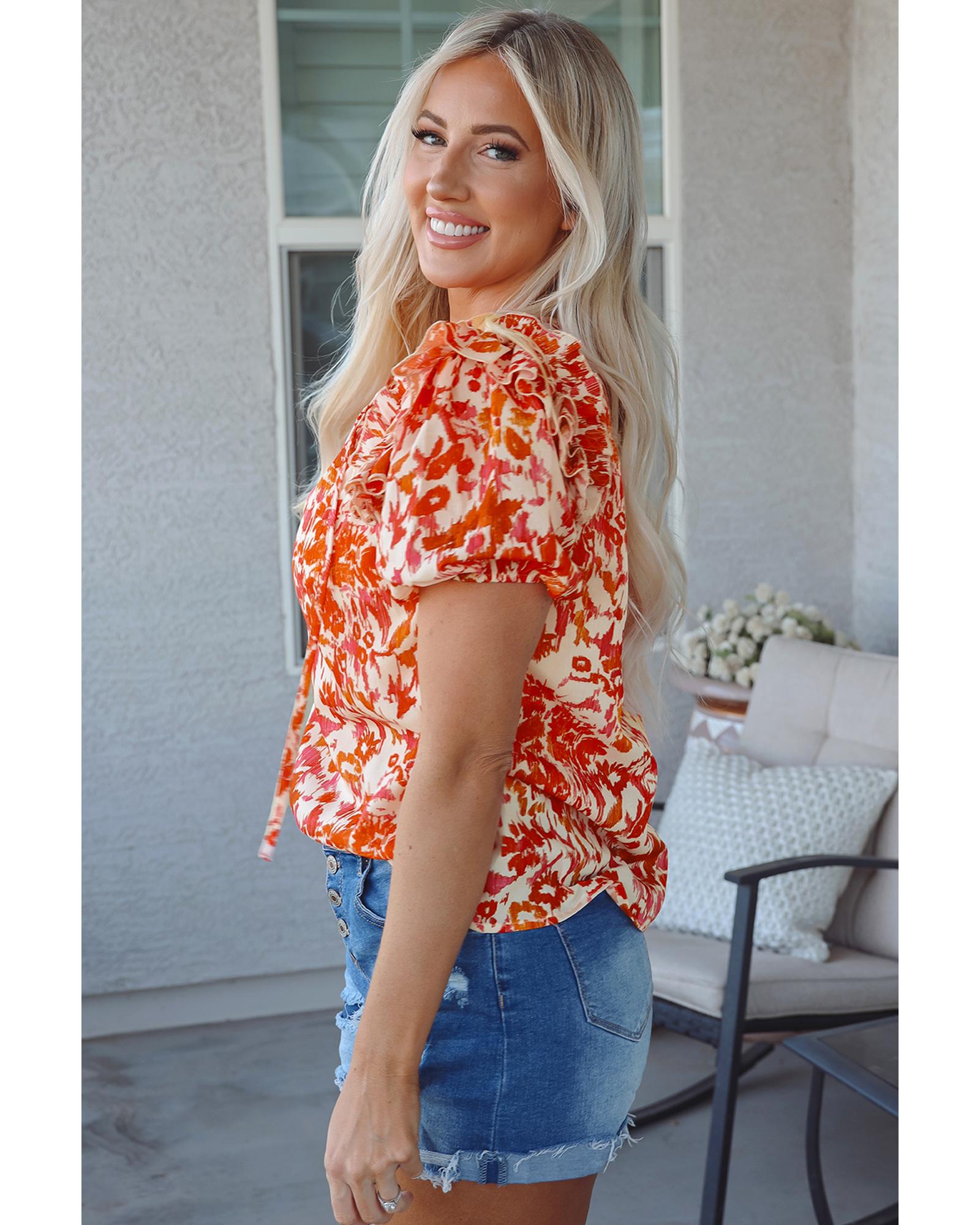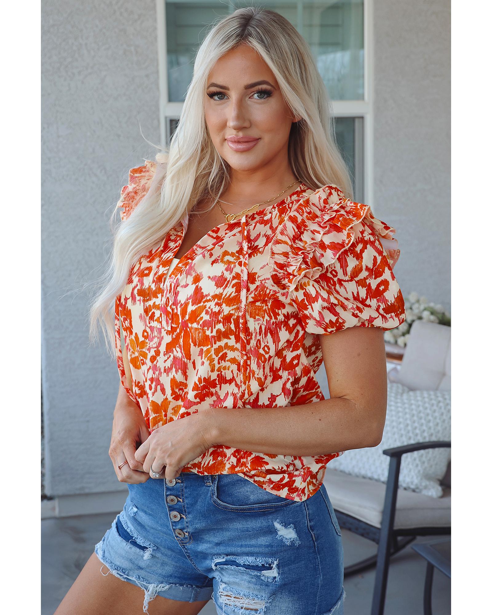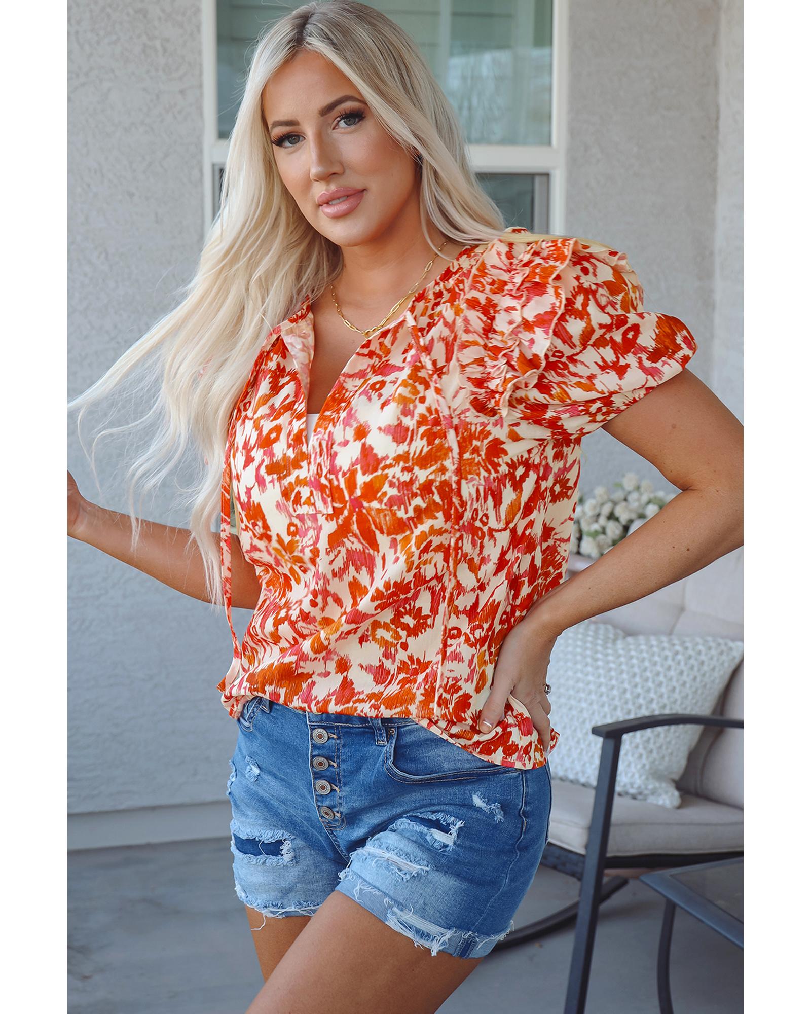 This orange floral print blouse features a stylish split neck design and ruffled short puff sleeves, offering a trendy and relaxed look. The loose silhouette provides comfort and ease of movement, making it suitable for various casual occasions. The vibrant floral pattern adds a lively touch to your outfit.