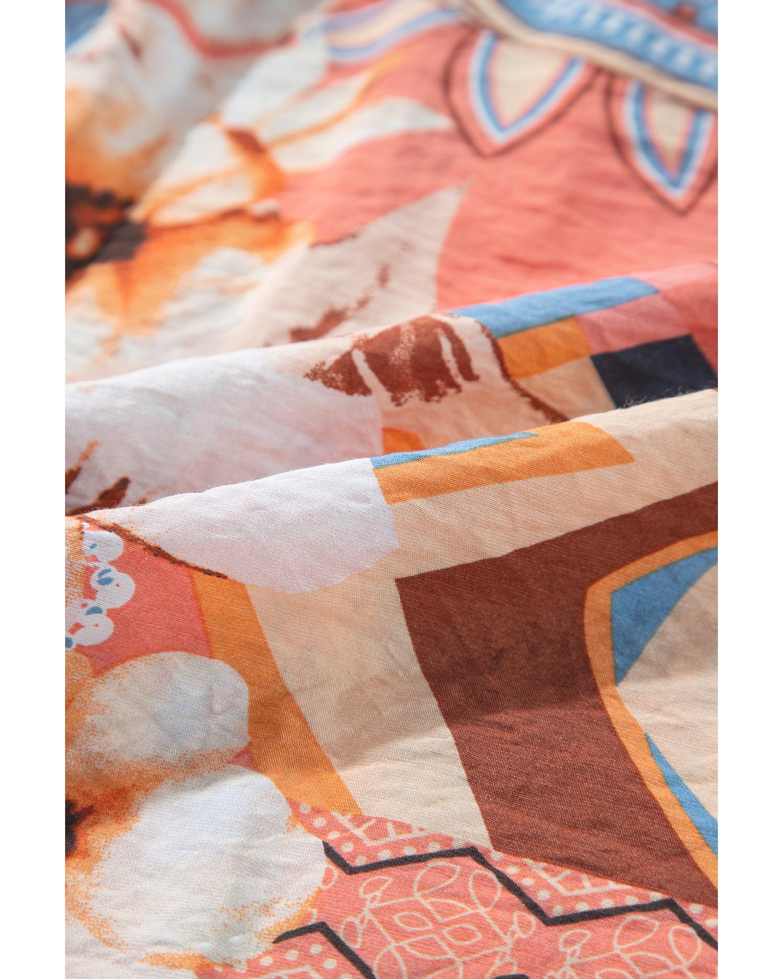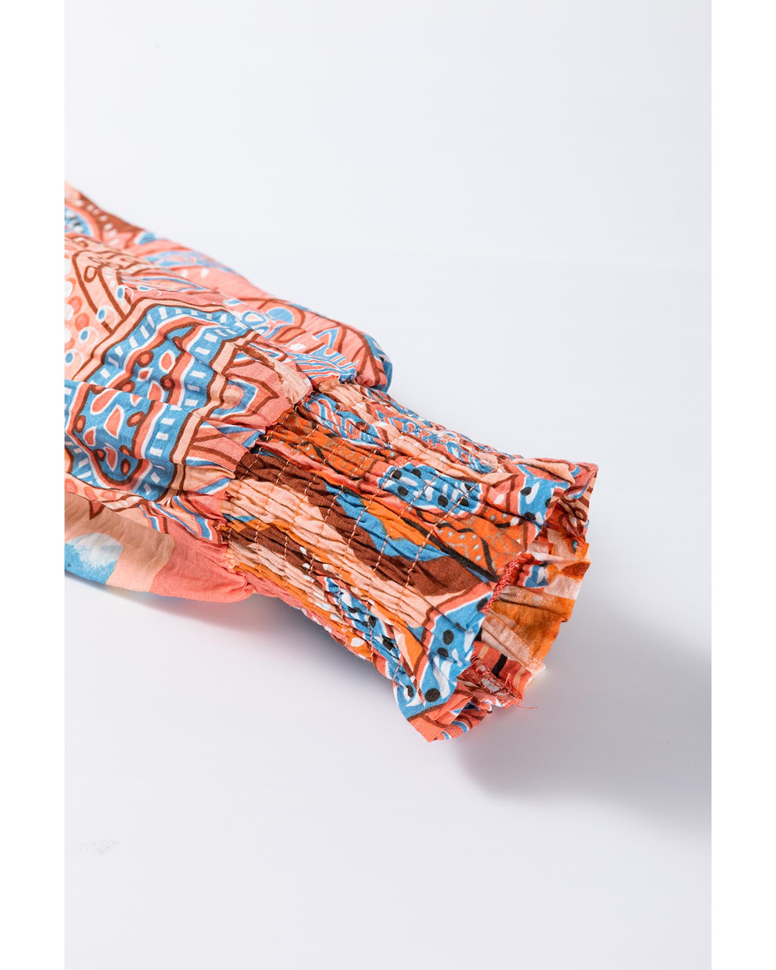 Orange Floral Print Shirred Cuff Buttoned Loose Shirt – L
