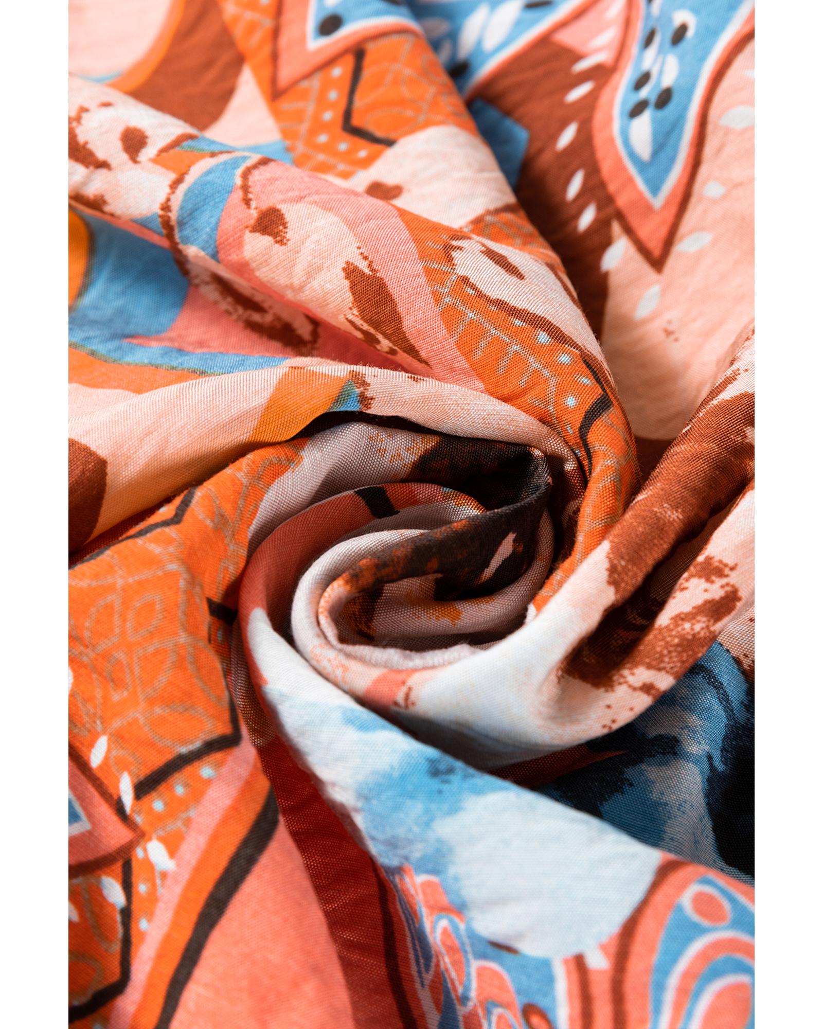 This loose-fitting shirt features a vibrant orange floral print and a versatile button-up design. It combines a chic and casual style, offering comfort and freedom of movement with its relaxed fit. The shirred cuffs add a stylish detail, making it suitable for various occasions.