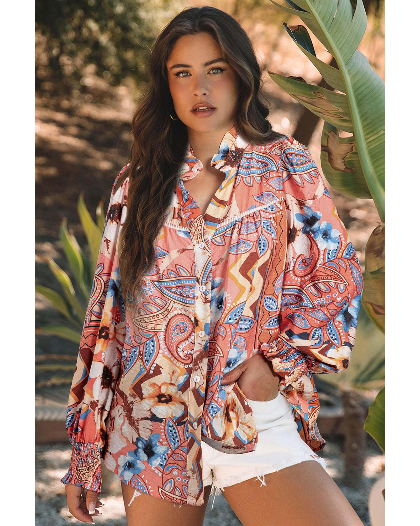 - Features include a floral print, shirred cuffs, and a button-up front for versatile styling