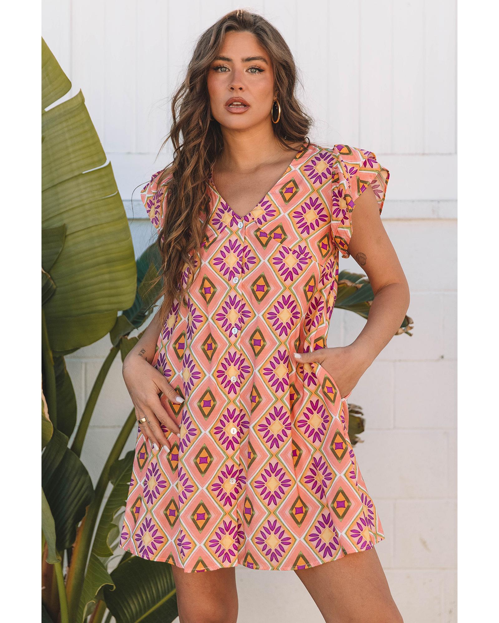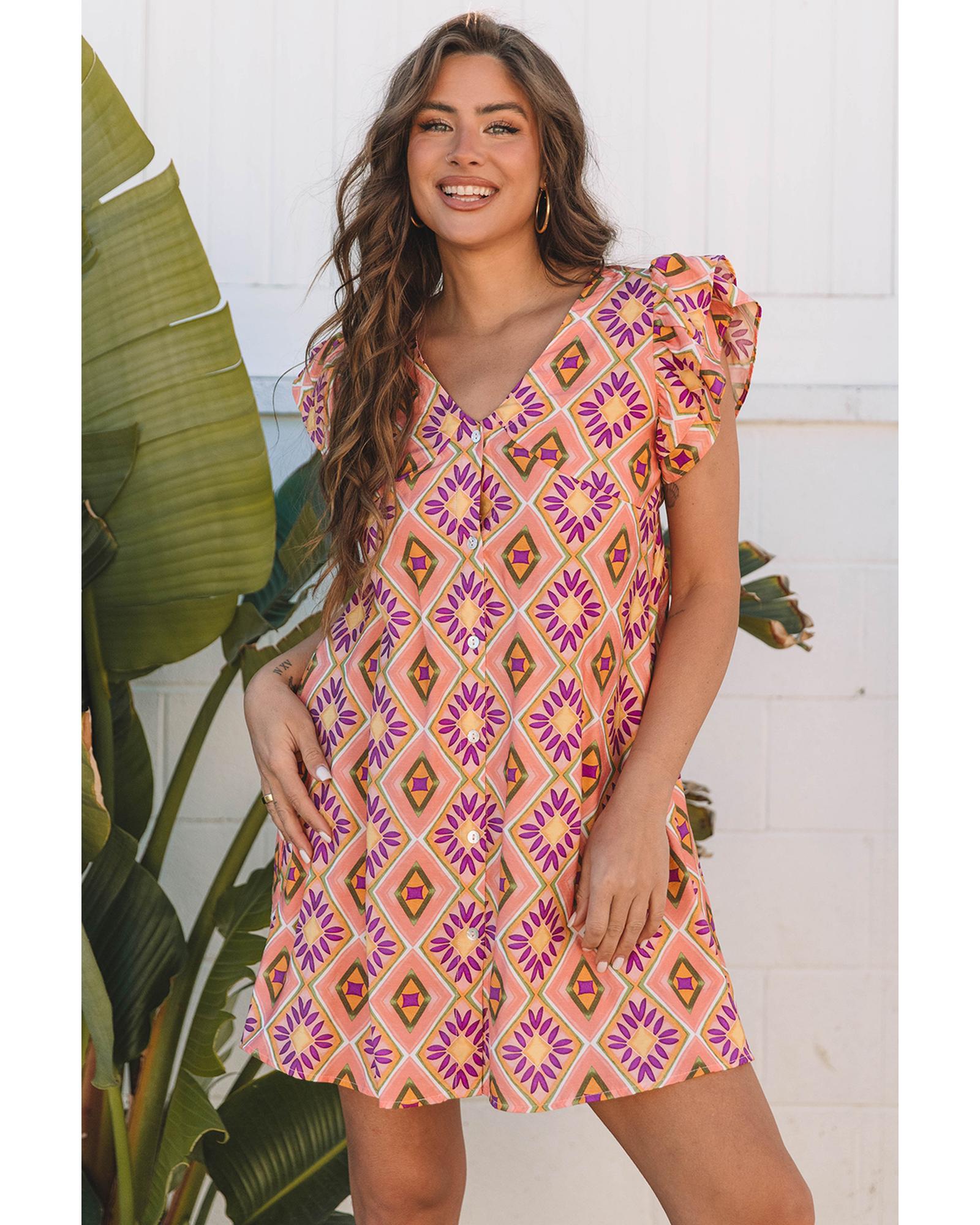 This mini dress features a stylish V neck design complemented by an elegant geometric floral pattern. The dress is crafted with a flattering fit and detailed with a buttoned front, adding a sophisticated touch. Ruffled sleeves provide a playful and feminine accent, making it suitable for various occasions.