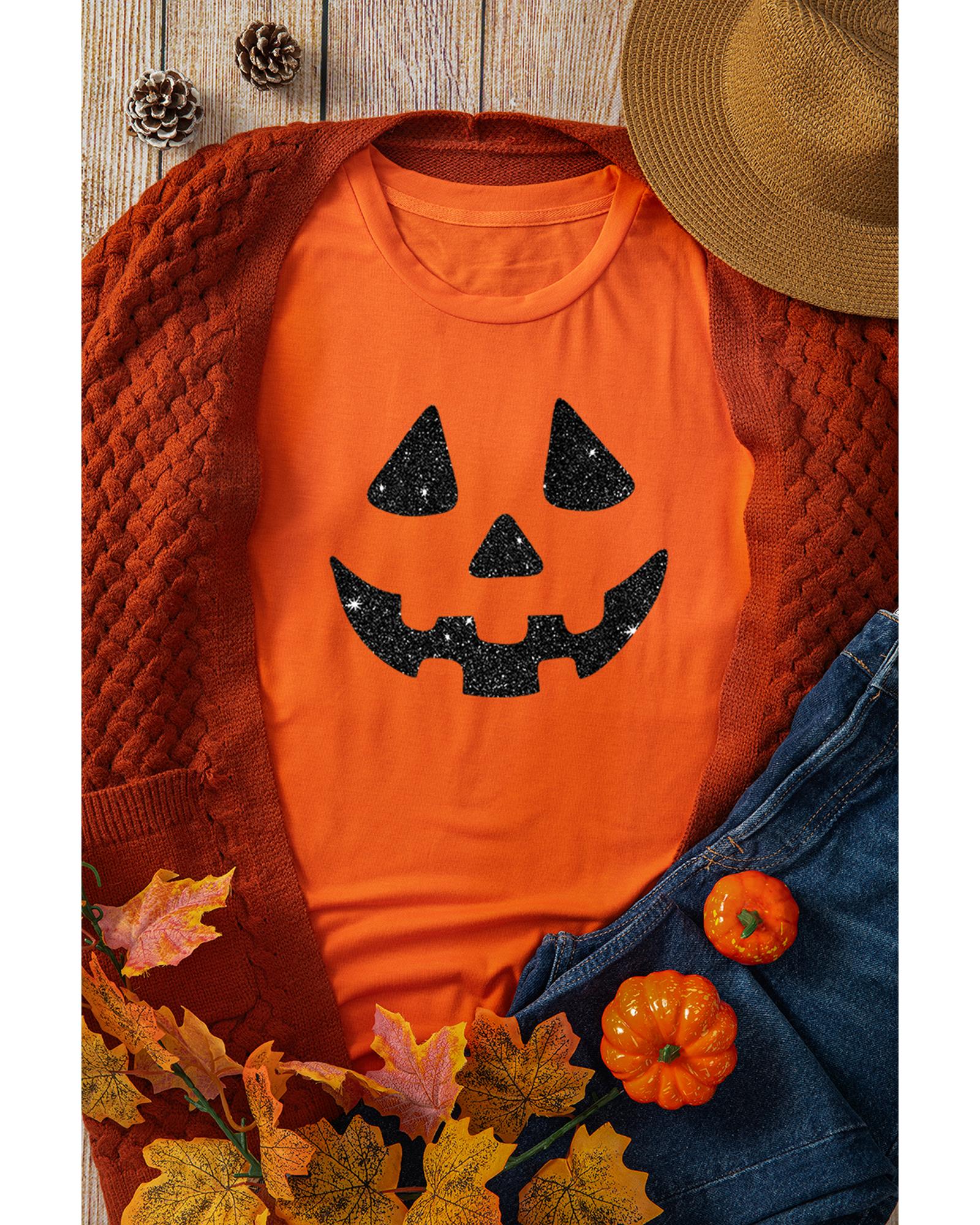 Package Content: 1 x Glittering Pumpkin Face Graphic Crewneck T-shirt