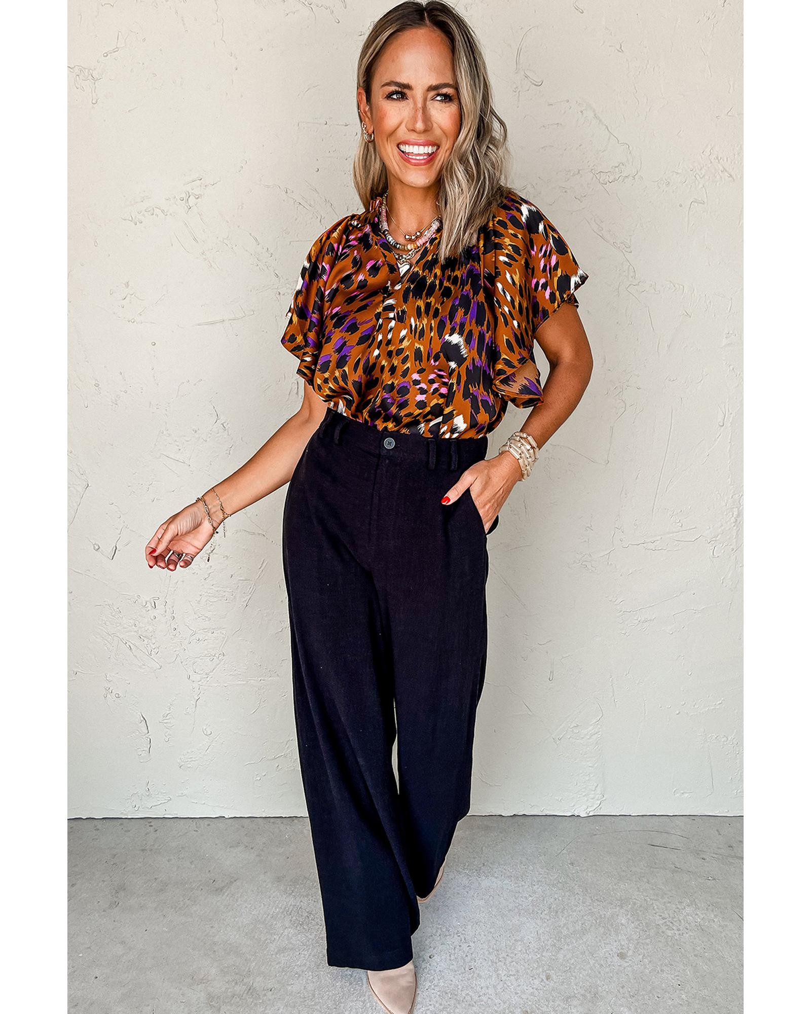 This stylish blouse features a trendy draped design with a vibrant orange leopard print, perfect for creating a fashionable and eye-catching look. It combines a flattering fit with comfortable flowing material, making it suitable for various occasions.