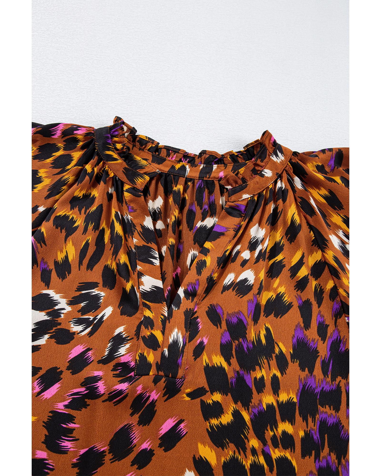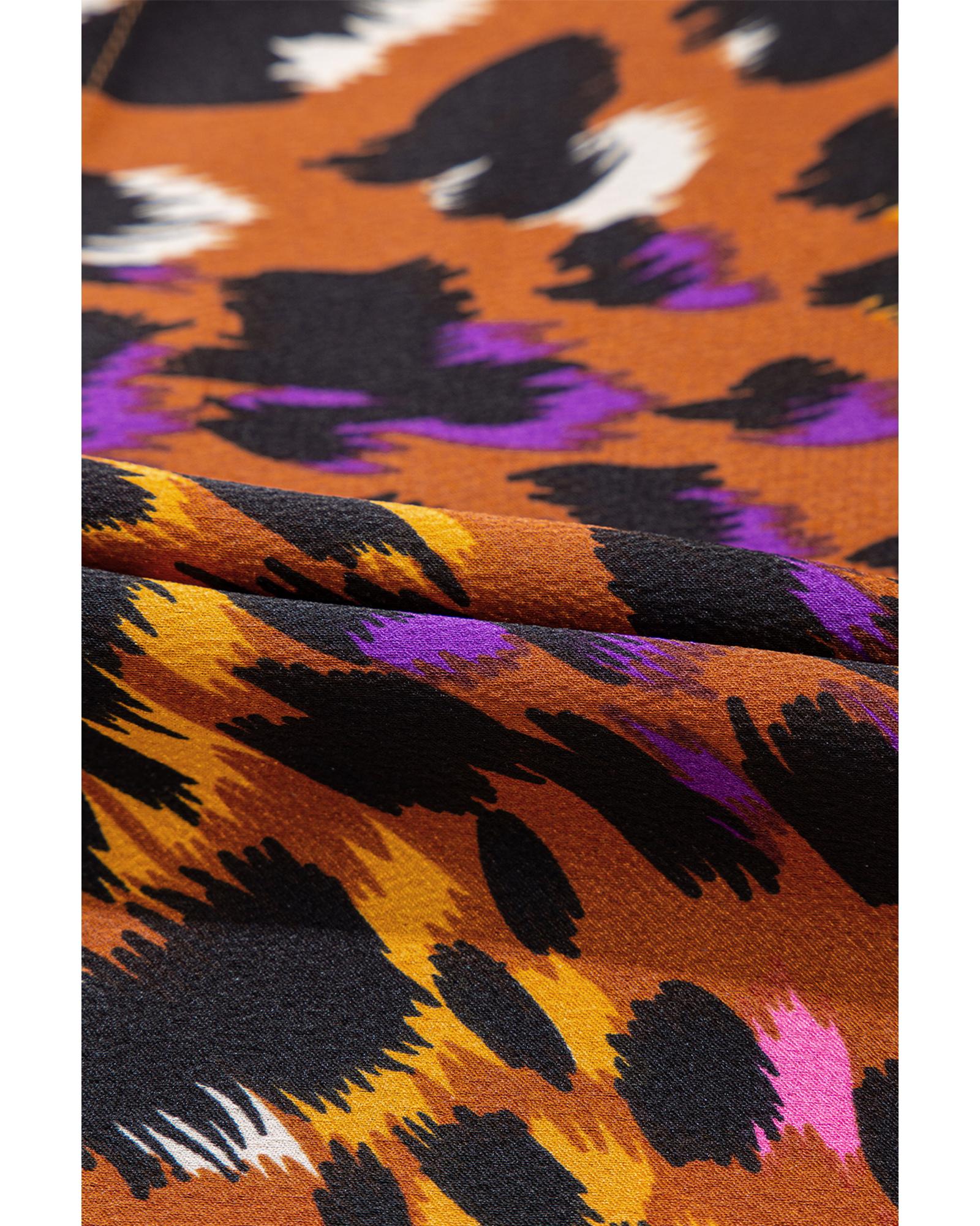 This blouse features a trendy draped design with a vibrant orange leopard print, combining a flattering fit with stylish details. It is designed with short capelet sleeves and a slit V-neckline, making it suitable for various occasions. The flowing material and back pleat add to its elegant silhouette.