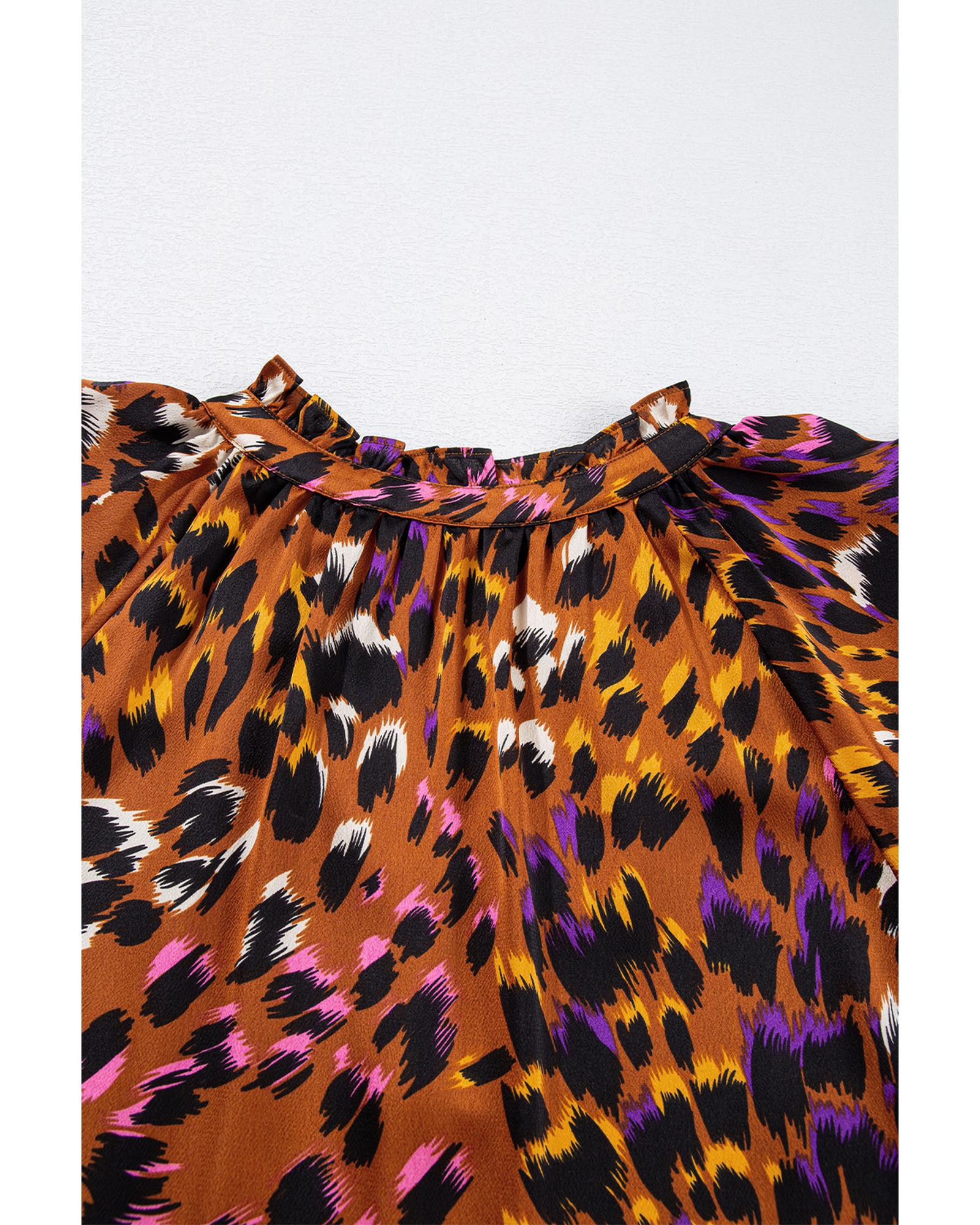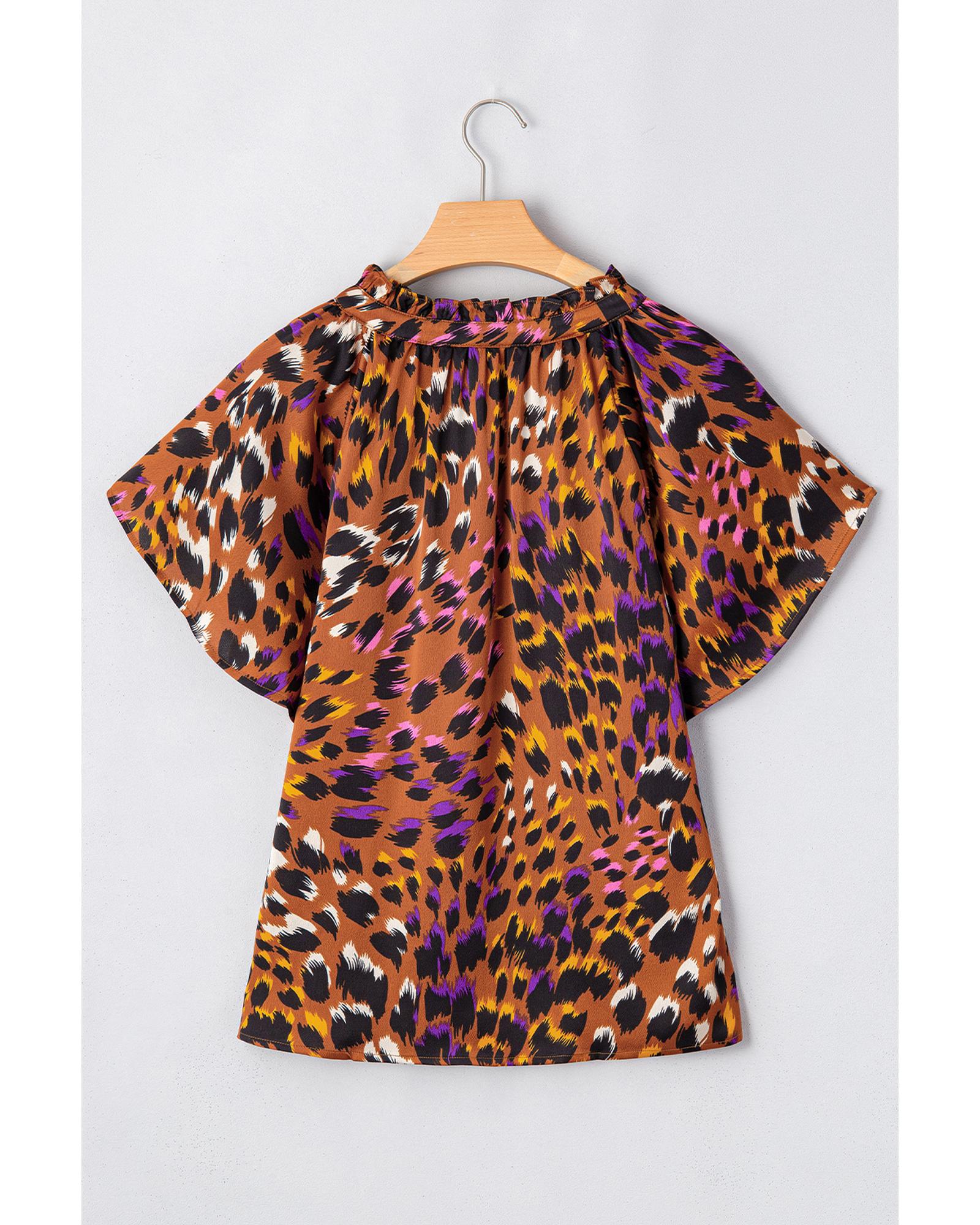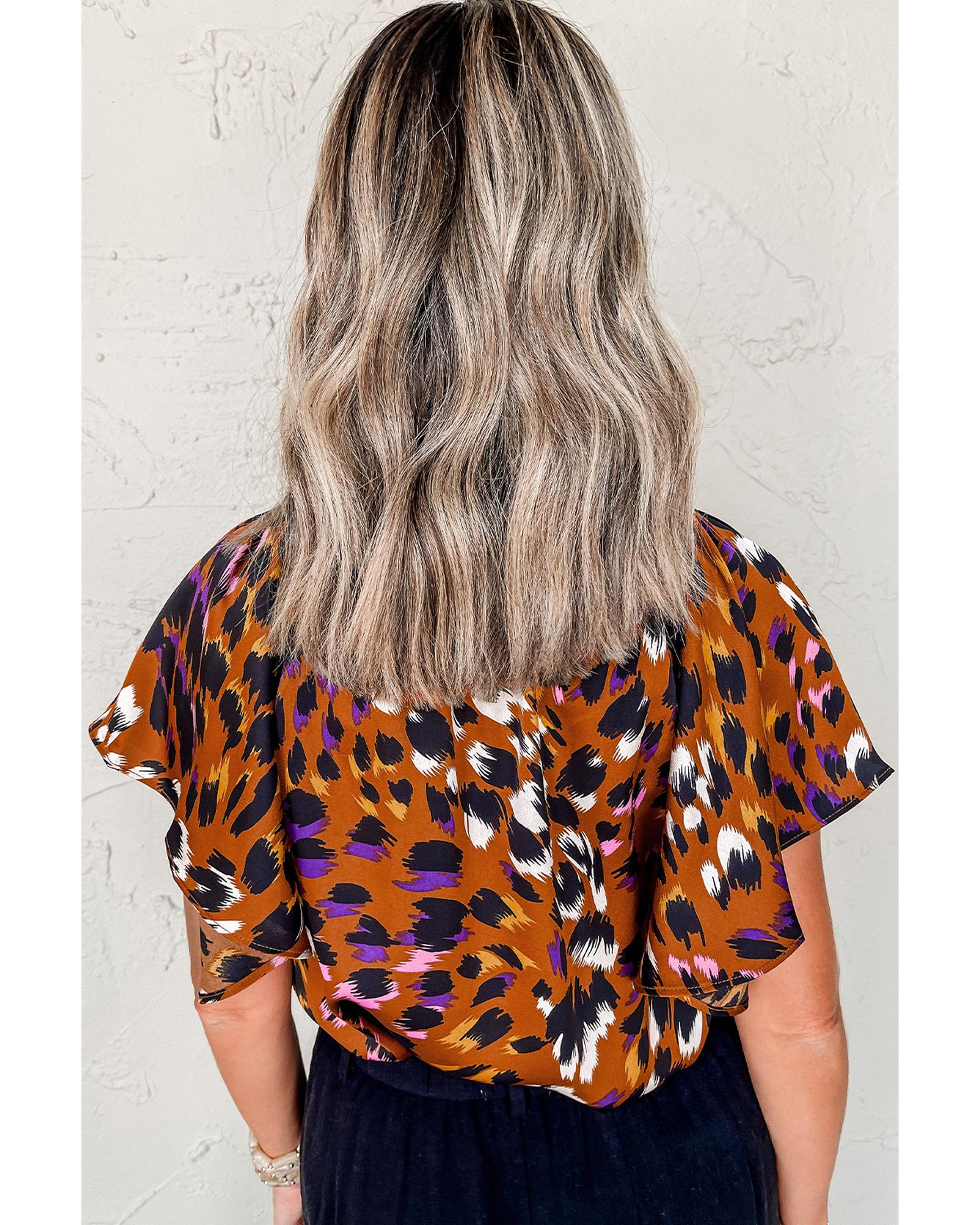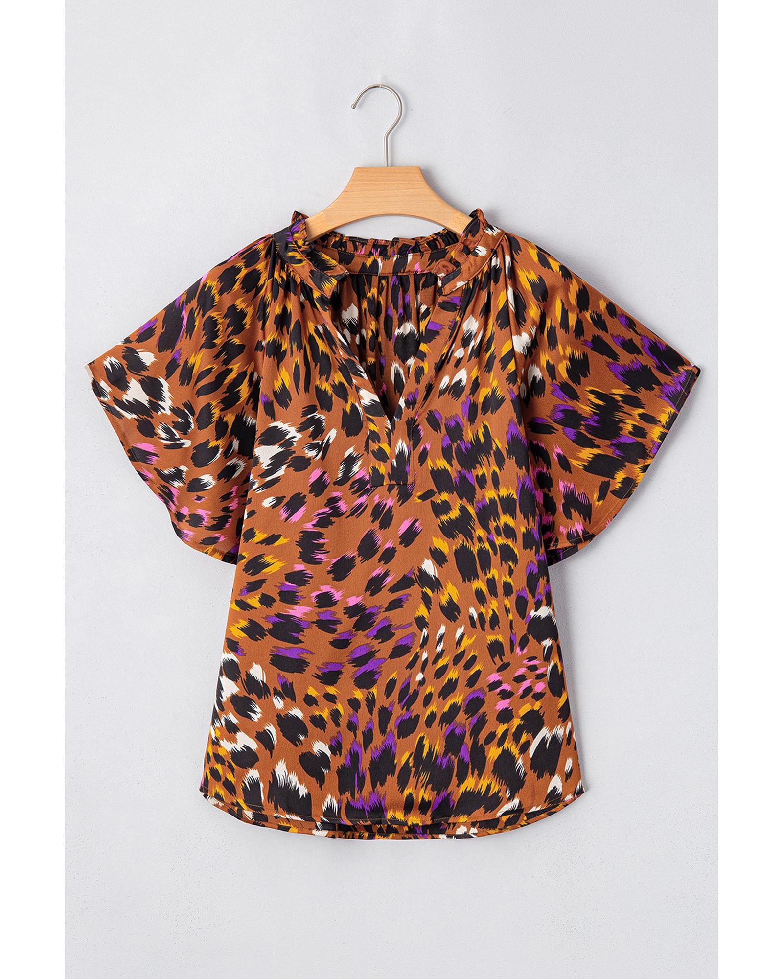 This stylish blouse features a trendy draped design with a vibrant orange leopard print. It combines a flattering fit with comfortable flowing material, making it suitable for various occasions. The short capelet sleeves and slit V-neck add elegant details to the overall look.