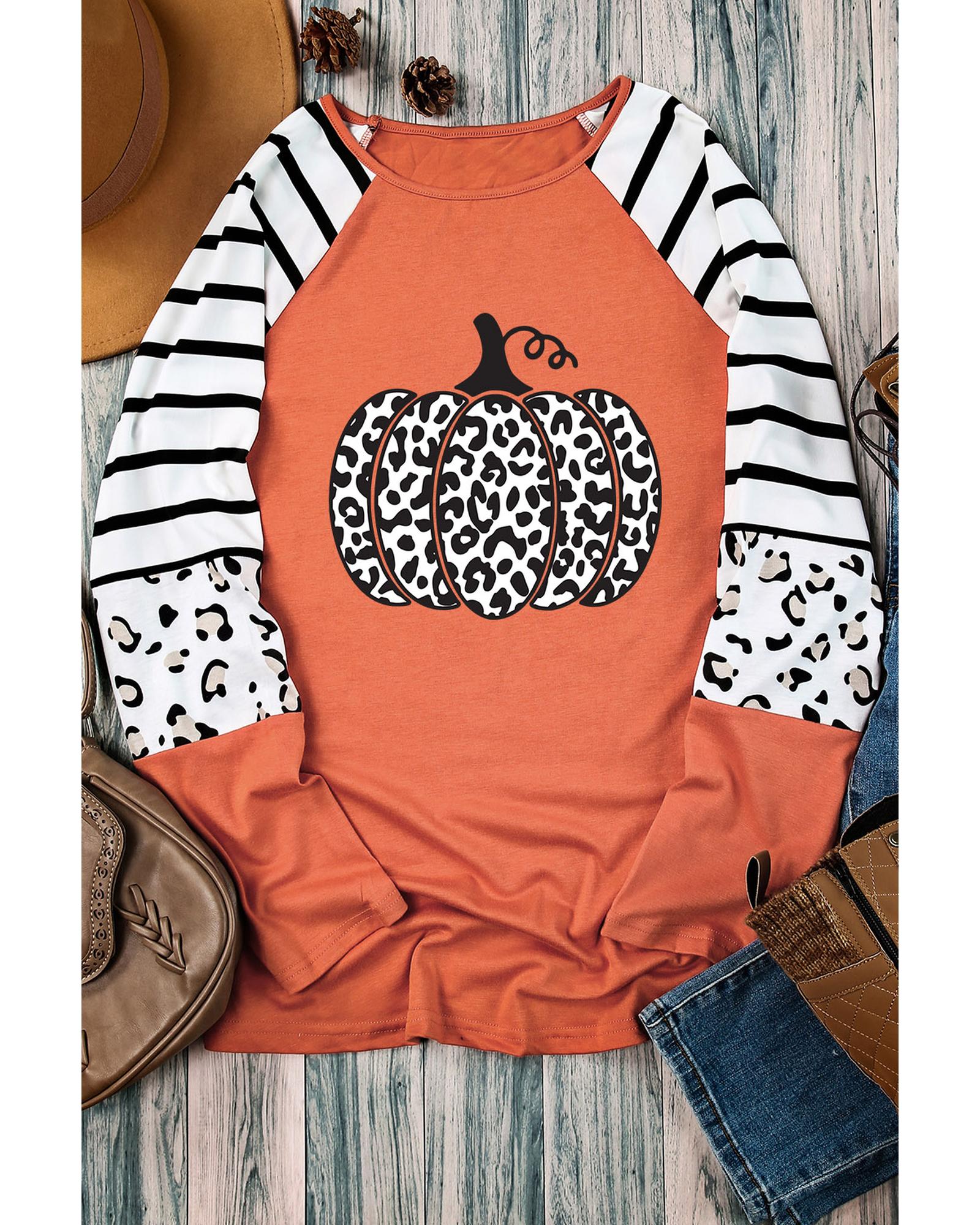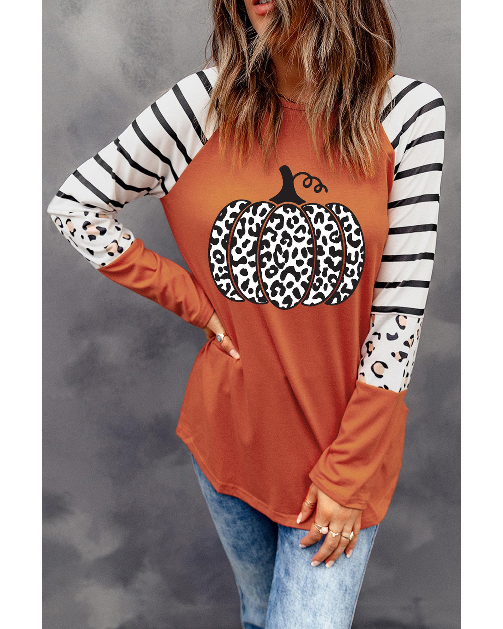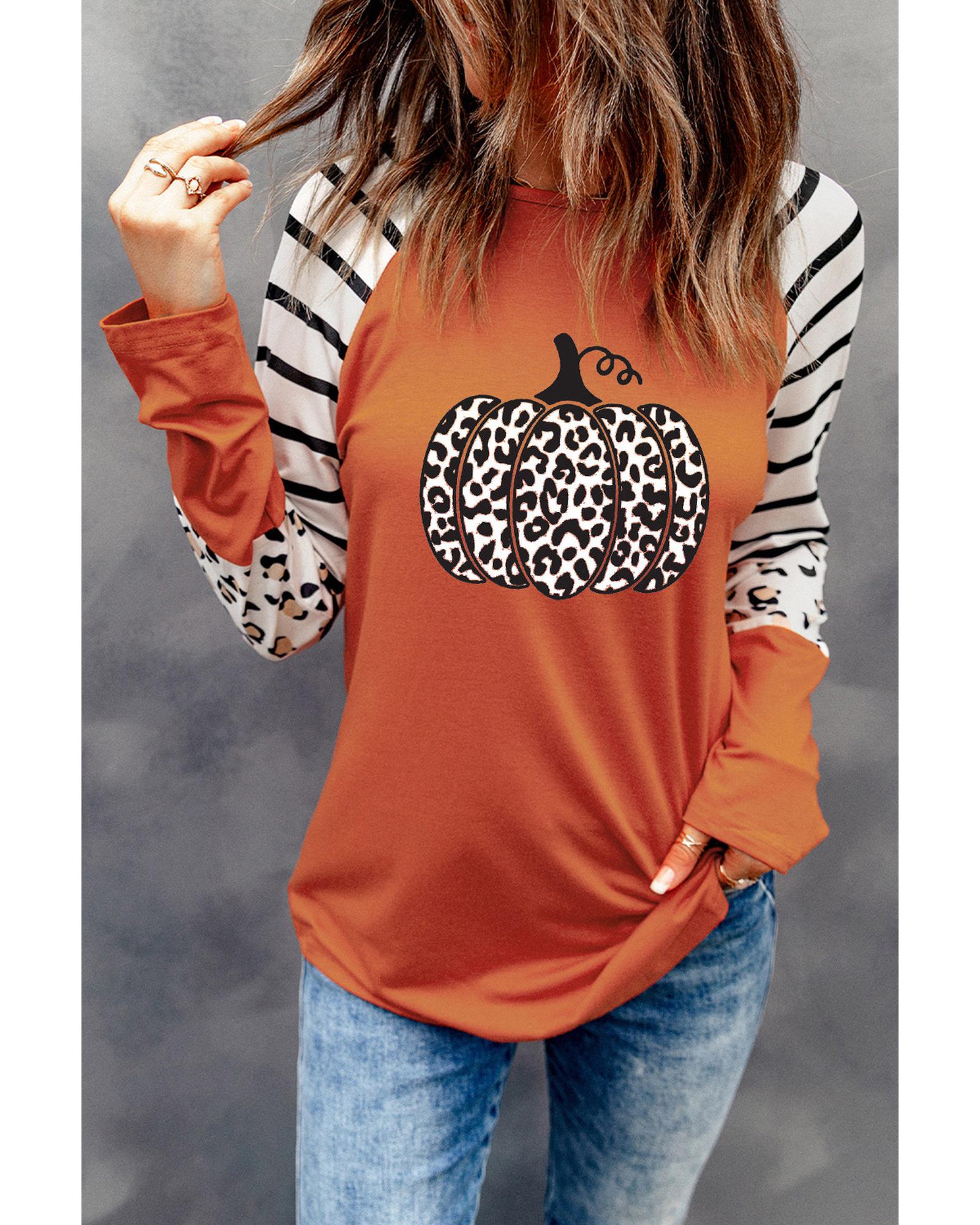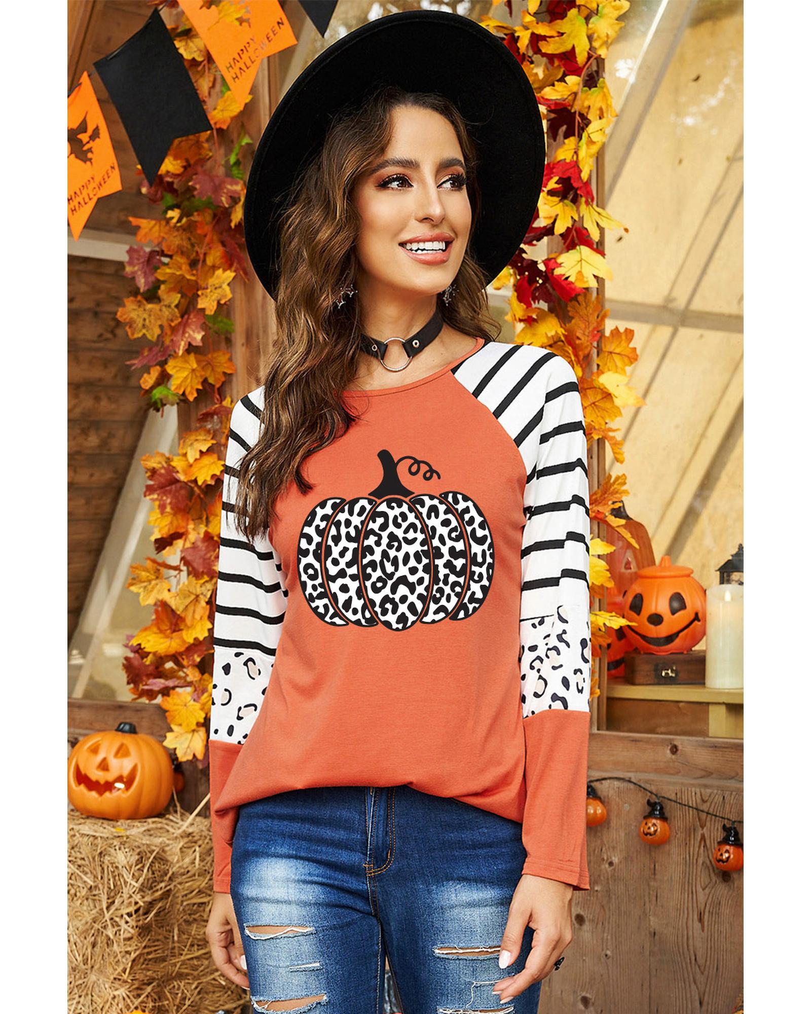 This long sleeve top features a bold leopard pumpkin graphic design with contrasting stripes, offering a stylish and trendy look. Made from high-quality materials, it provides comfort and durability. The long sleeves add extra coverage and warmth, making it suitable for various casual occasions.