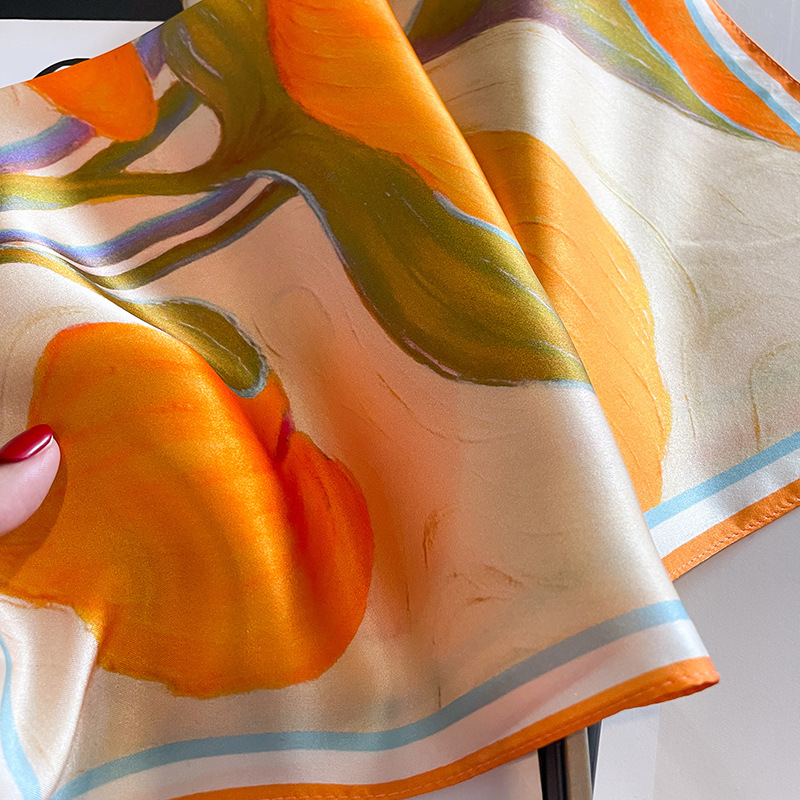 Orange Lotus Leaf Women’s Floral Print Mulberry Silk Shawl, 53cm (Style 5)