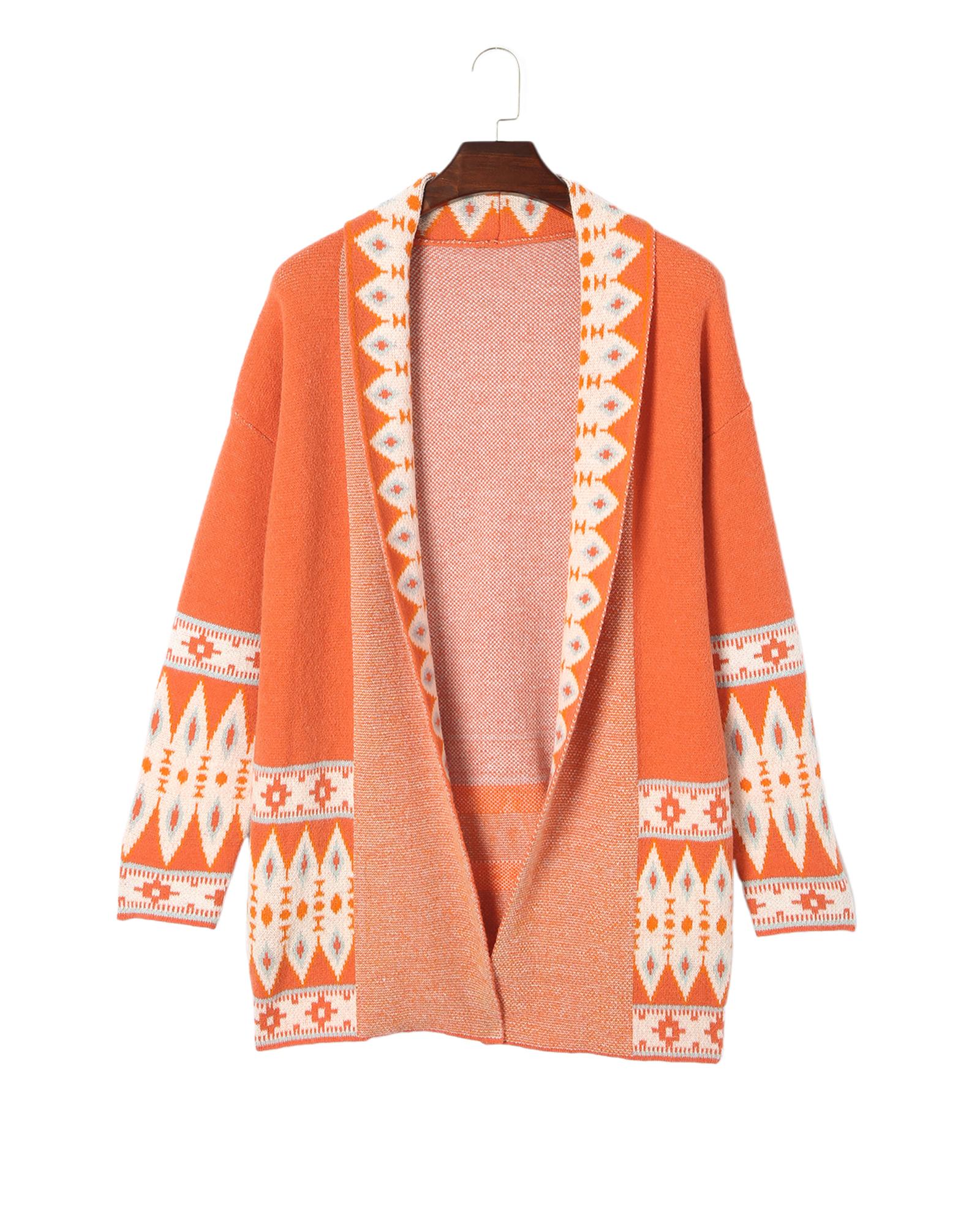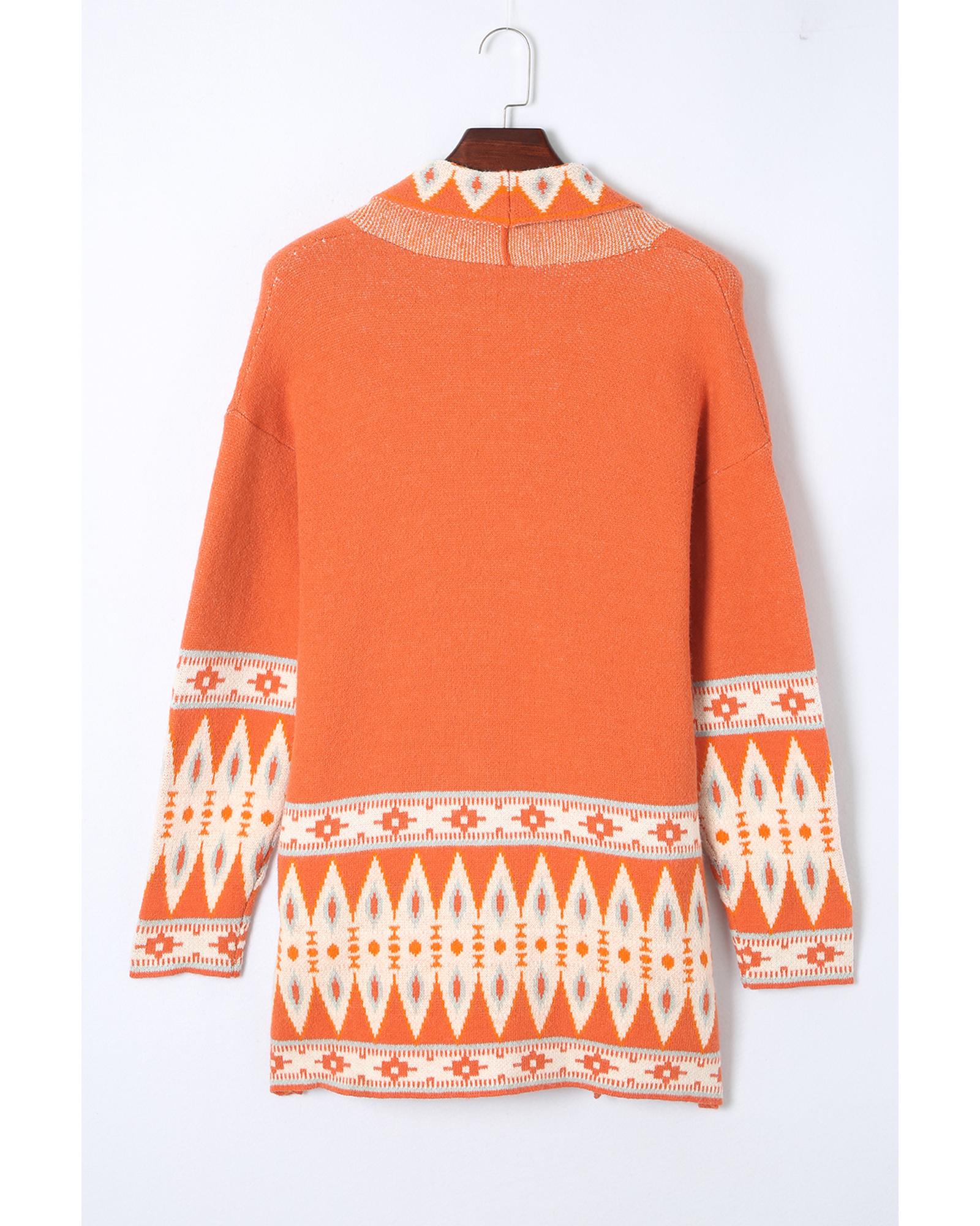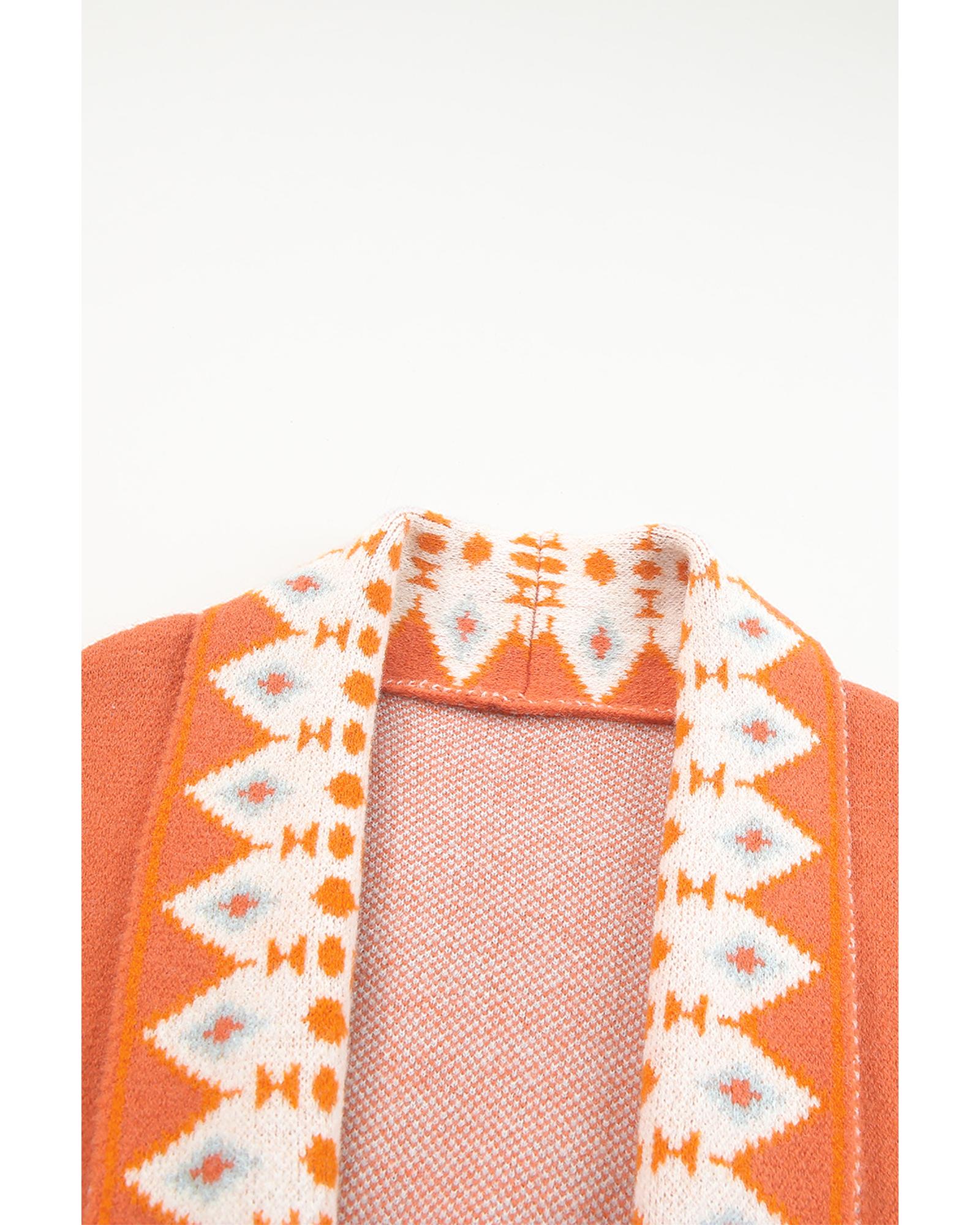 Orange Printed Aztec Print Open Front Knitted Cardigan – M