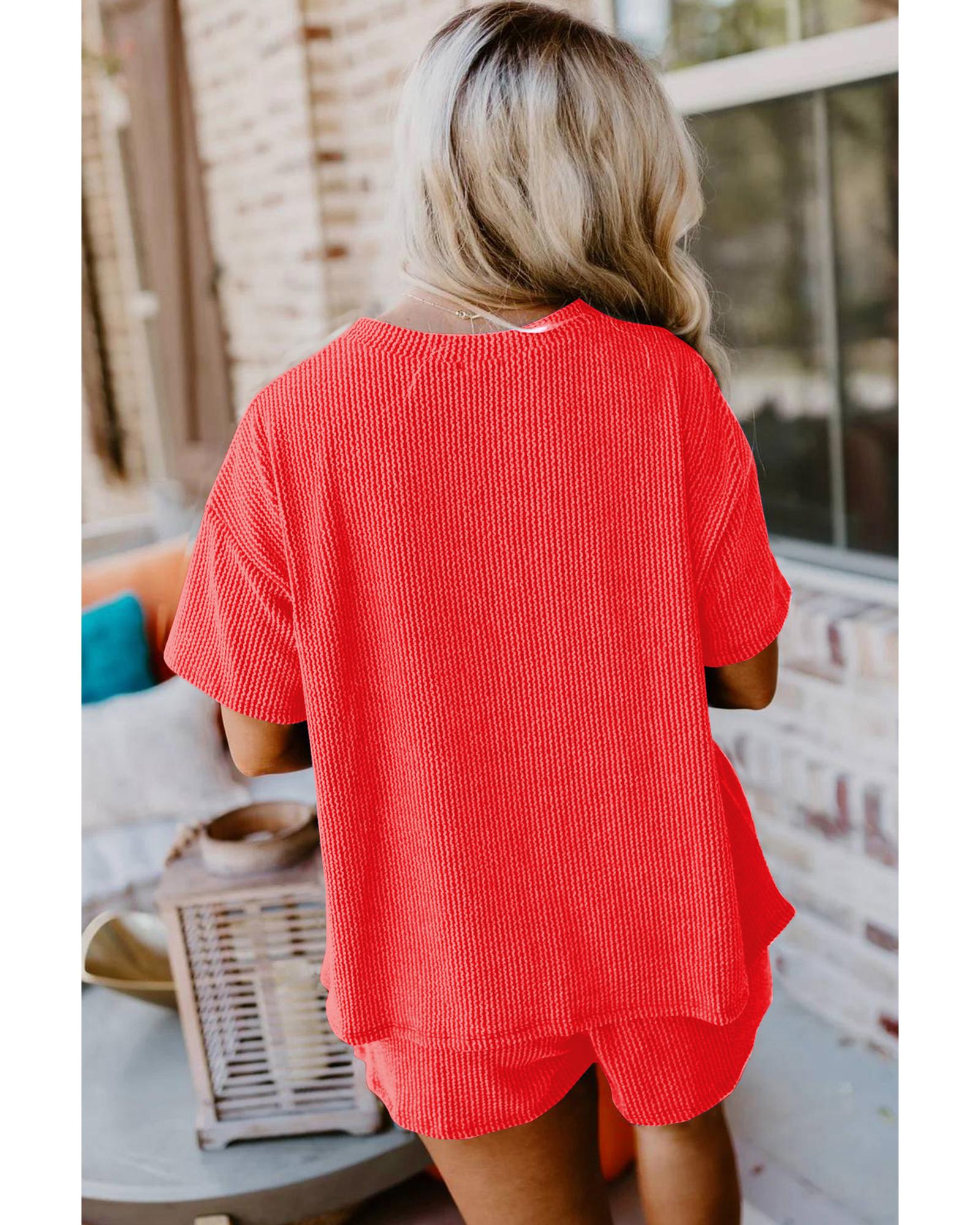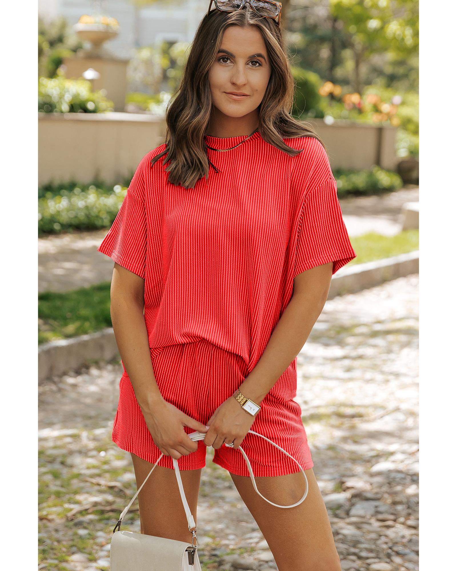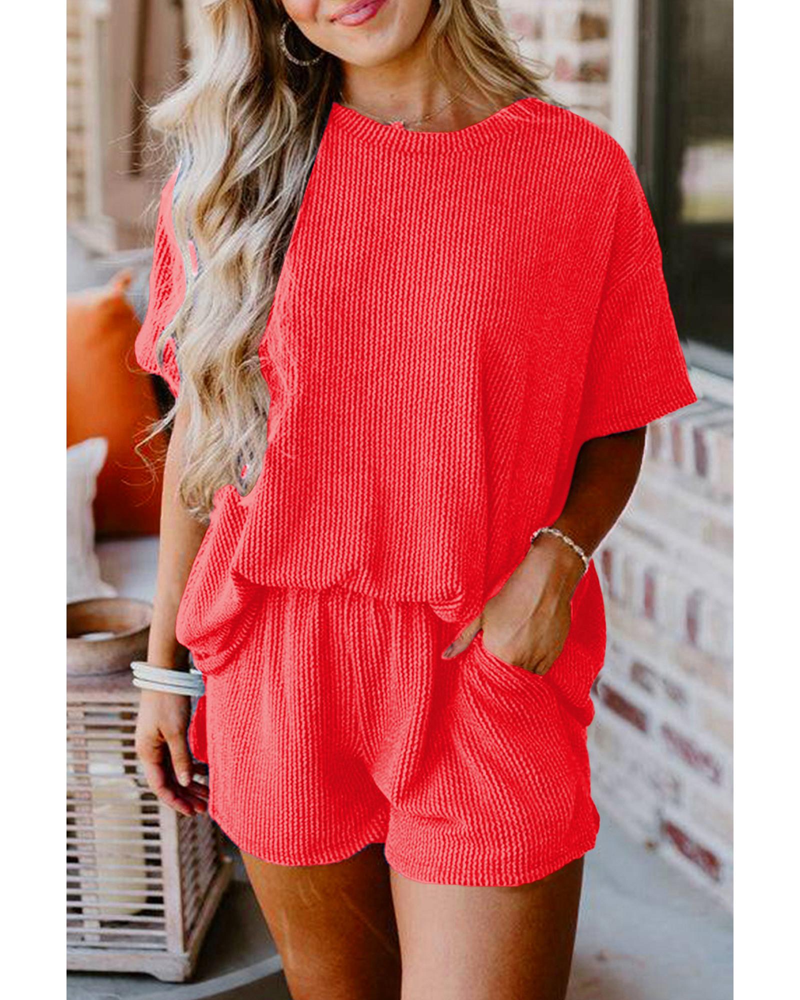 This ribbed textured knit set offers a stylish and comfortable option for casual wear or exercise. Designed with a loose fit, it provides ease of movement and a trendy look. The set includes a matching tee and shorts that can also be worn separately, making it versatile for different outfits.