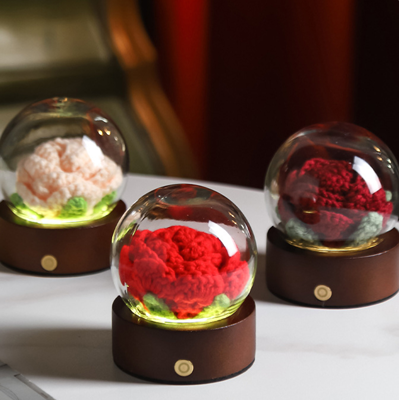 - 1 x Crochet flower LED night light with glass dome and wooden base