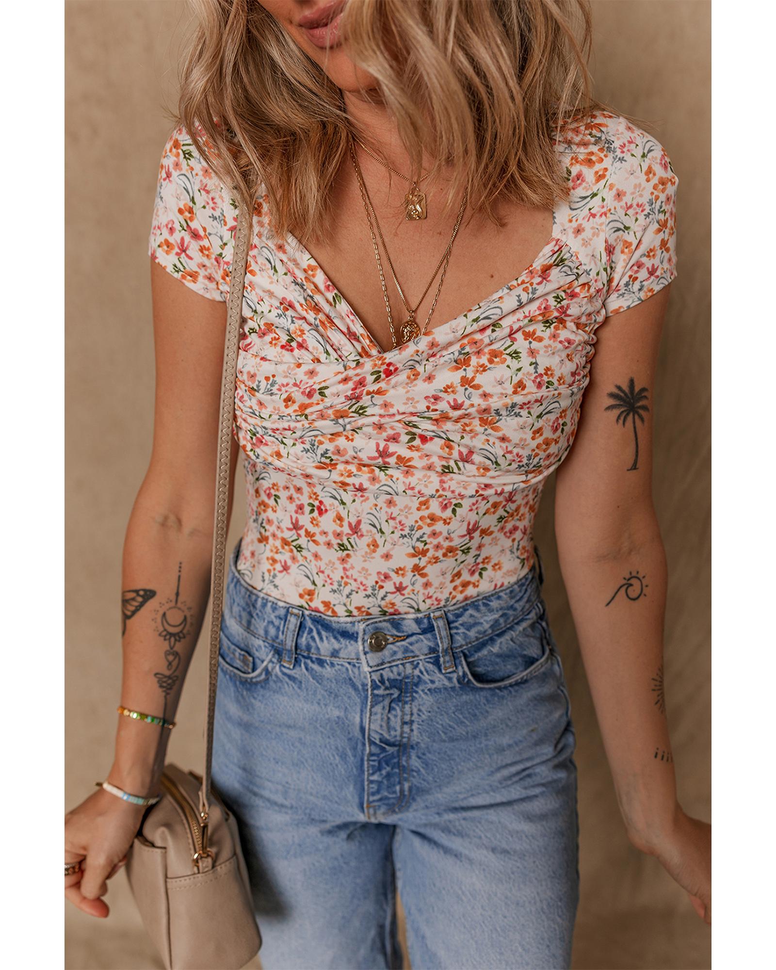 This floral short sleeve bodysuit features a ruched sweetheart neckline and a slim fitted design, making it an ideal choice for a romantic summer look. The floral print adds a touch of elegance and femininity to your outfit.