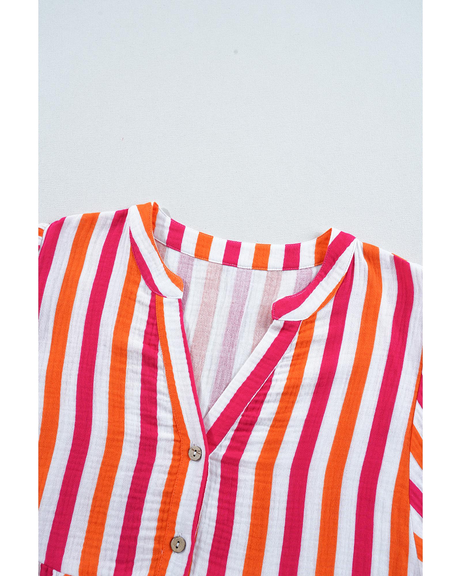 Orange Stripe Balloon Sleeve Notched V Neck Buttoned Front Blouse – S