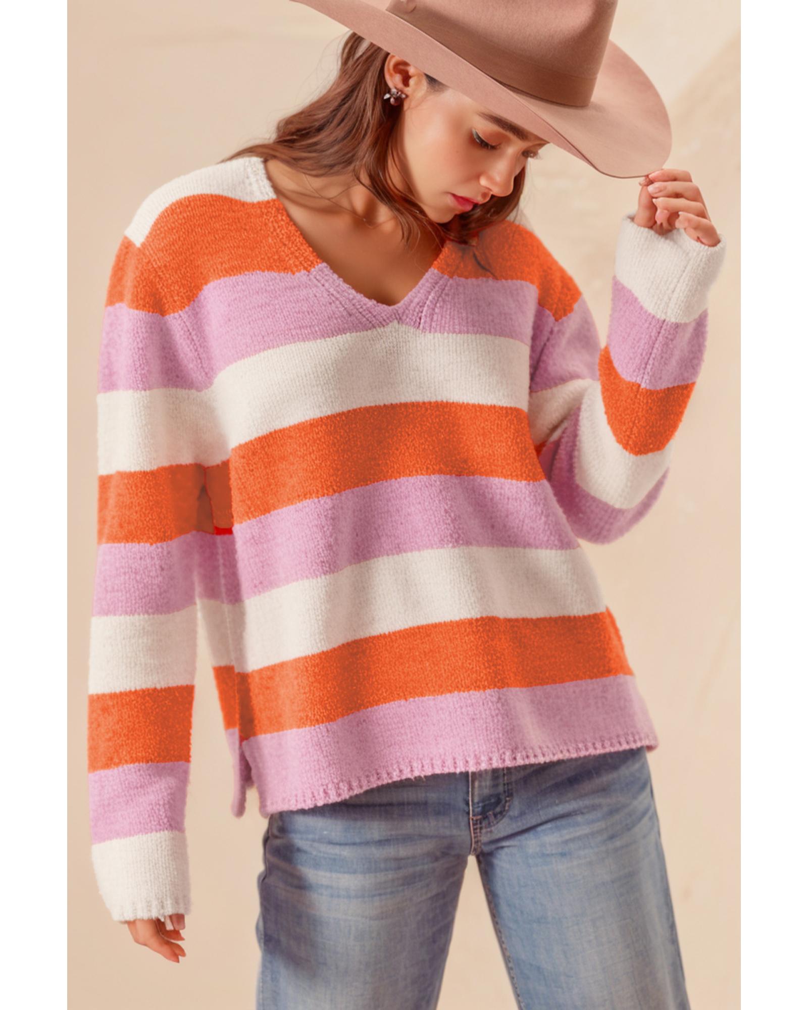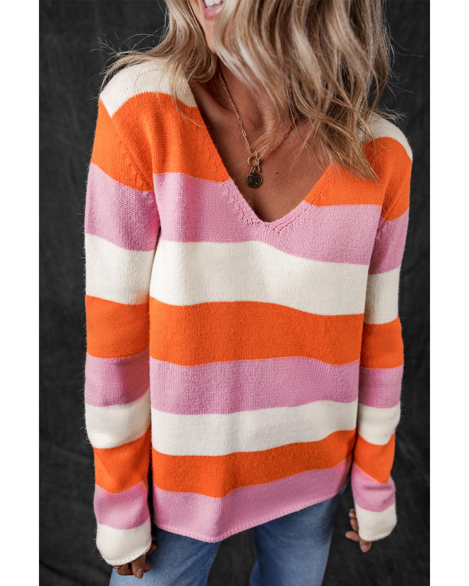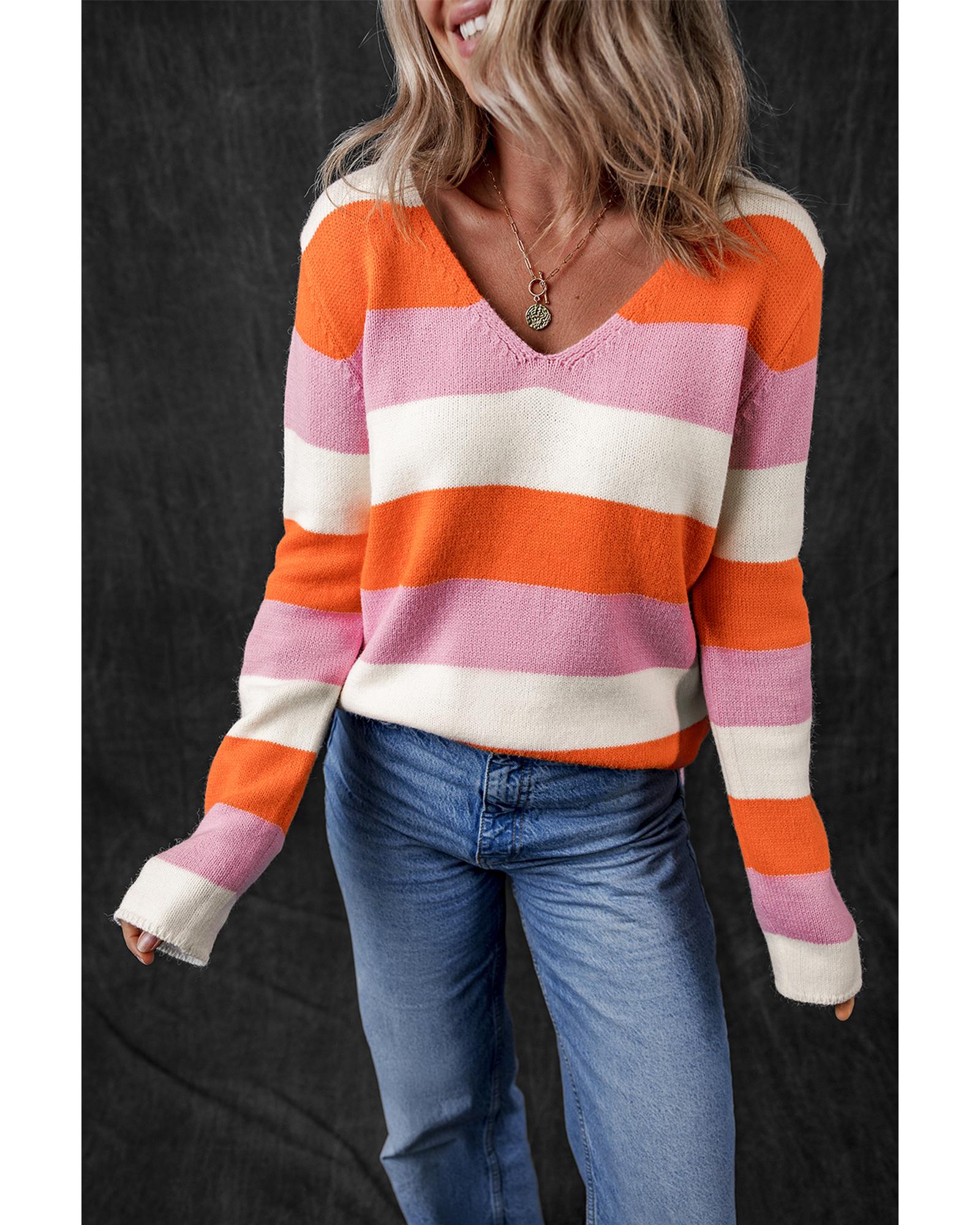Orange Stripe Colorblock V Neck Casual Sweater – L