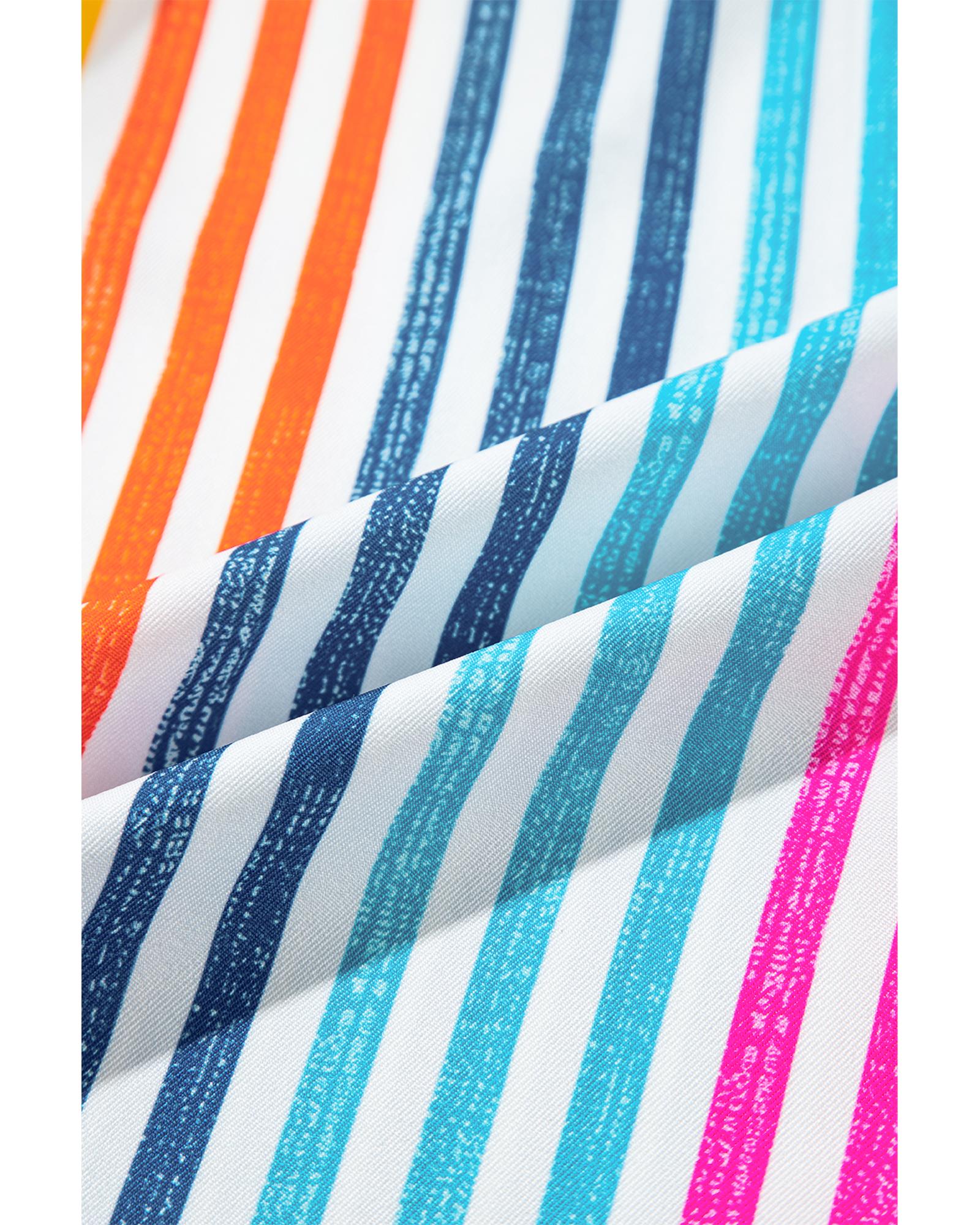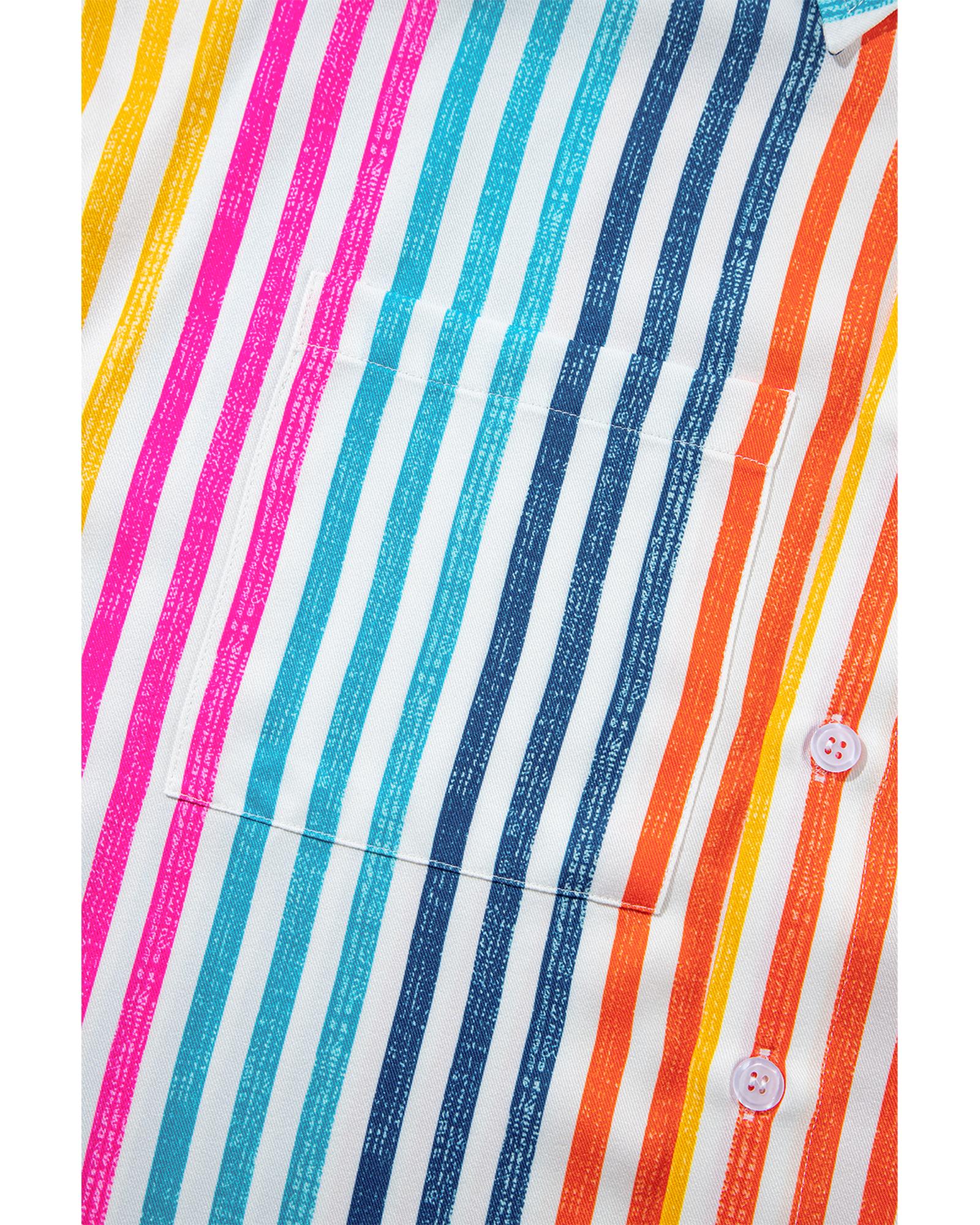 This multicolor drop shoulder shirt features a stylish striped design with a relaxed, loose fit. It is suitable for various casual occasions and offers a comfortable wearing experience. The shirt is designed to be unisex and available in multiple sizes to accommodate different preferences.