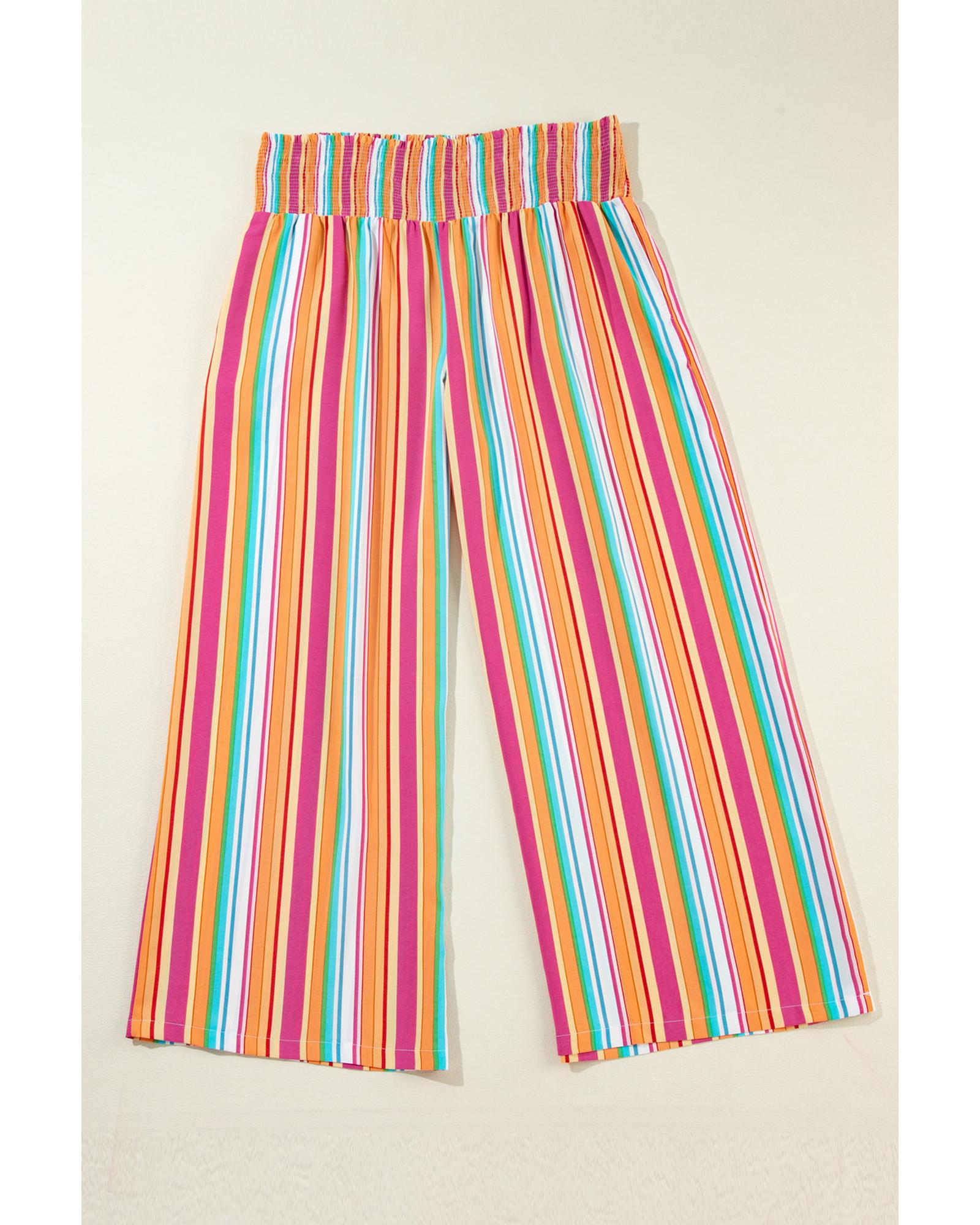 This pair of plus size boho-style pants features a relaxed fit with a trendy laid-back design. The vibrant vertical stripes add a pop of color, while the smocked waistband ensures a comfortable fit. Perfect for casual outings or stylish lounging, these pants combine fashion and comfort effortlessly.