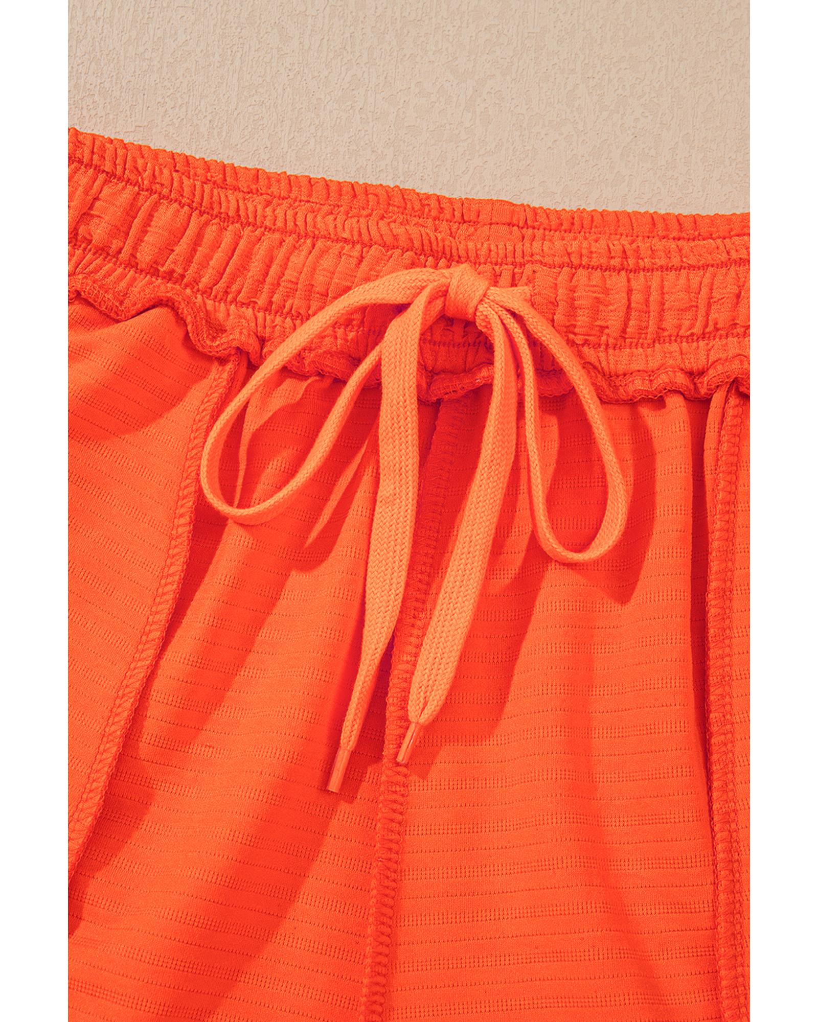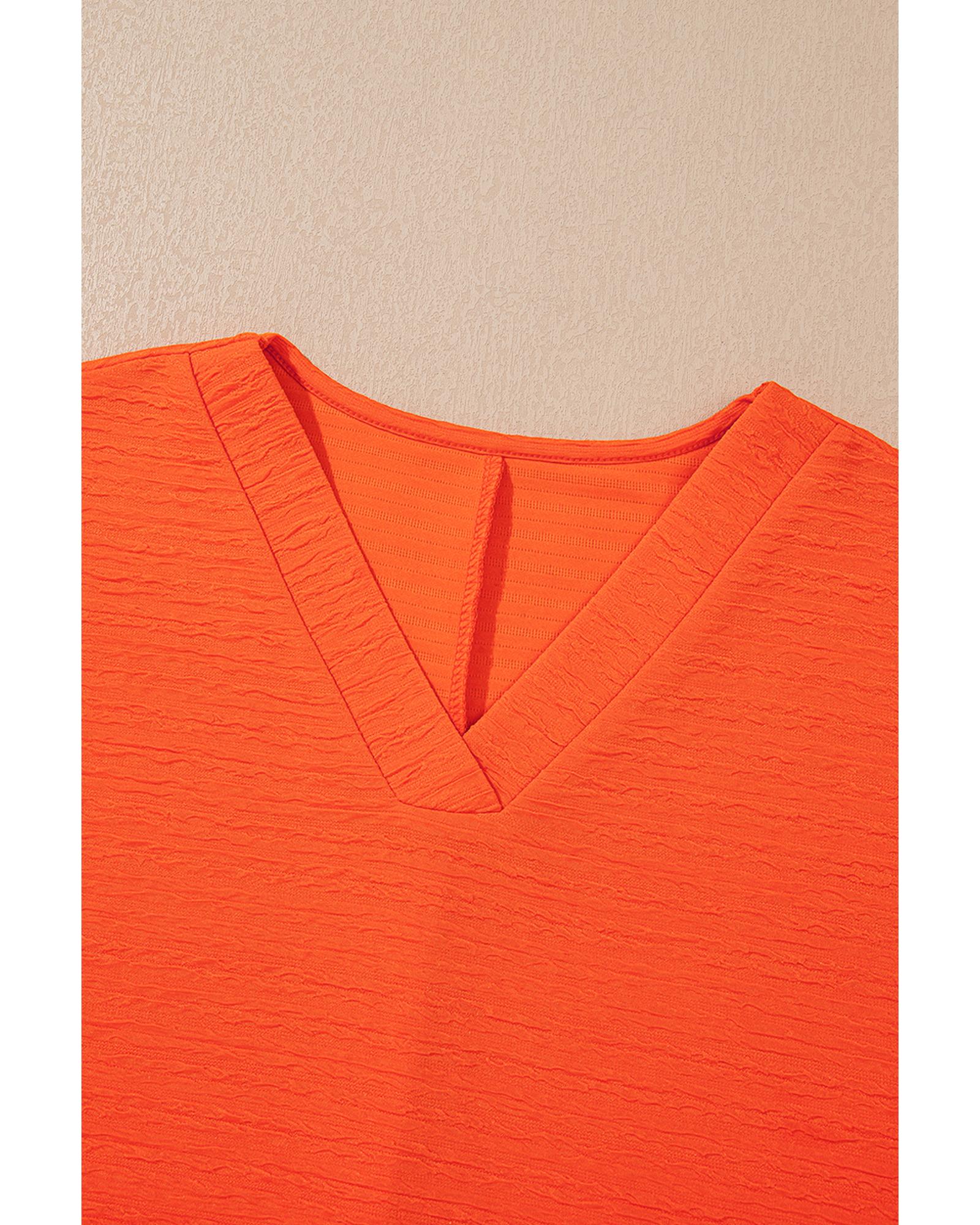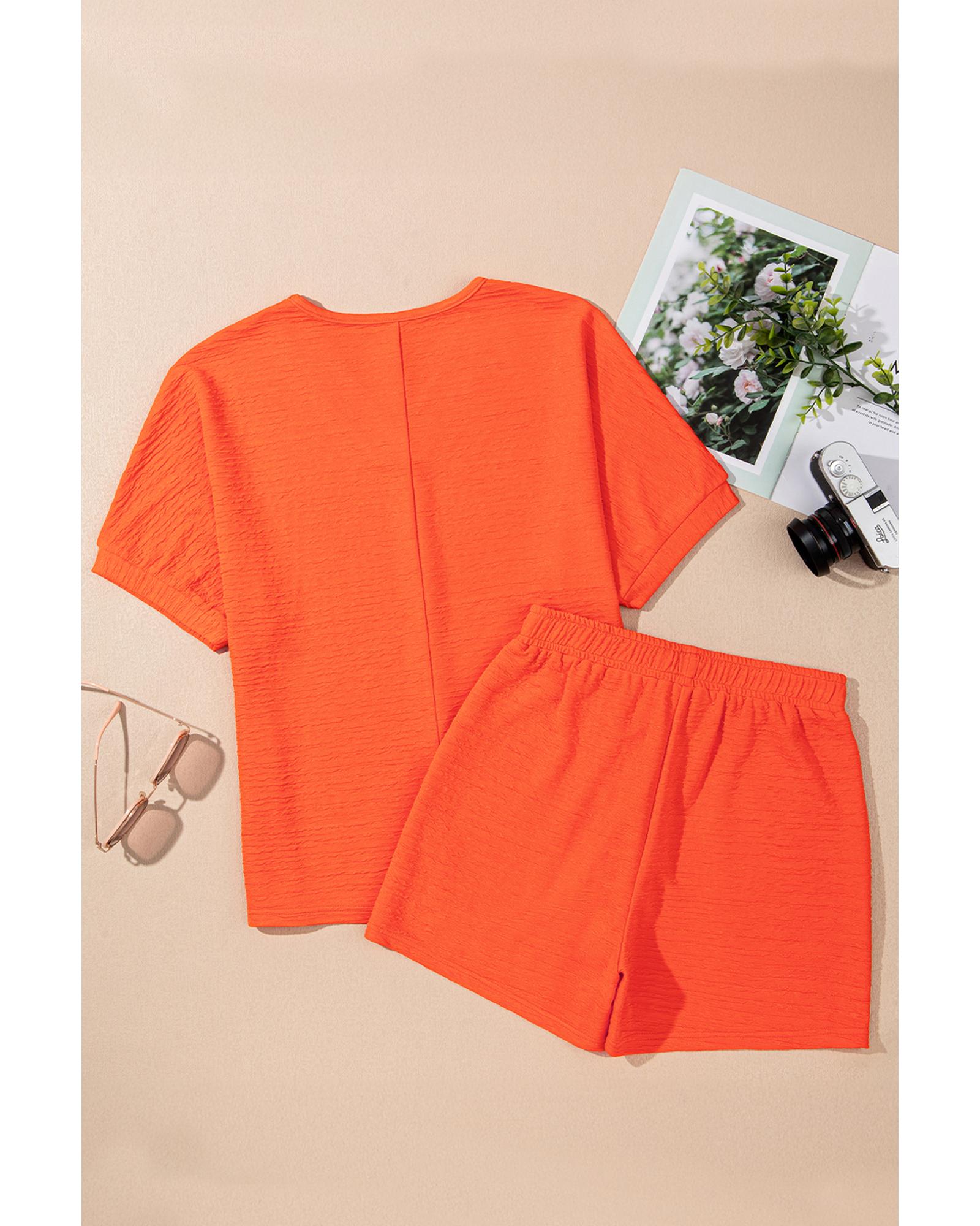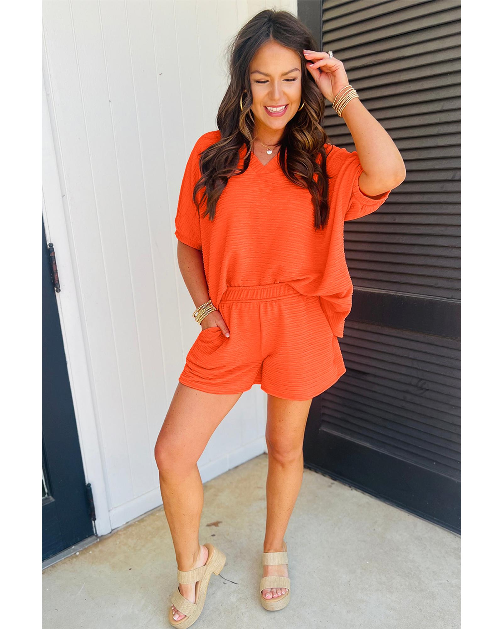 This orange textured V neck T-shirt and shorts set offers a stylish and comfortable option for daily and casual wear. The set features a feminine V neckline and an elastic waistband for a perfect fit, making it both fashionable and practical.