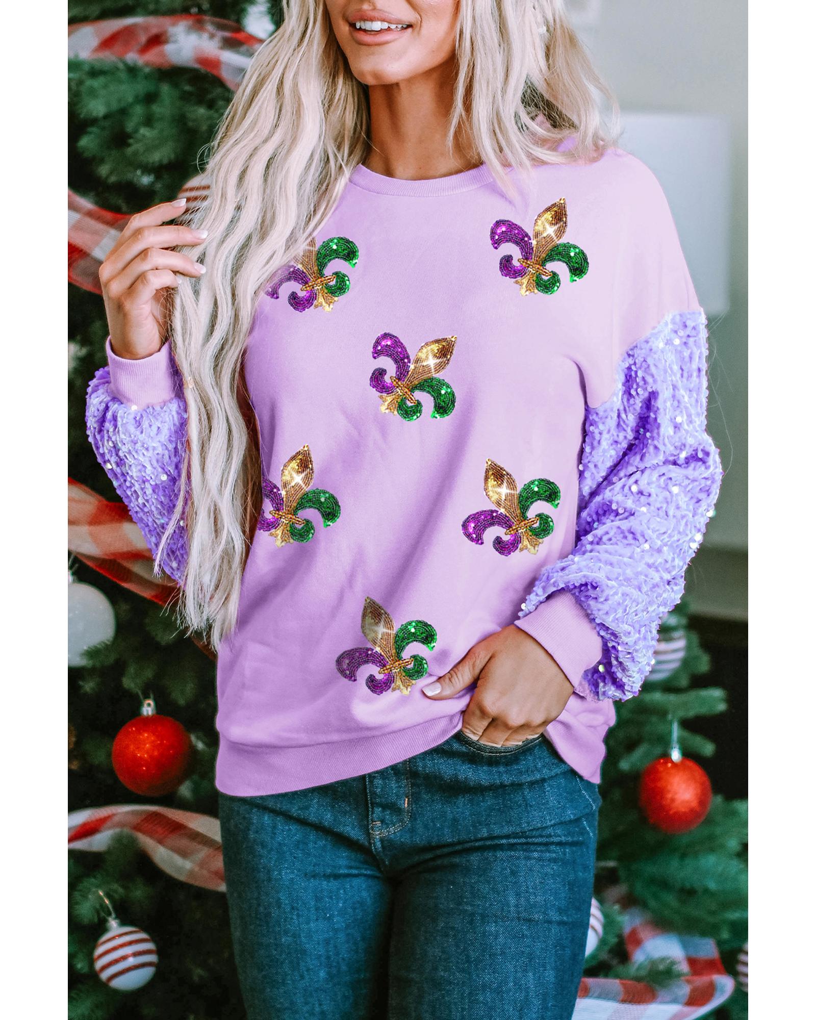 Orchid Petal Sequin Patchwork Long Sleeve Fleur de Lis Patched Pattern Top – S