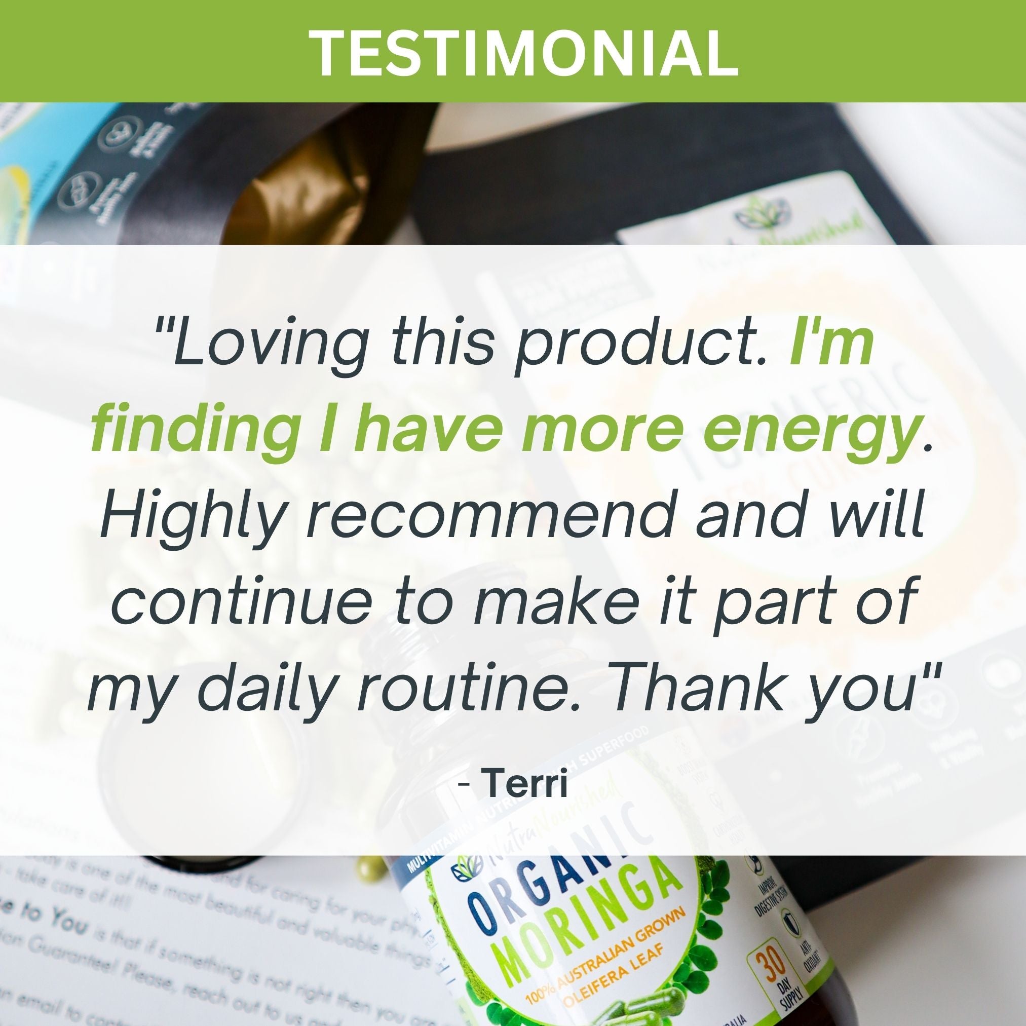 This product consists of organic Moringa leaf capsules made from 100% pure Australian-grown Moringa leaf powder. It is a natural, vegan supplement free from fillers, chemical additives, preservatives, artificial colors, and flavors. The capsules are designed to support overall health and well-being with a focus on natural ingredients.